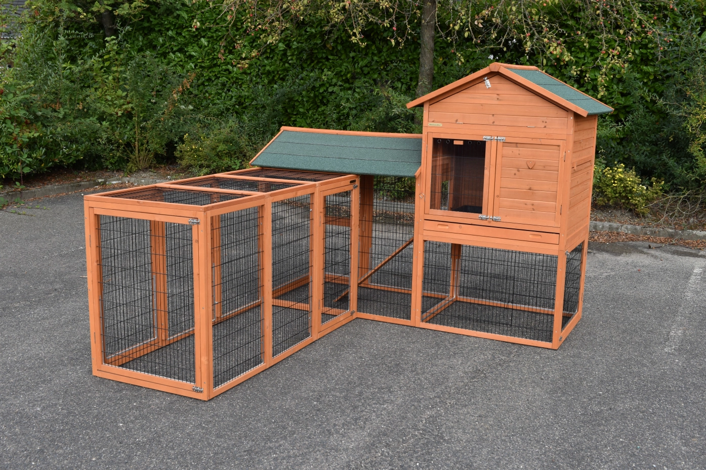 Het konijnenhok Prestige Large is provided with 2 runs, which are placed in a corner unit. A beautiful hutch, which is suitable for 2 till 4 rabbits.