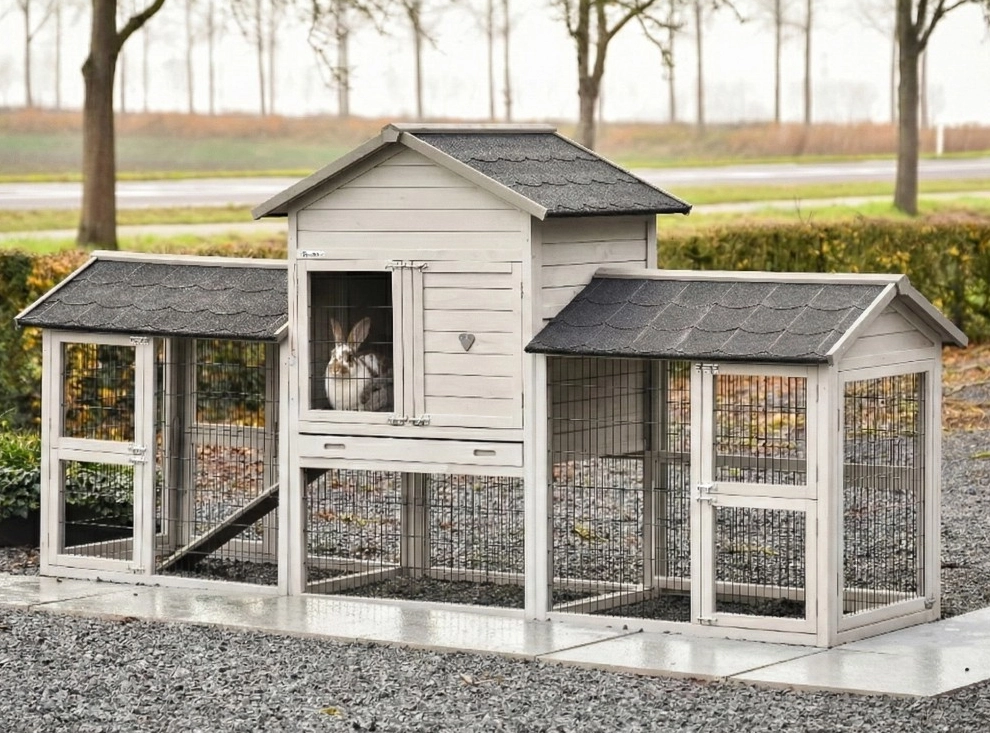 The rabbit hutch Prestige Medium is extended with 2 runs Space Medium. The hutch has chewprotection and many, large doors with double doorlocks. The hutch stands on rubber feet, has a practical storage attick, a lockable sleeping compartment and a removable tray. The maximal dimesions are 299x90x150cm. With a minor adjustment is it possible to build the hutch in mirror image.
