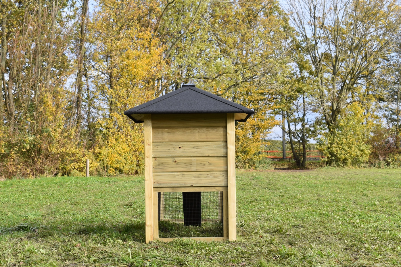 - The doghouse has black plastic feet, making it easier to move, and the hutch is better protected against moisture