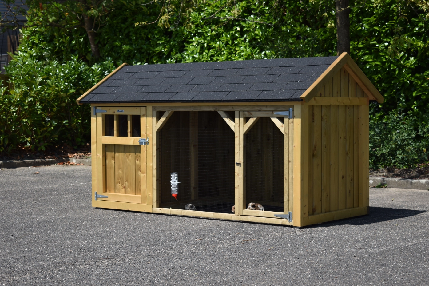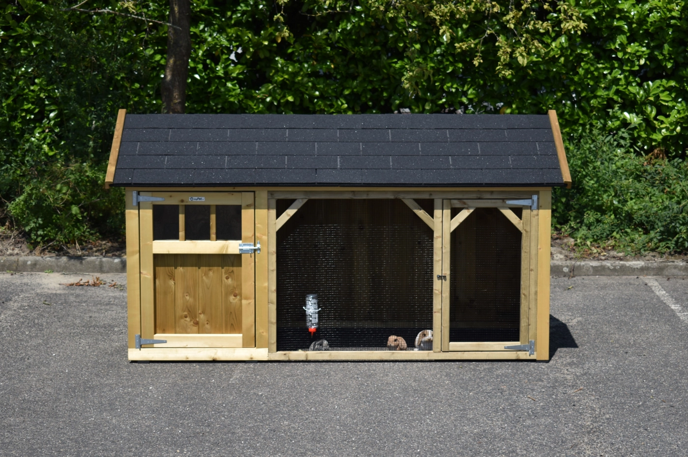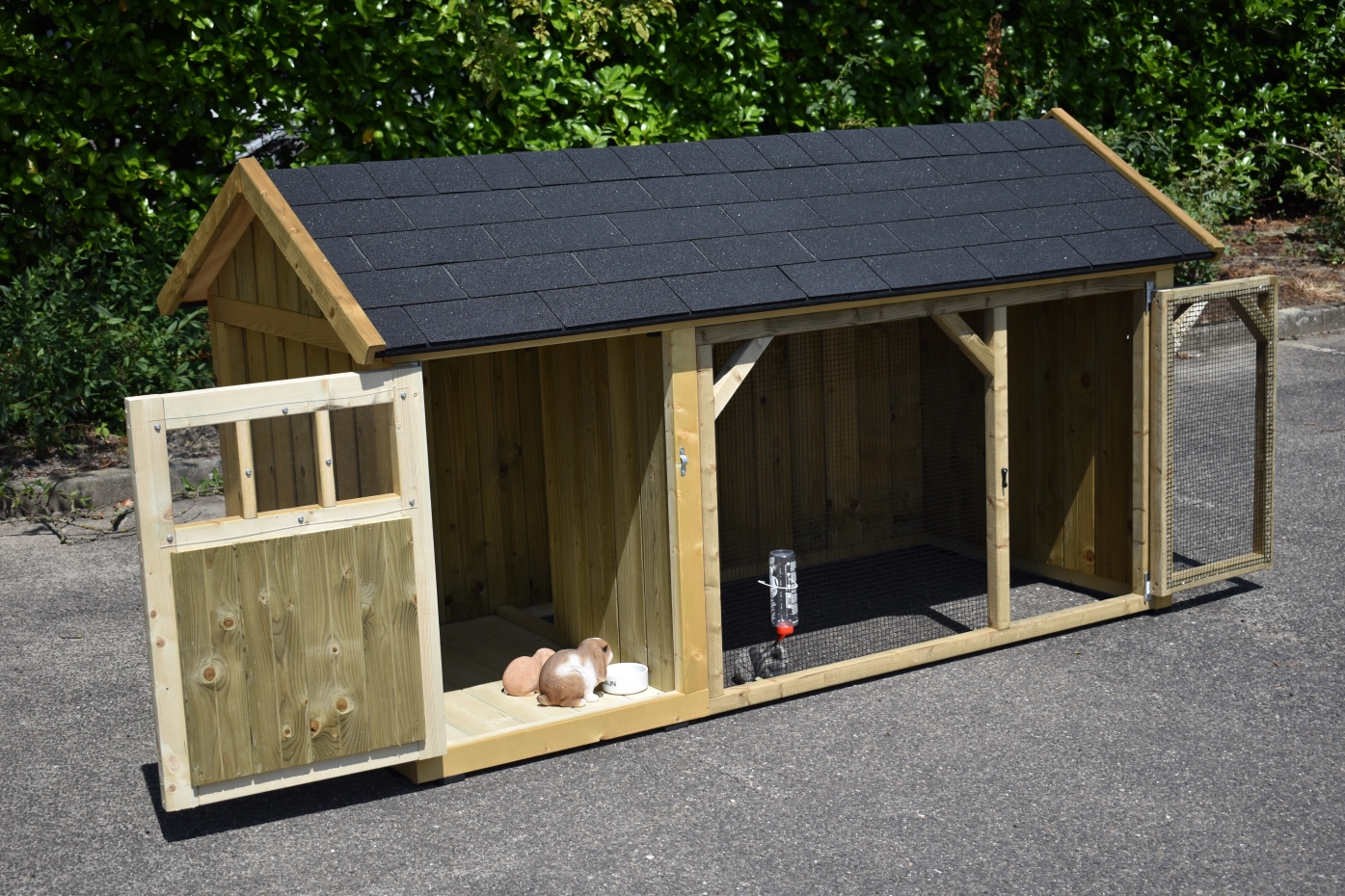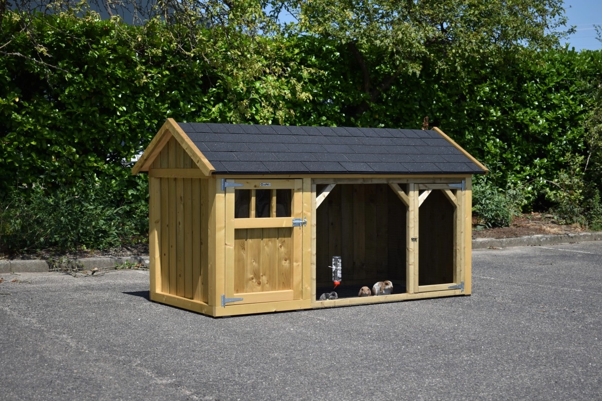 Rabbit hutch Belle 1 with a pointed roof is a beautiful hutch with a covered run. The sleeping compartment is provided with a floor of pressure-treated spruce. We make this rabbit hutch by ourselves in our shop. Because we use high-quality materials, this hutch is almost free from maintenance.
