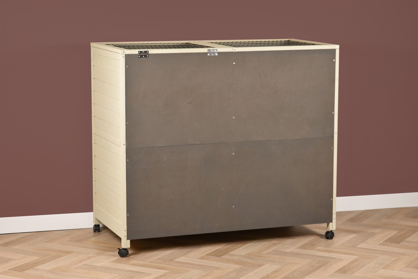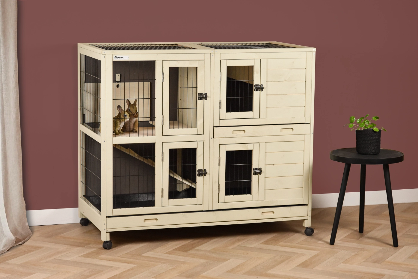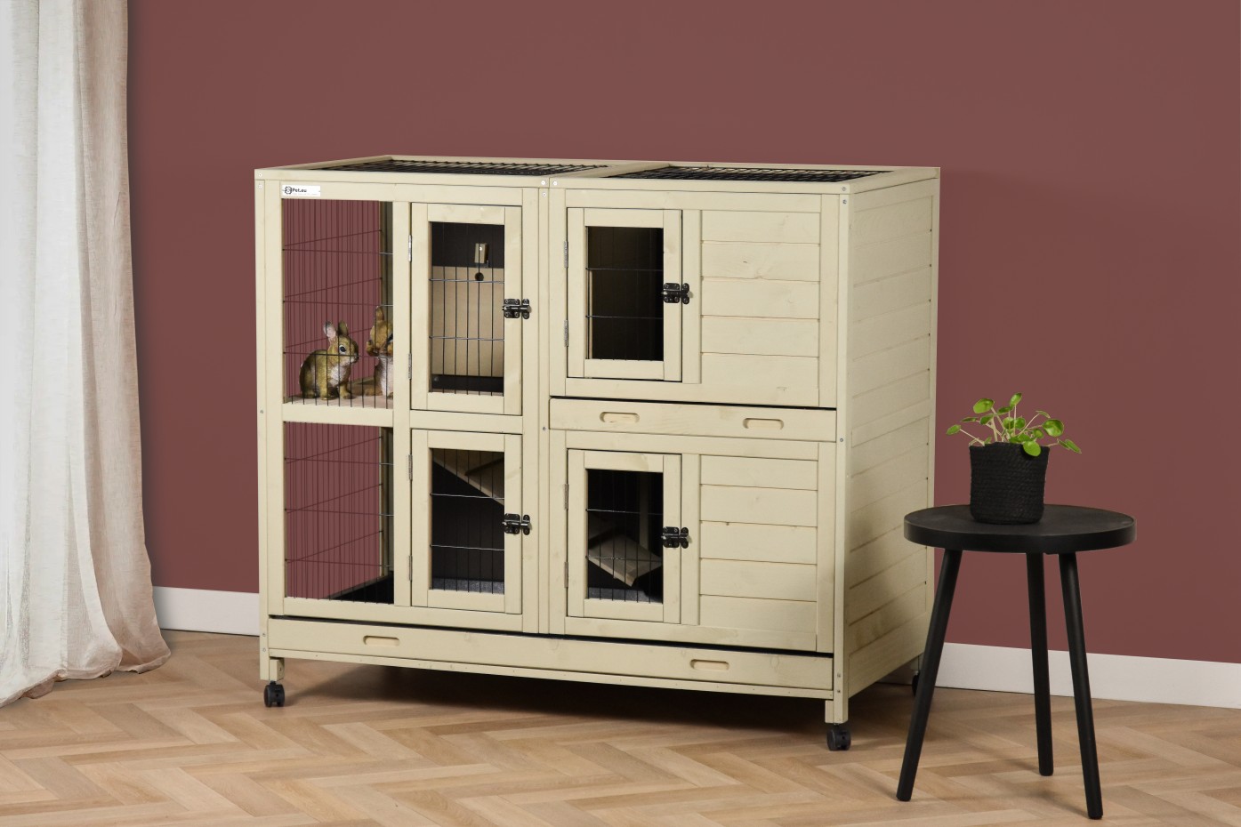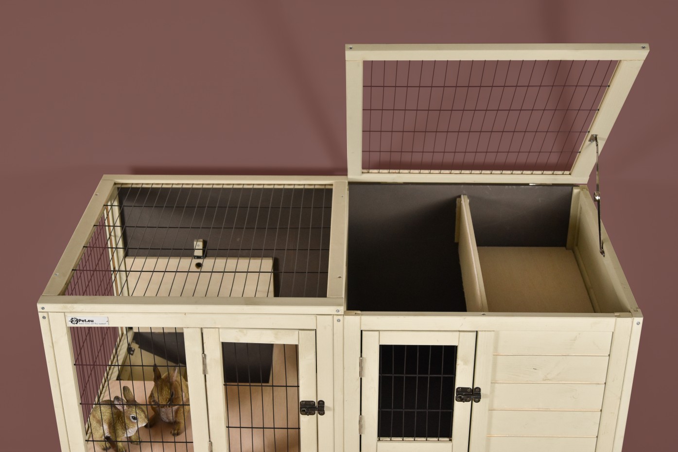 Rabbit hutch Bobby is a stylish indoor hutch made from beautiful pine wood and stained in a calm sand-beige colour. The back panel features a warm anthracite tone, giving the hutch a modern and harmonious appearance. Bobby offers space for two rabbits and includes a practical sleeping area with a convenient storage loft above it. The rabbits can easily reach the upper level via the ramp. The two levels can be closed off from each other, allowing you to arrange the enclosure flexibly at any time.