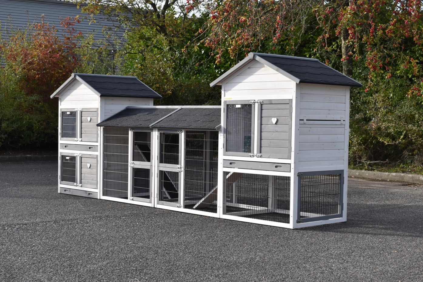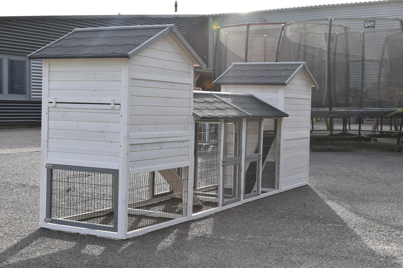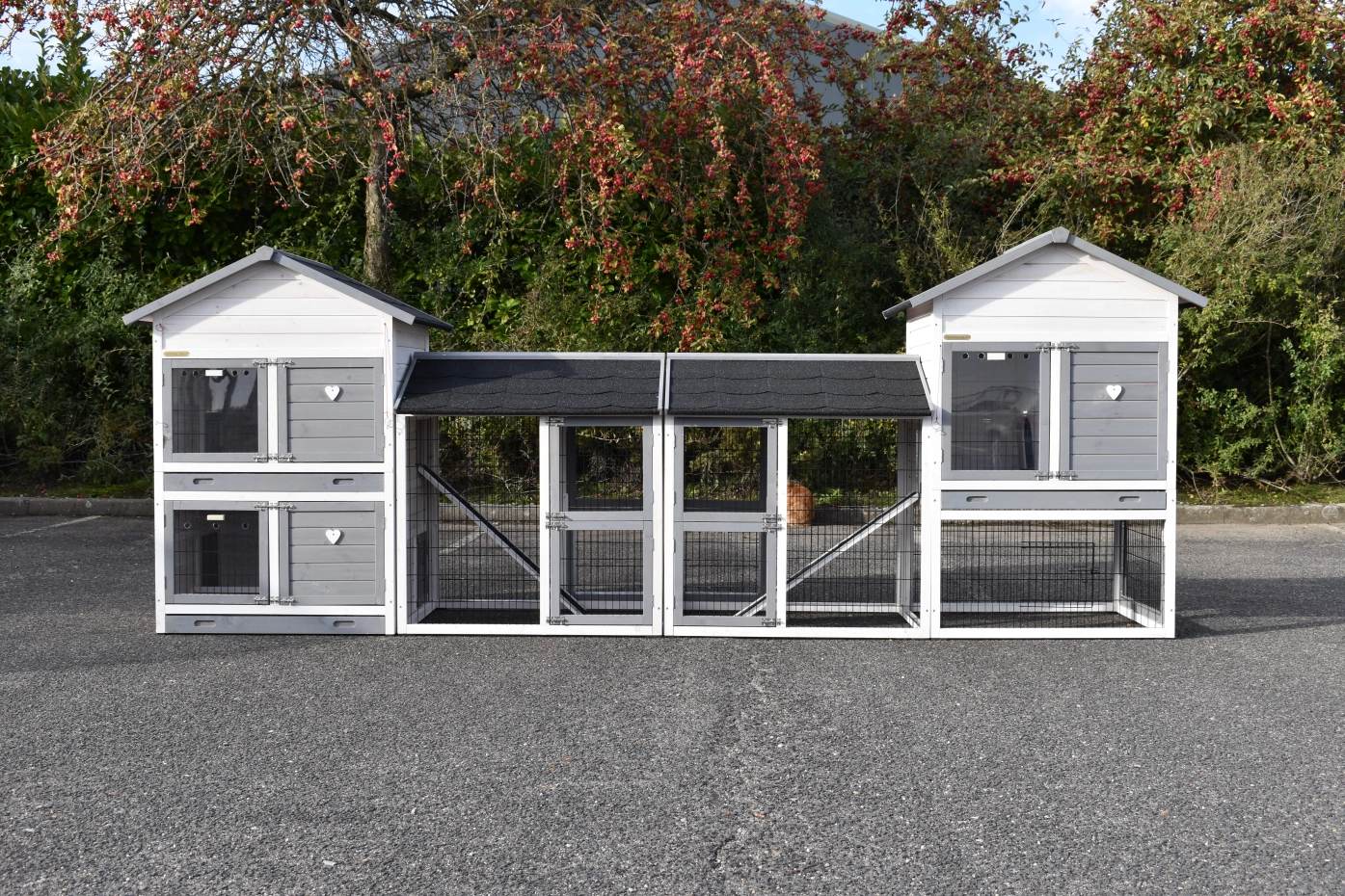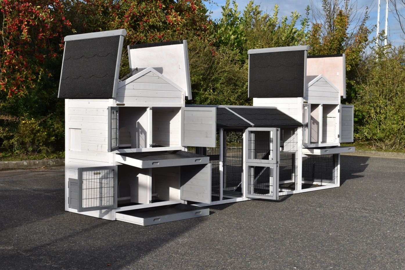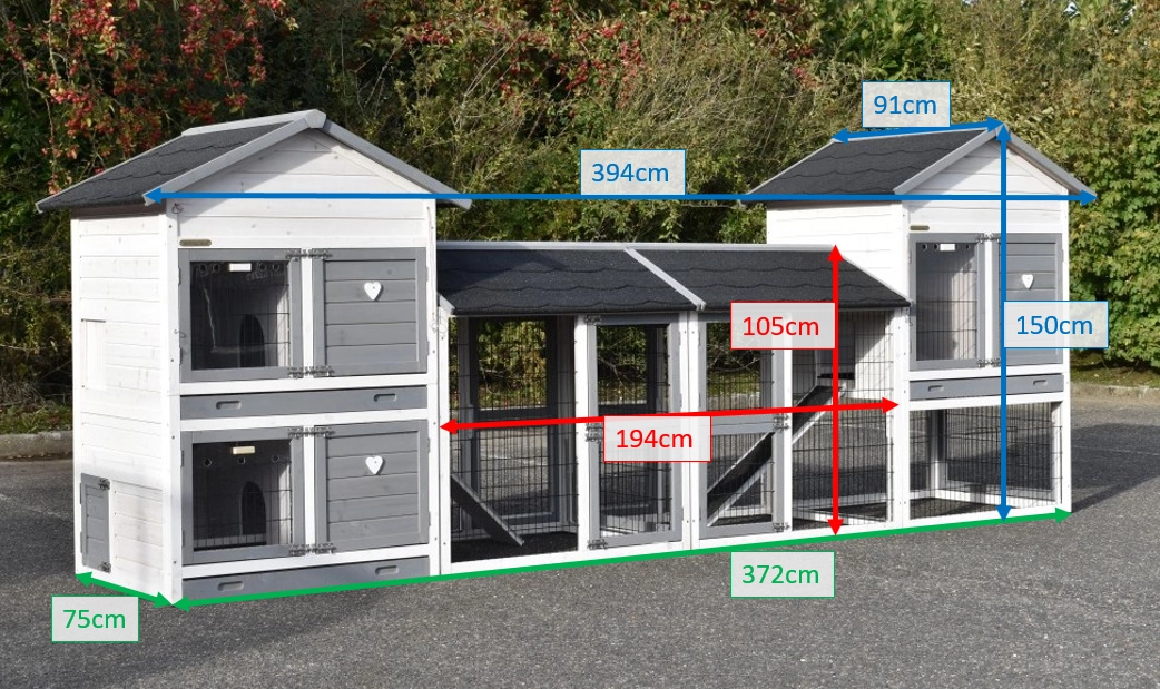 The rabbit hutch Prestige Medium is a beautiful hutch with chewprotection, large doors and rubber feet. The hutch has a large sleeping compartment and a large run. The max. dimensions are 394x90x150cm. With a minor adjustment, you can built the hutch mirror-image.
