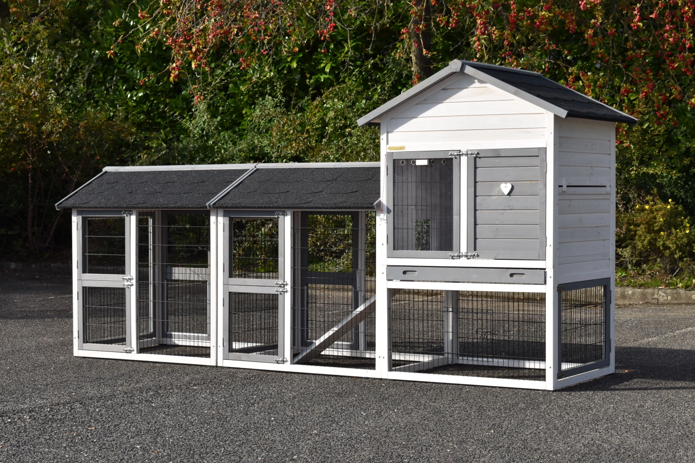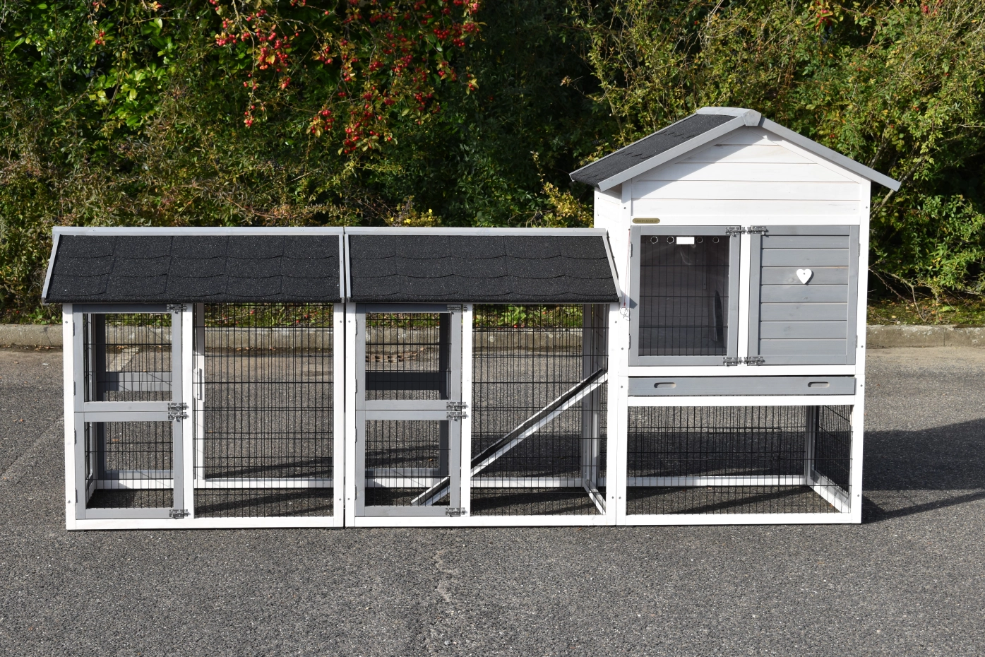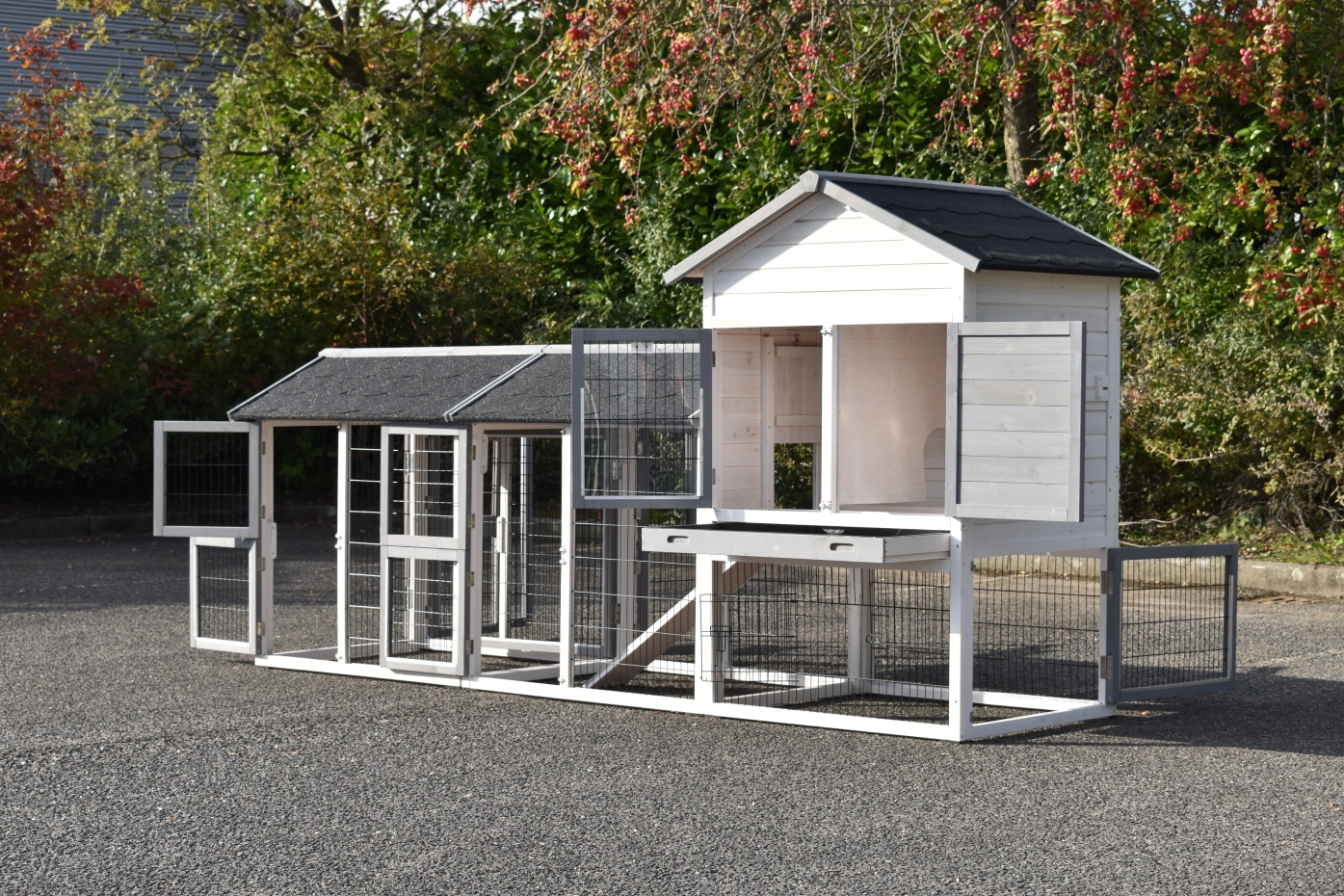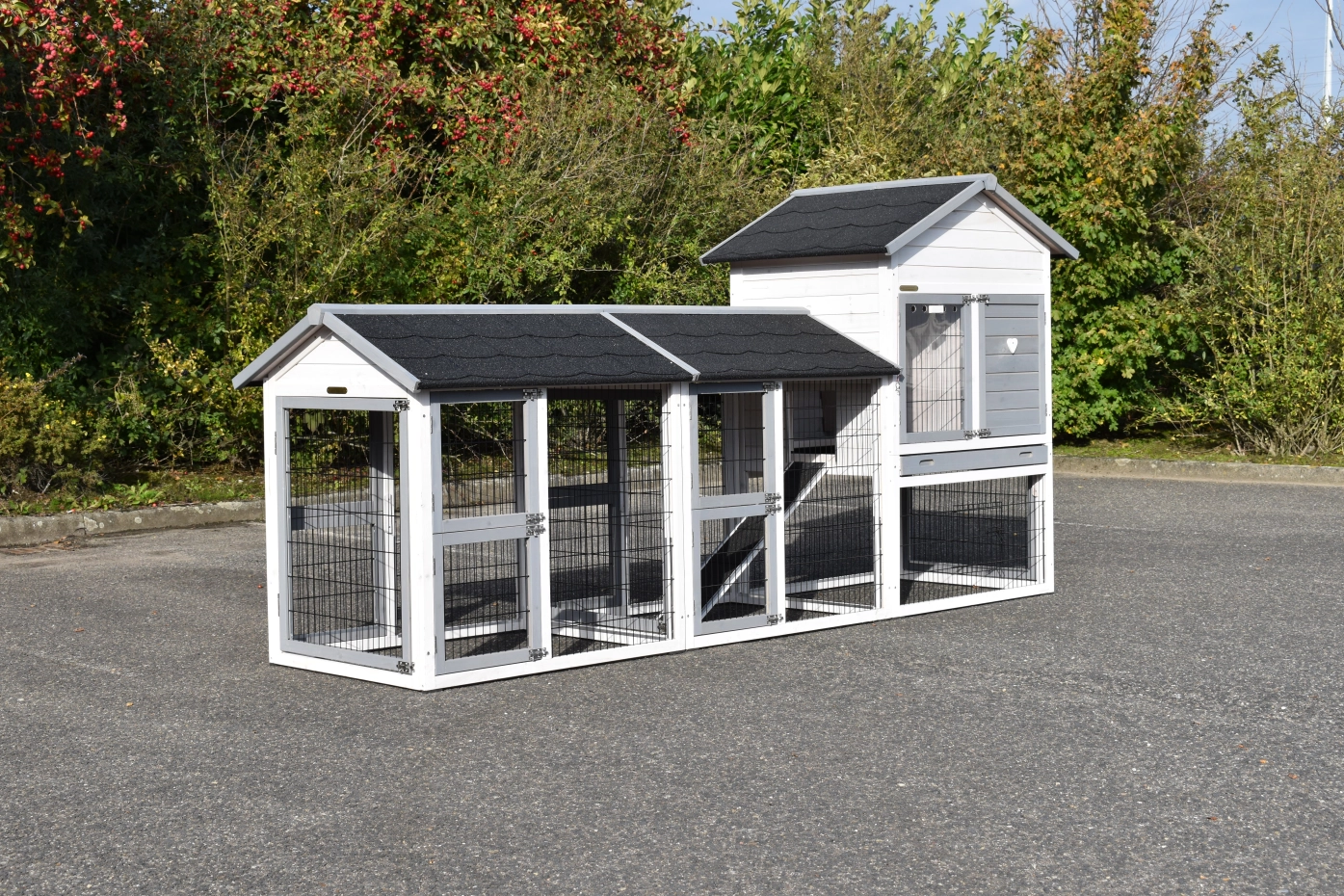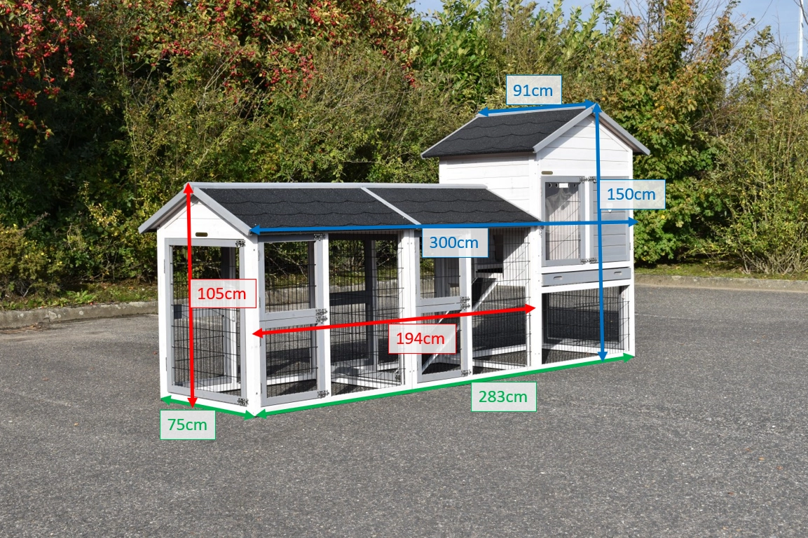 The rabbit hutch Prestige Medium is a beautiful hutch with chewprotection, large doors and rubber feet. The hutch has a large sleeping compartment and a large run. The max. dimensions are 300x91x150cm. With a minor adjustment, you can built the hutch mirror-image.