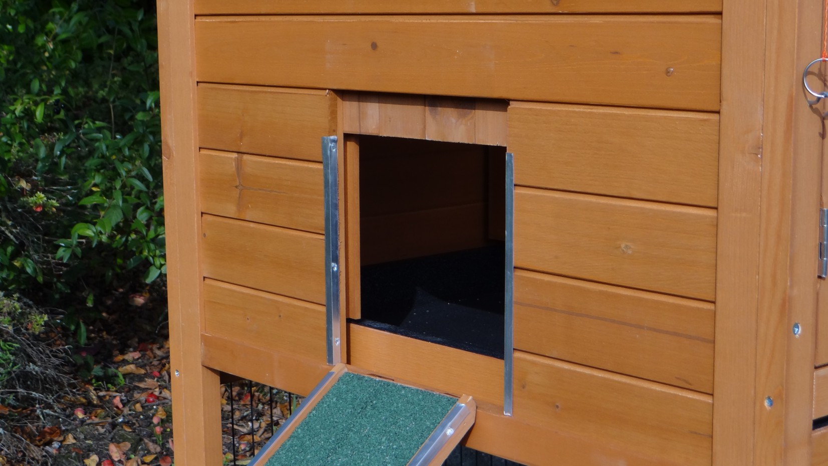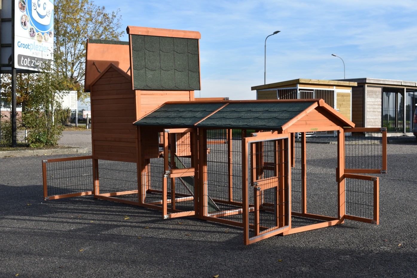 The rabbit hutch Prestige Medium is finished with aluminum edges on the most sensitive areas to prevent your rabbits from gnawing on the wood. A fantastic hutch for your rabbits. This beautiful rabbit hutch is excellently crafted down to the finest detail, featuring spacious doors and a generous night compartment. The rabbit hutch is placed on rubber feet for optimal protection, making it very practical to use. The Prestige Medium rabbit hutch is expandable with, for example, extension runs. You can also easily assemble this chicken coop in reverse with minor adjustments.