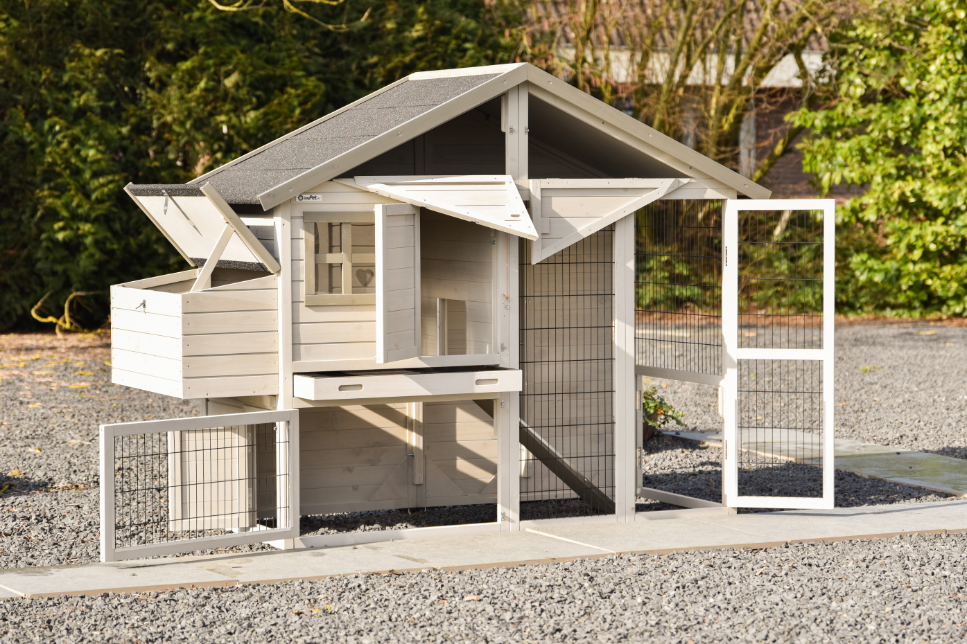 The wood, used for your pet house is a unique natural product which has been processed according to traditional methods in the country of origin, after careful selection. It is characteristic and unique in every way. This wood product has been manually processed. No single piece of wood is the same in shape, structure or color, so color shades are inevitable even within one piece of wood. Wind cracks, imperfections and the presence of large and small knots testify to their origin and years of growth. Bumps are usually manually updated with wood fill. Through use and through the influence of light, new pet houses will finally get a warmer color. Color differences in comparison with the show model or even among themselves are therefore usual. The pet house is stained in the colors as in the picture. You should do it once again to prevent mold and rot. You can easily order the stain together with the pet house.
