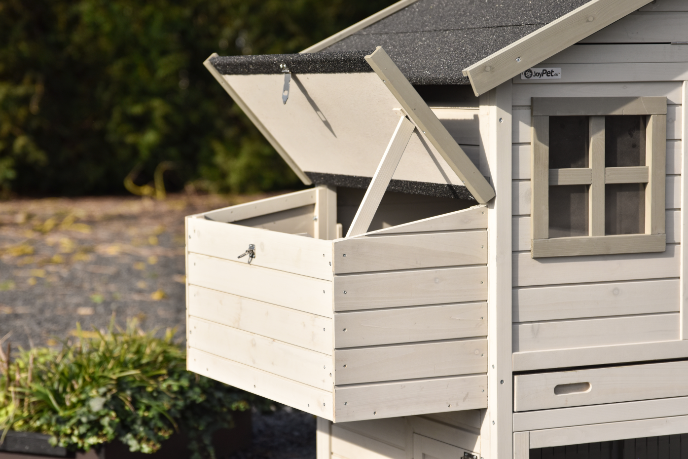 - The pet house has a handy storage attic