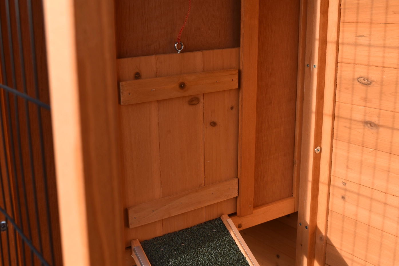 This pet house is made from pine wood in the traditional way. Pine wood is a particularly beautiful kind of coniferous wood which has been valued for a long time in our range of pet houses. Especially the wood grain, flame drawing, and changing color shades give the enclosure a solid and warm appearance.