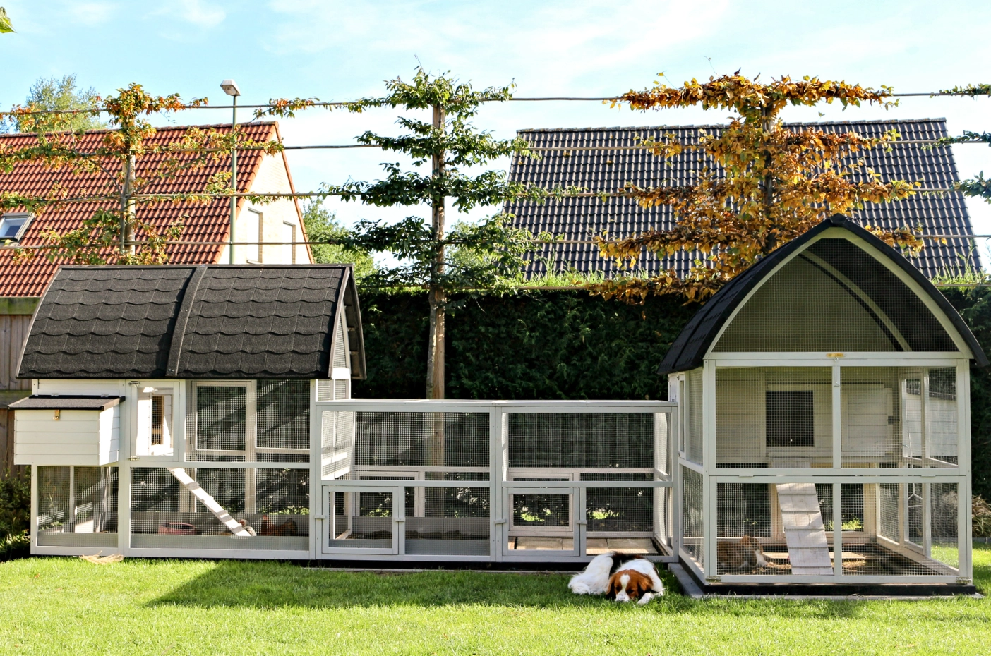 Our amazing XXL animal enclosure, comprising 2 Kathedraal XXL Rabbit Hutches and 2 Kathedraal extension runs with a foundation, provides space for rabbits and chickens. Made of beautiful pine wood with a tar-papered roof, a handy attic, a ramp between floors, and a galvanized metal sliding tray for easy cleaning. The night shelter is lockable with double locks.