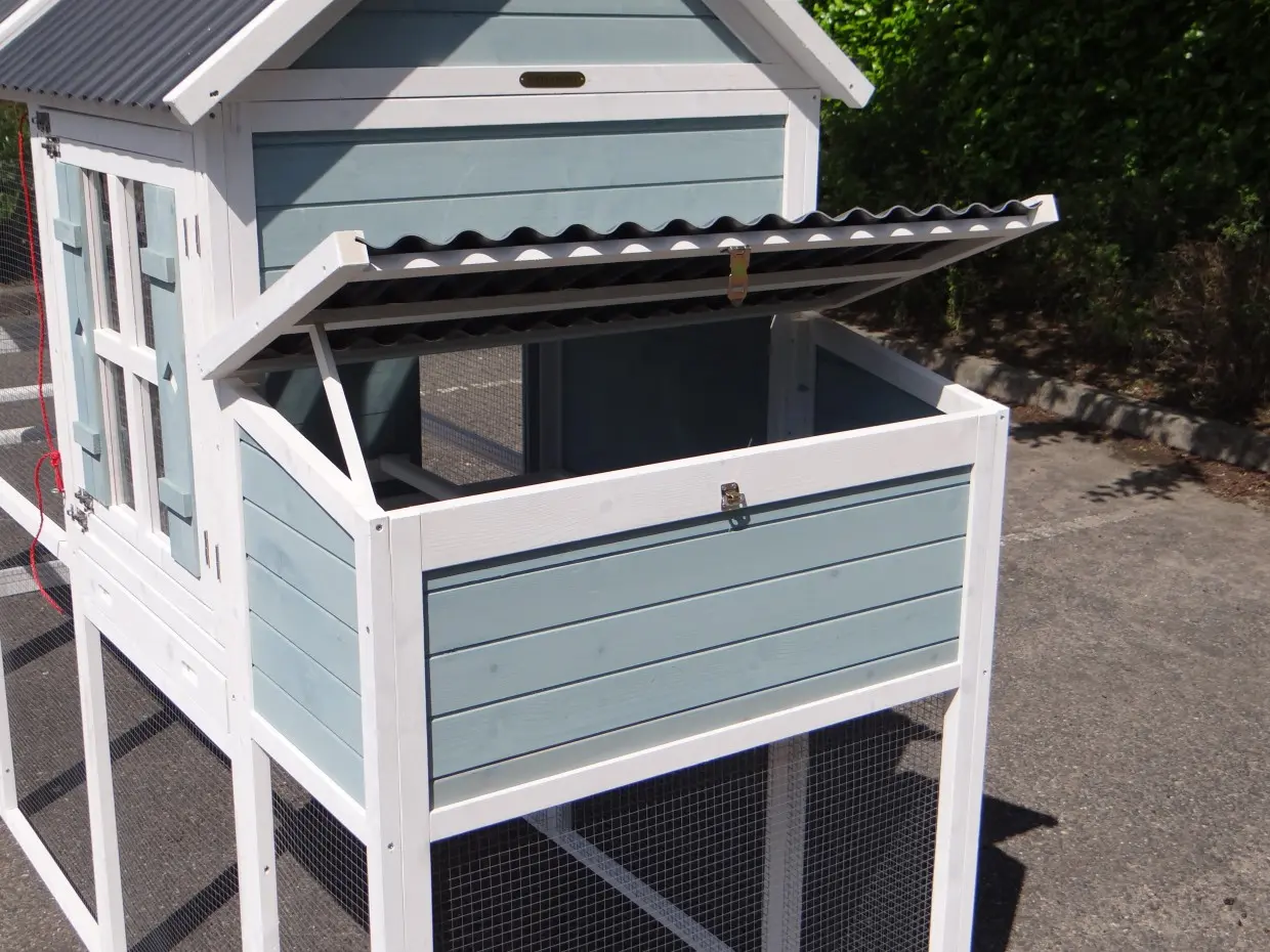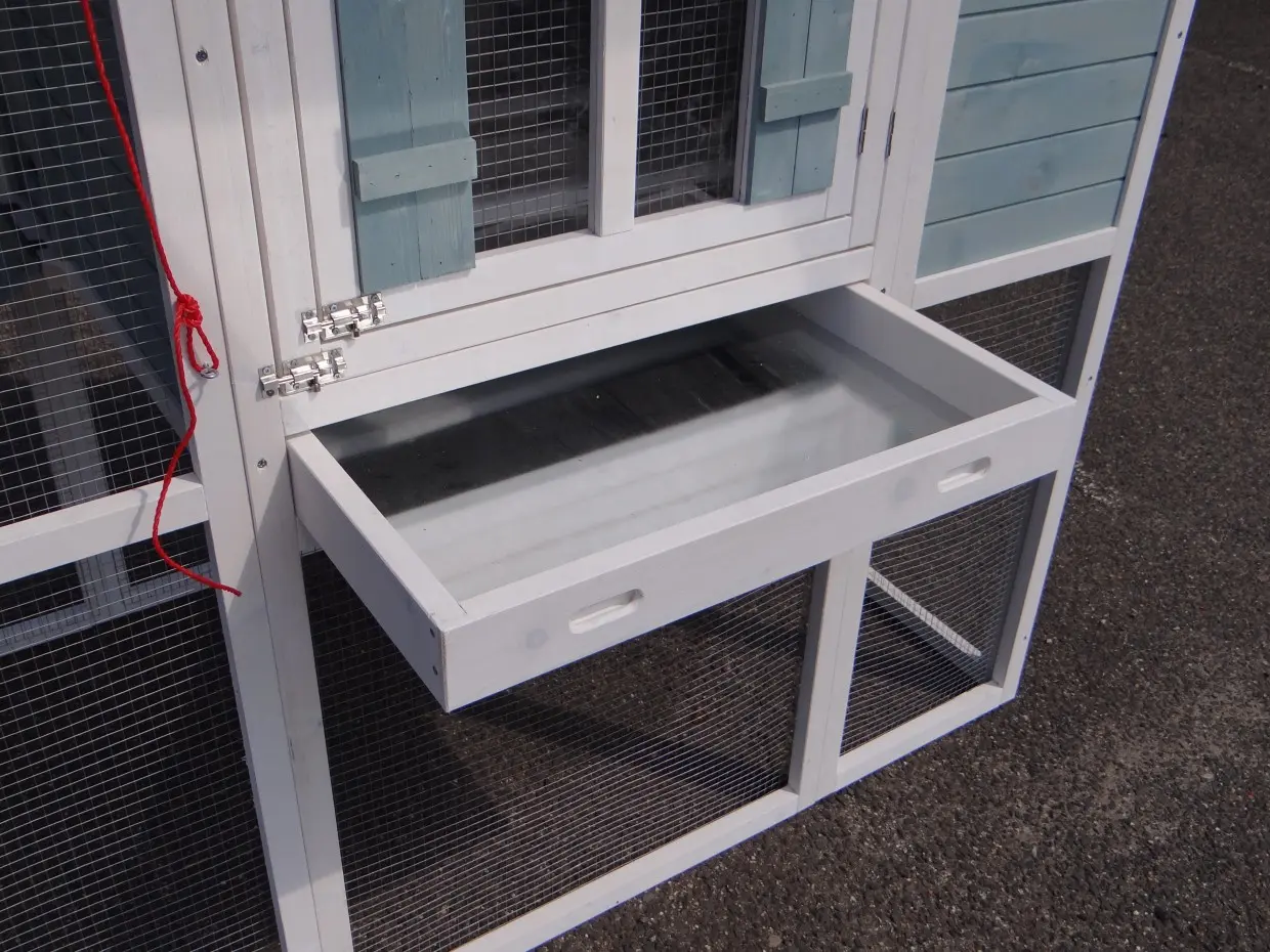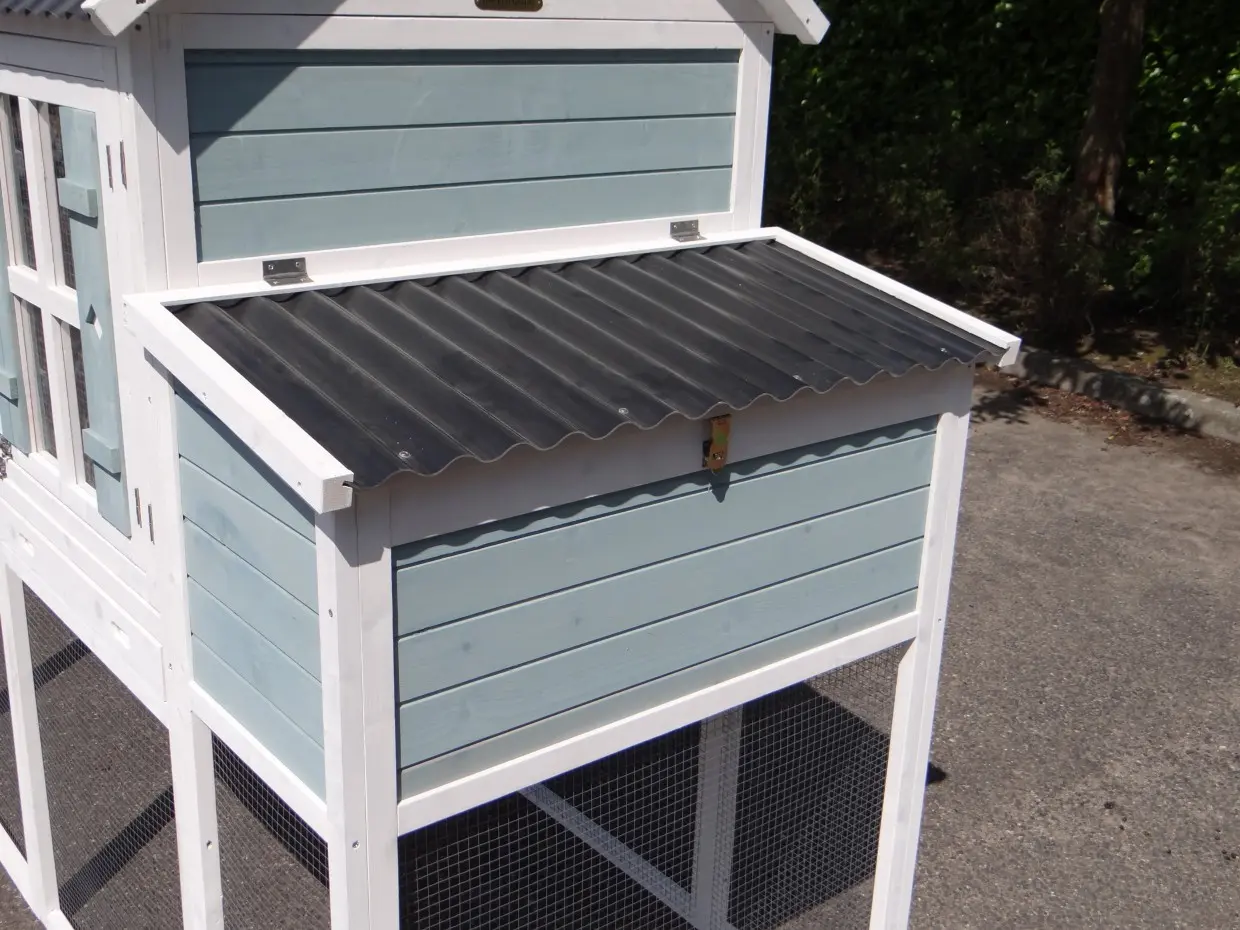 The large rabbit hutch Alexia will be delivered in the colors white/blue. The hutch has a large run of almost 3m2. The sliding door of the sleeping compartment can be operated from the outside with a cord. On the frontside of the sleepinc compartment is a double door. The first door can be opened, without the risck that the rabbits could escape. The animals are stopped by the mesh of the second door. On a warm summerday do the rabbits have a bit fresh air in the sleeping compartment. The second door can also be opened, to clean the hutch. In the run is the highest point 185cm.