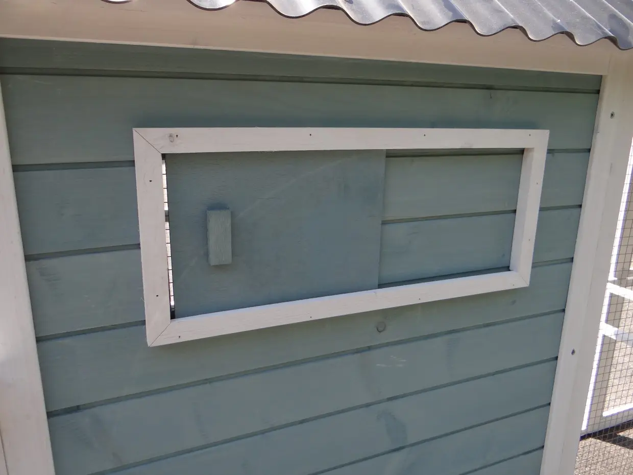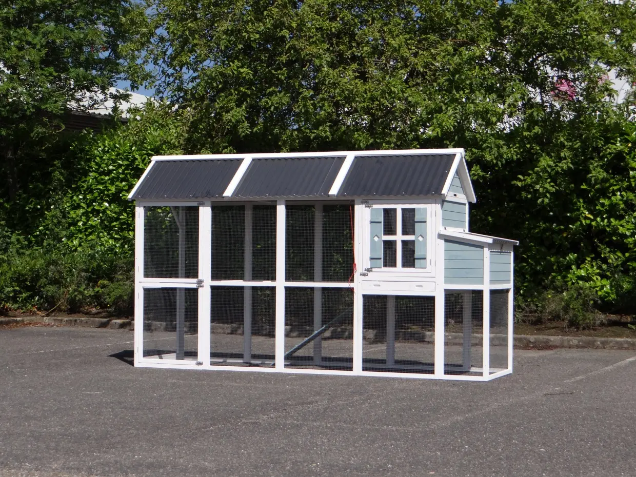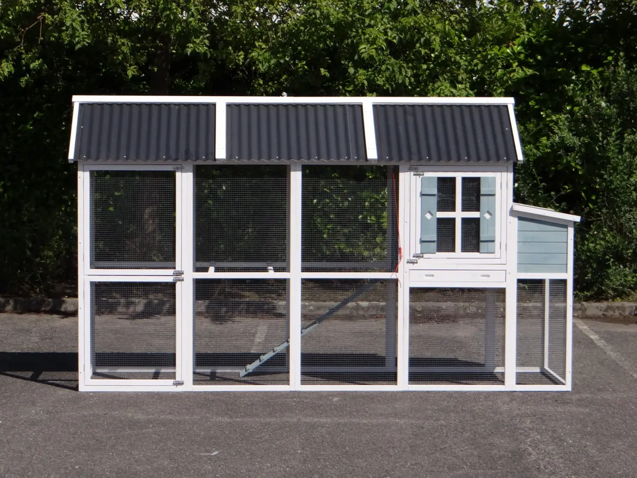 The large rabbit hutch Alexia will be delivered in the colors white/blue. The hutch has a large run of almost 3m2. The sliding door of the sleeping compartment can be operated from the outside with a cord. On the frontside of the sleepinc compartment is a double door. The first door can be opened, without the risck that the rabbits could escape. The animals are stopped by the mesh of the second door. On a warm summerday do the rabbits have a bit fresh air in the sleeping compartment. The second door can also be opened, to clean the hutch. In the run is the highest point 185cm.