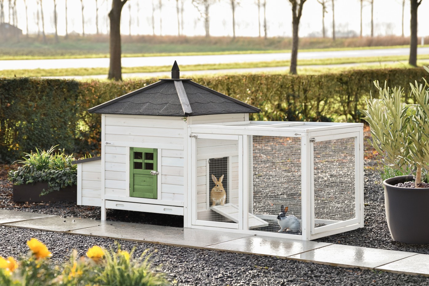 This bunny hutch is actually a hen house, but it is used for large rabbits as well. You should be aware that there's no protection against chewing in this bunny house. However, it can be ordered separately. The hutch is suitable for 2 till 4 rabbits. The maximal dimensions, incl. roof, are 218x93x122cm .