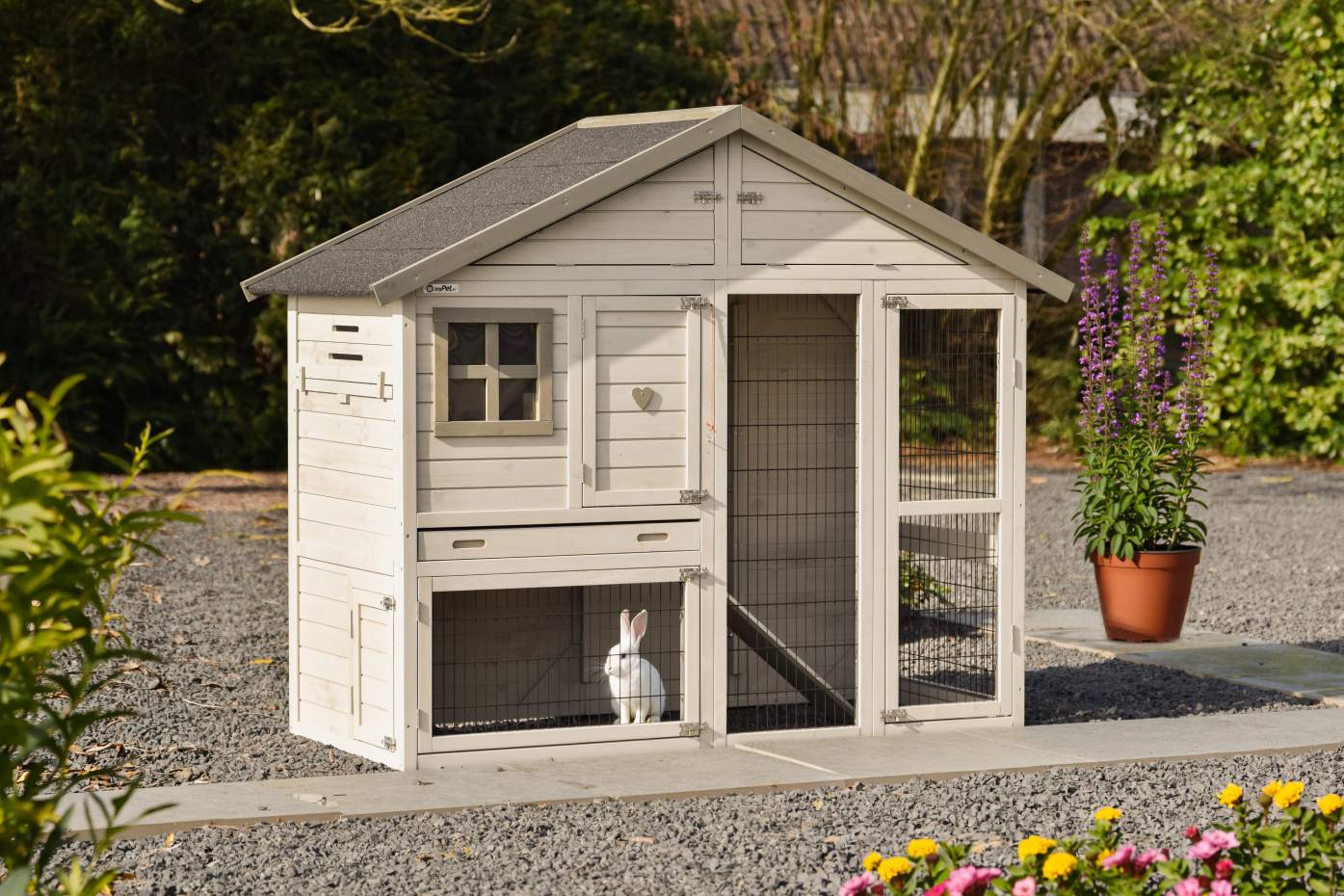 The rabbit hutch Holiday medium is a spacious and practical enclosure in the colour light-grey with multiple doors, making feeding, cleaning and daily care easy; this mid-sized model from the Holiday series offers comfortable living space for rabbits, features a convenient storage loft for items such as feed or accessories and can be fully extended with various outdoor runs, allowing the hutch to grow and adapt to the available garden space.
