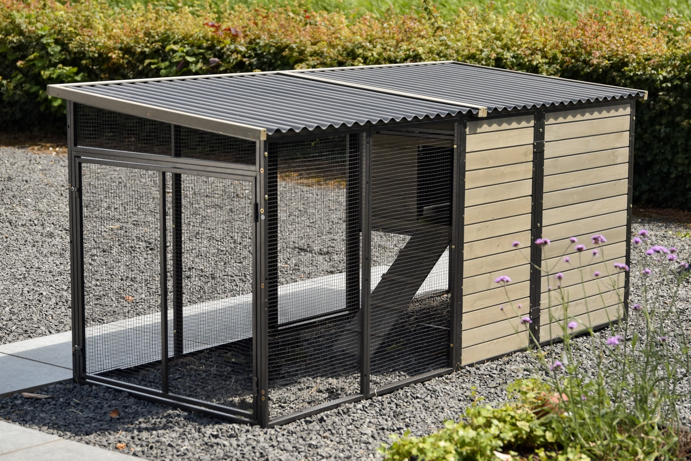 • Animal hutch made of pine wood with a sturdy, coated steel frame and black wire mesh