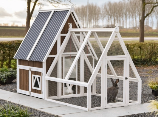 Rabbit hutch Pip with run is a spacious and practical enclosure with a classic pitched roof, suitable for keeping several rabbits. Thanks to its generous dimensions, this enclosure is also highly suitable for Flemish Giants. The open ridge provides extra height in the sleeping area, while the spacious run offers plenty of room to move for larger breeds.
