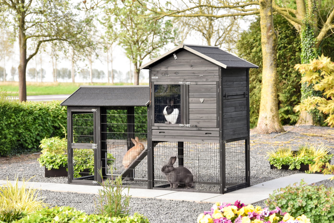 A spacious and practical rabbit hutch in which your rabbits will immediately feel at home The generous night shelter provides comfort and rest, while the large doors make maintenance easy On the left side of the night shelter there is a run, giving your rabbits immediate access to plenty of space to move Thanks to the rubber feet, the hutch is protected against rising damp Moreover, the rabbit hutch can easily be combined with multiple runs for extra space, allowing you to expand it endlessly