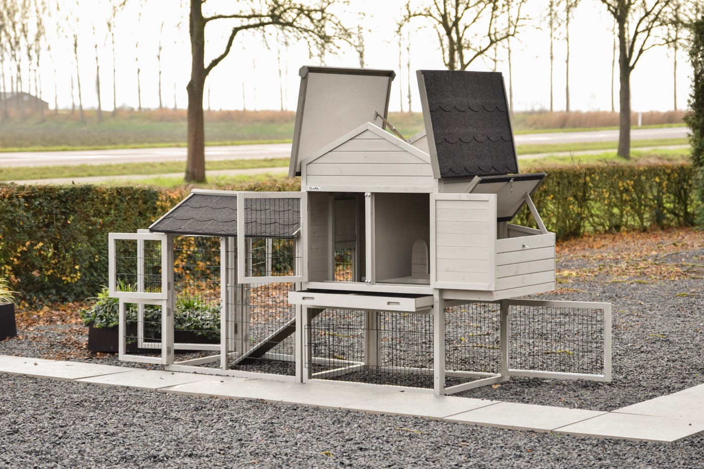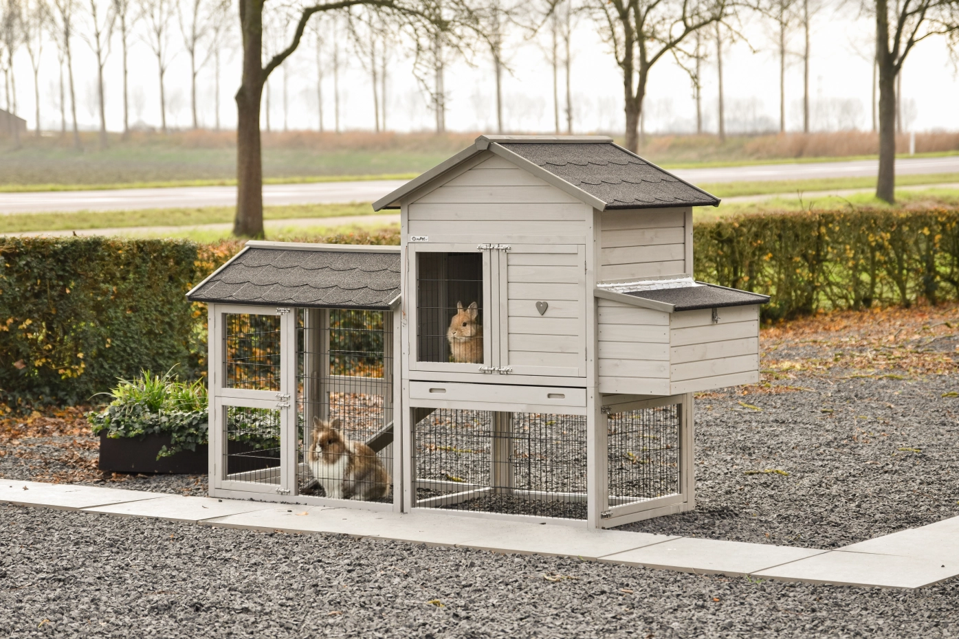 The rabbit hutch Prestige Medium with run on the left side and a nesting box is provided with aluminium strips. This hutch is suitable for 1 à 3 rabbits. This rabbit hutch has large doors, a large sleeping compartment and a large run. For maximum protection stands the rabbit hutch on rubber feet. The hutch has a tray, to clean the hutch easily. With a minor adjustment, you can built the hutch in mirror-image.