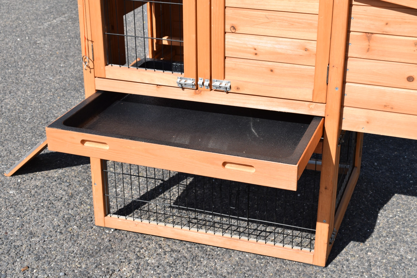 This pet house is made from pine wood in the traditional way. Pine wood is a particularly beautiful kind of coniferous wood which has been valued for a long time in our range of pet houses. Especially the wood grain, flame drawing, and changing color shades give the enclosure a solid and warm appearance.