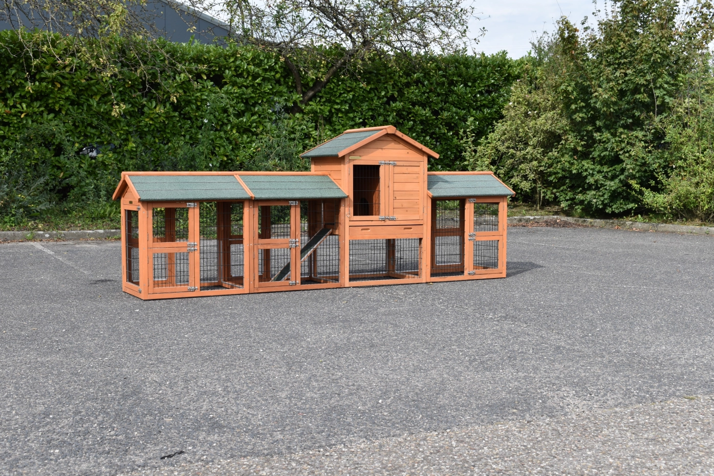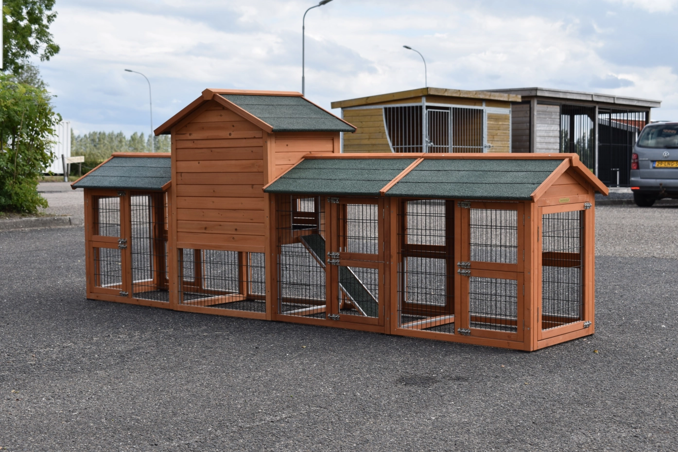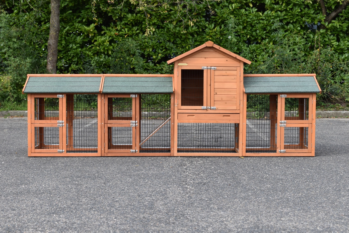 Rabbit hutch Prestige Small is extended with 3 runs Space Small. The hutch has many doors and a plastic tray, so that you can clean the hutch very easily. The hutch has a practical storage attick. The sleeping compartment is suitable for 2 rabbits. The maximal dimensions, inclusive roof, are 312x72x122cm.
