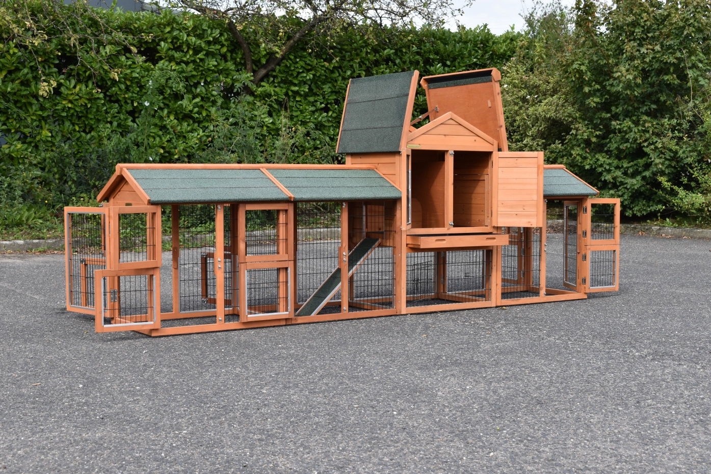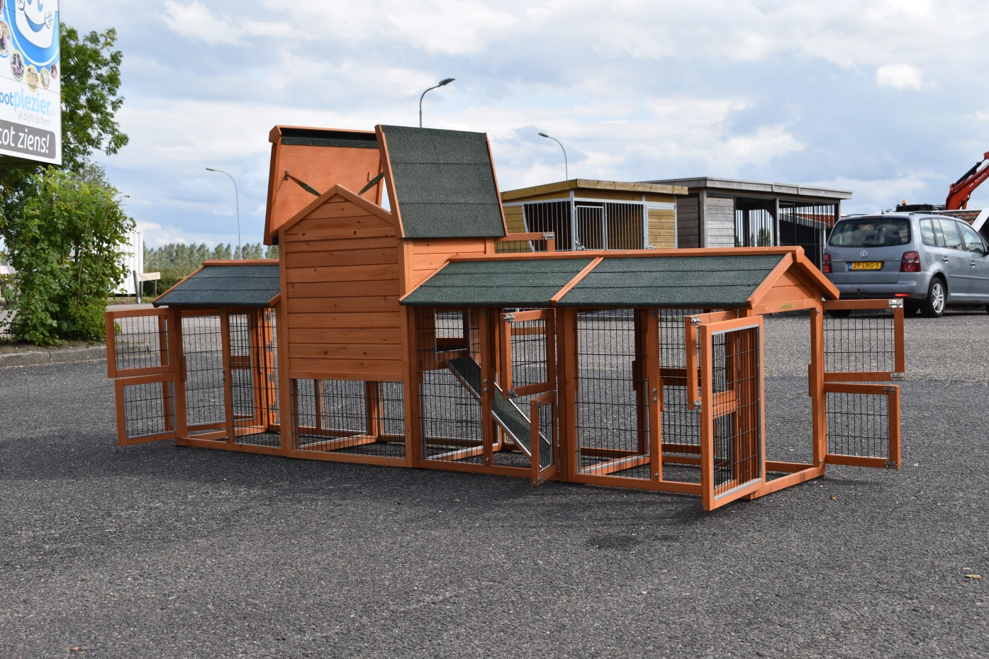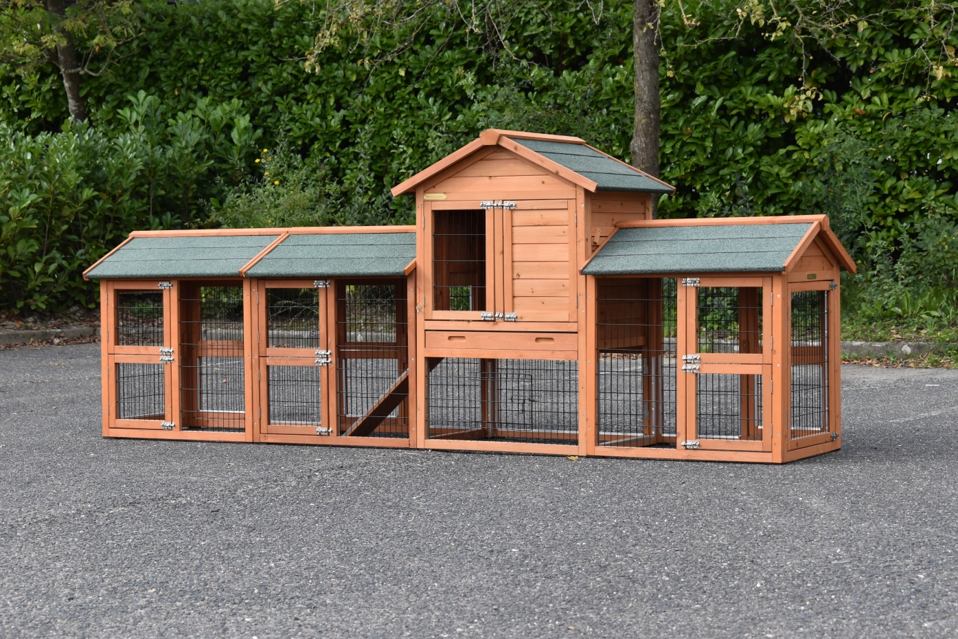 Rabbit hutch Prestige Small is extended with 3 runs Space Small. The hutch has many doors and a plastic tray, so that you can clean the hutch very easily. The hutch has a practical storage attick. The sleeping compartment is suitable for 2 rabbits. The maximal dimensions, inclusive roof, are 312x72x122cm.