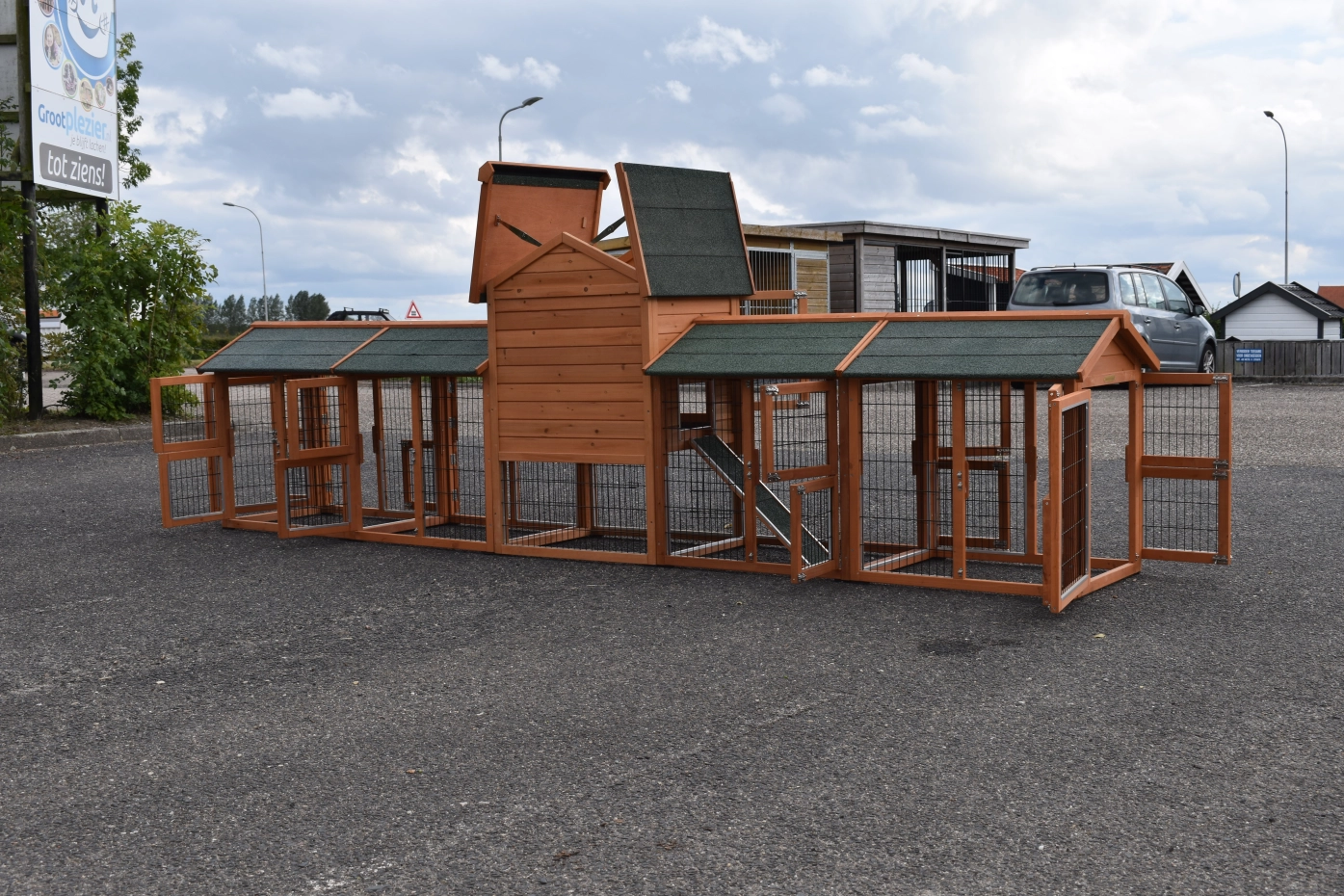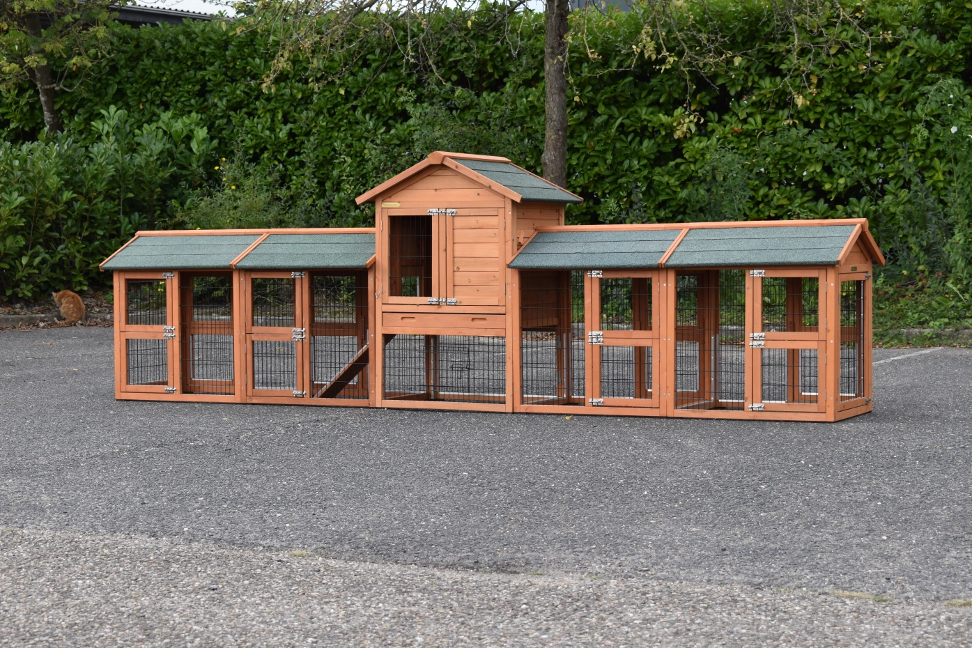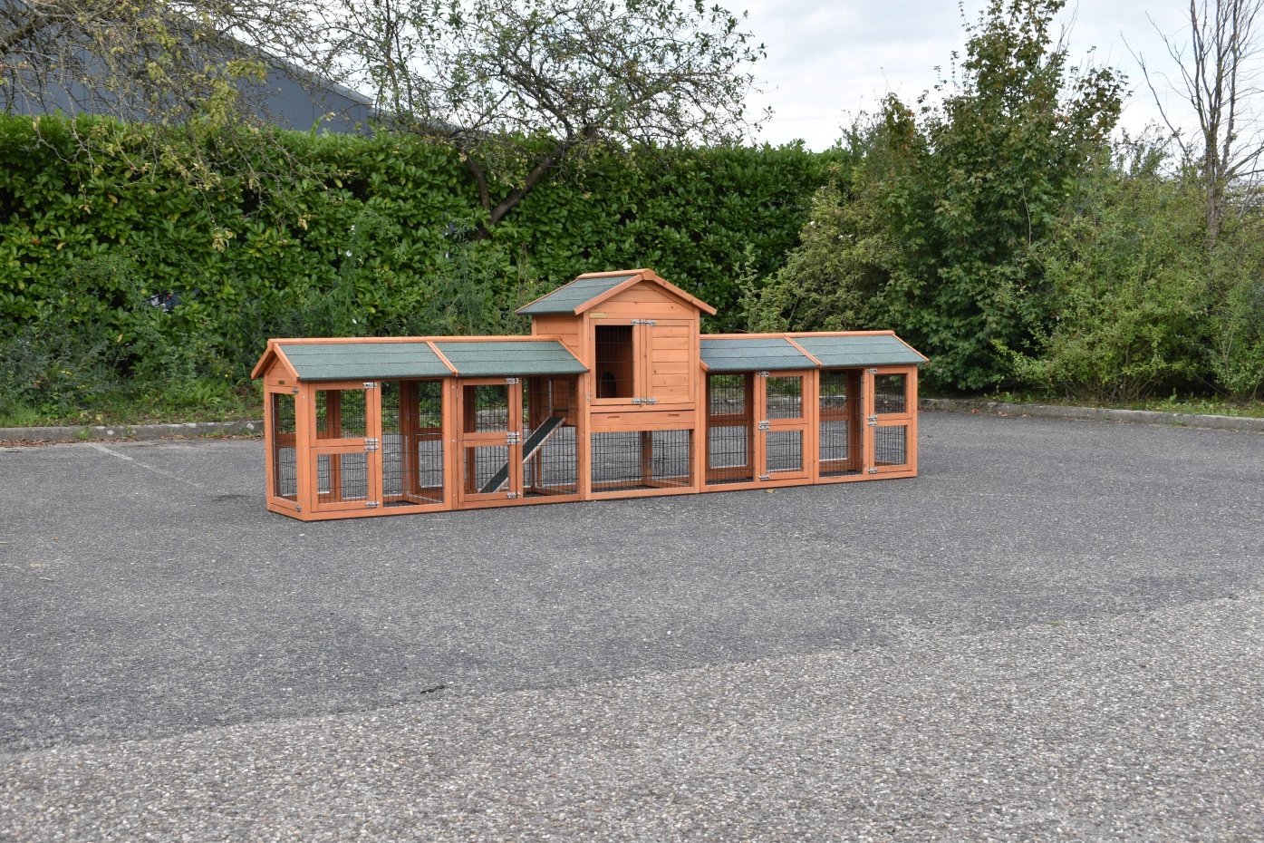 Rabbit hutch Prestige Small is extended with 4 runs Space Small. The hutch has many doors and a plastic tray, so that you can clean the hutch very easily. The hutch has a practical storage attick. The sleeping compartment is suitable for 2 rabbits. The maximal dimensions, inclusive roof, are 388x72x122cm.