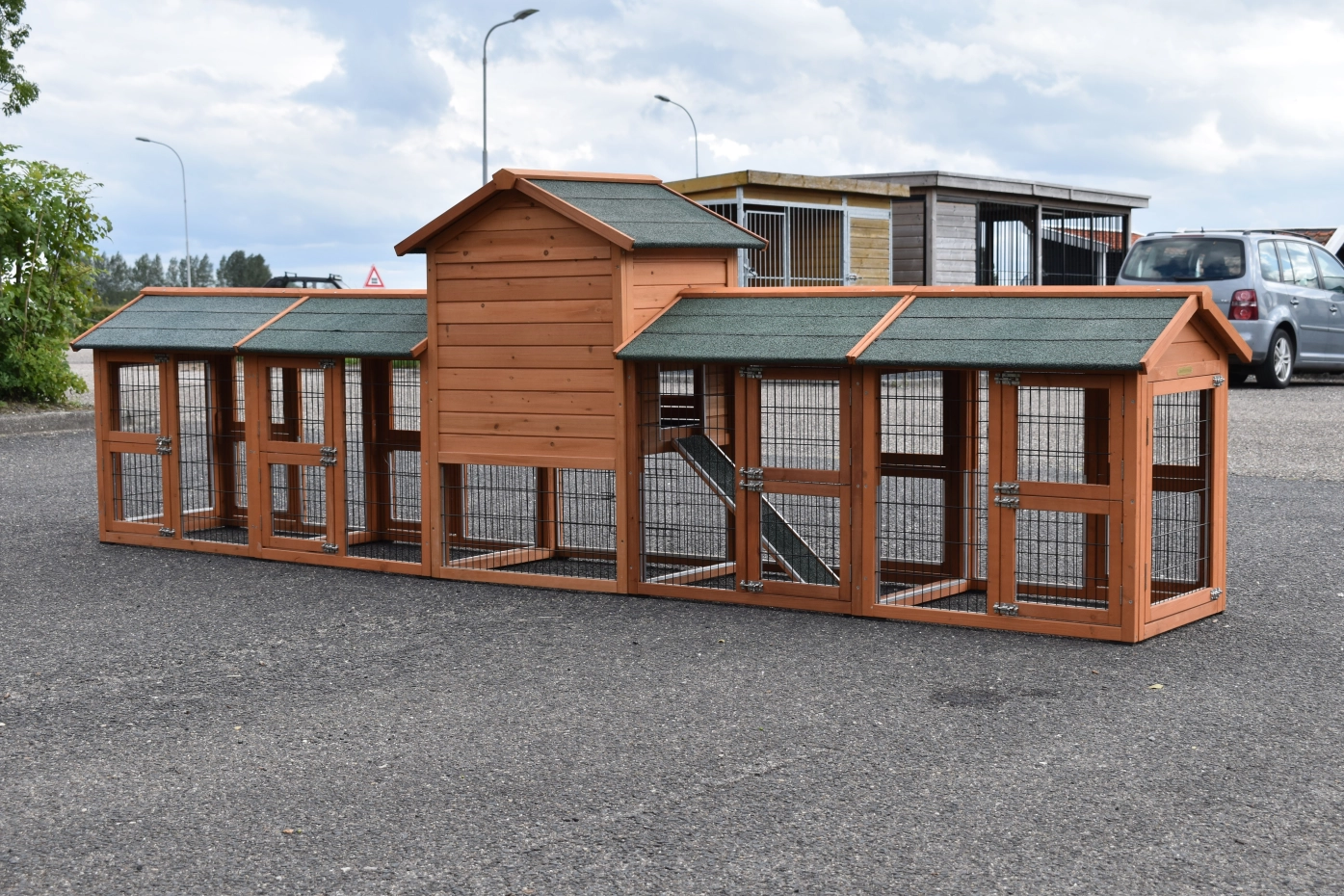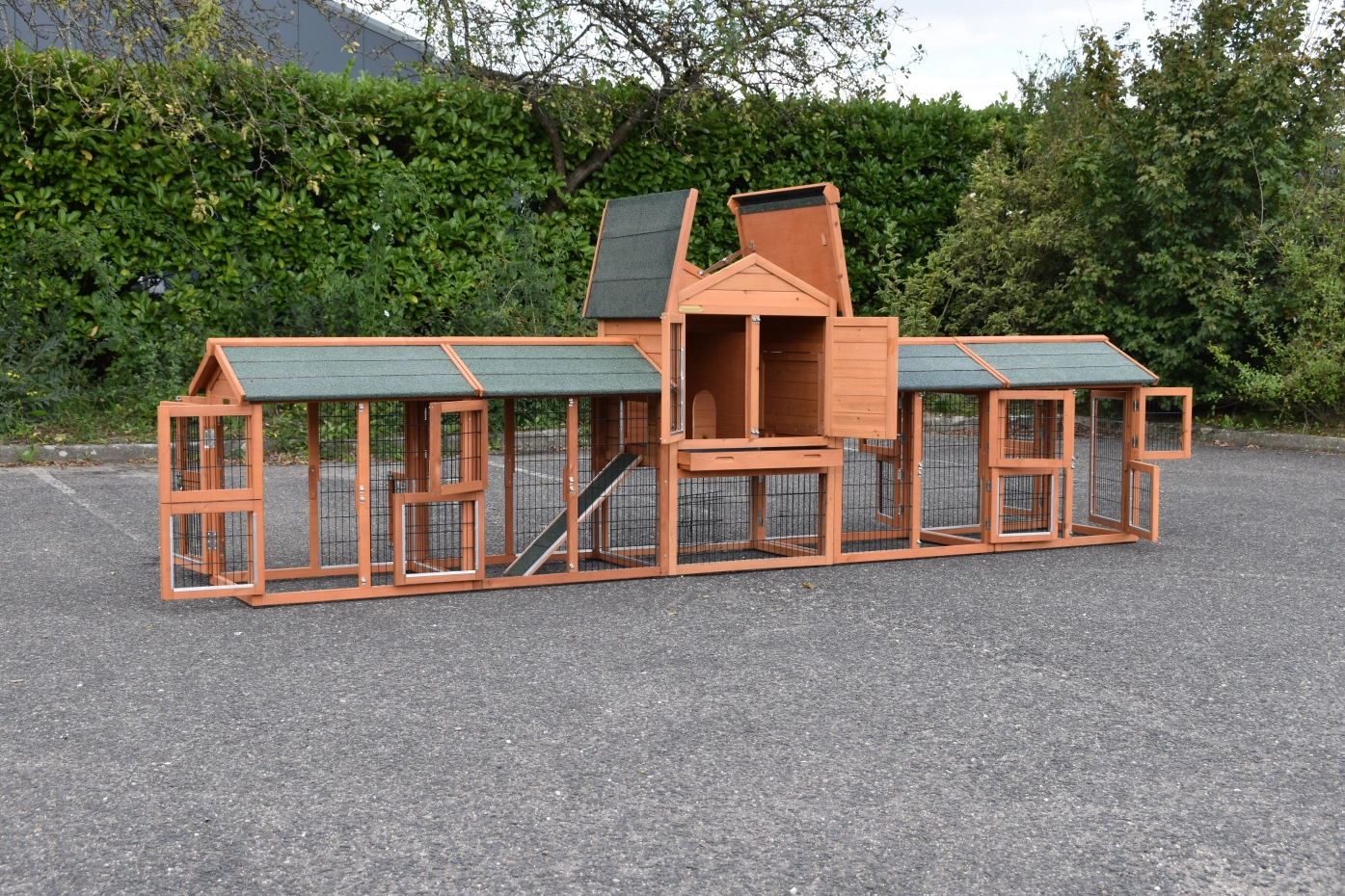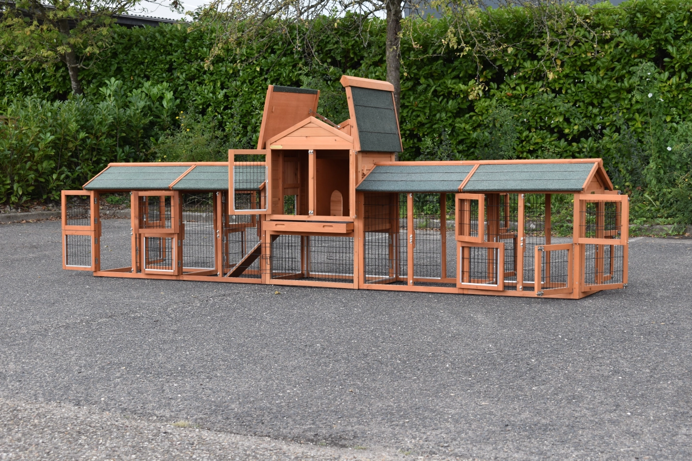 Rabbit hutch Prestige Small is extended with 4 runs Space Small. The hutch has many doors and a plastic tray, so that you can clean the hutch very easily. The hutch has a practical storage attick. The sleeping compartment is suitable for 2 rabbits. The maximal dimensions, inclusive roof, are 388x72x122cm.