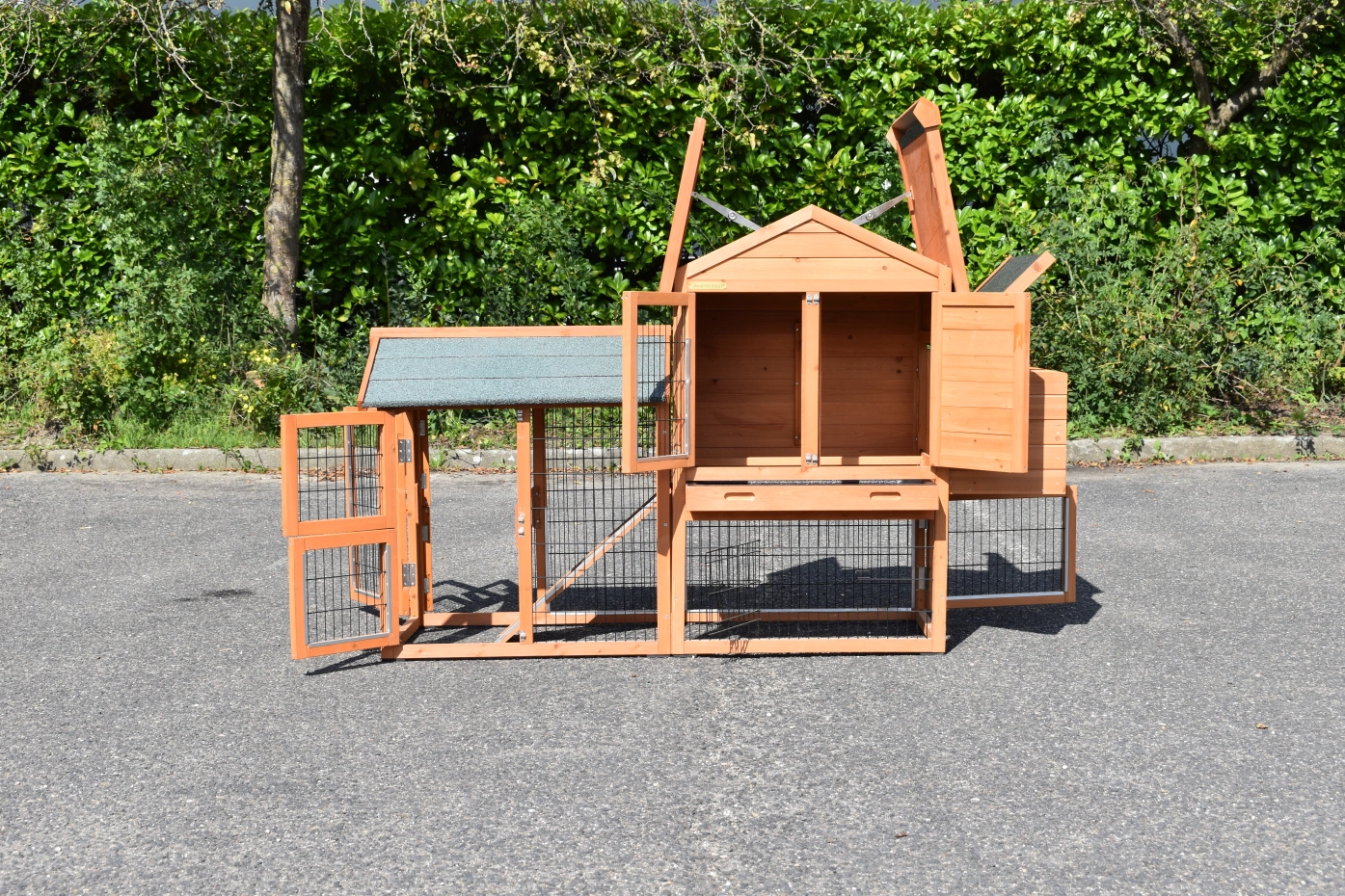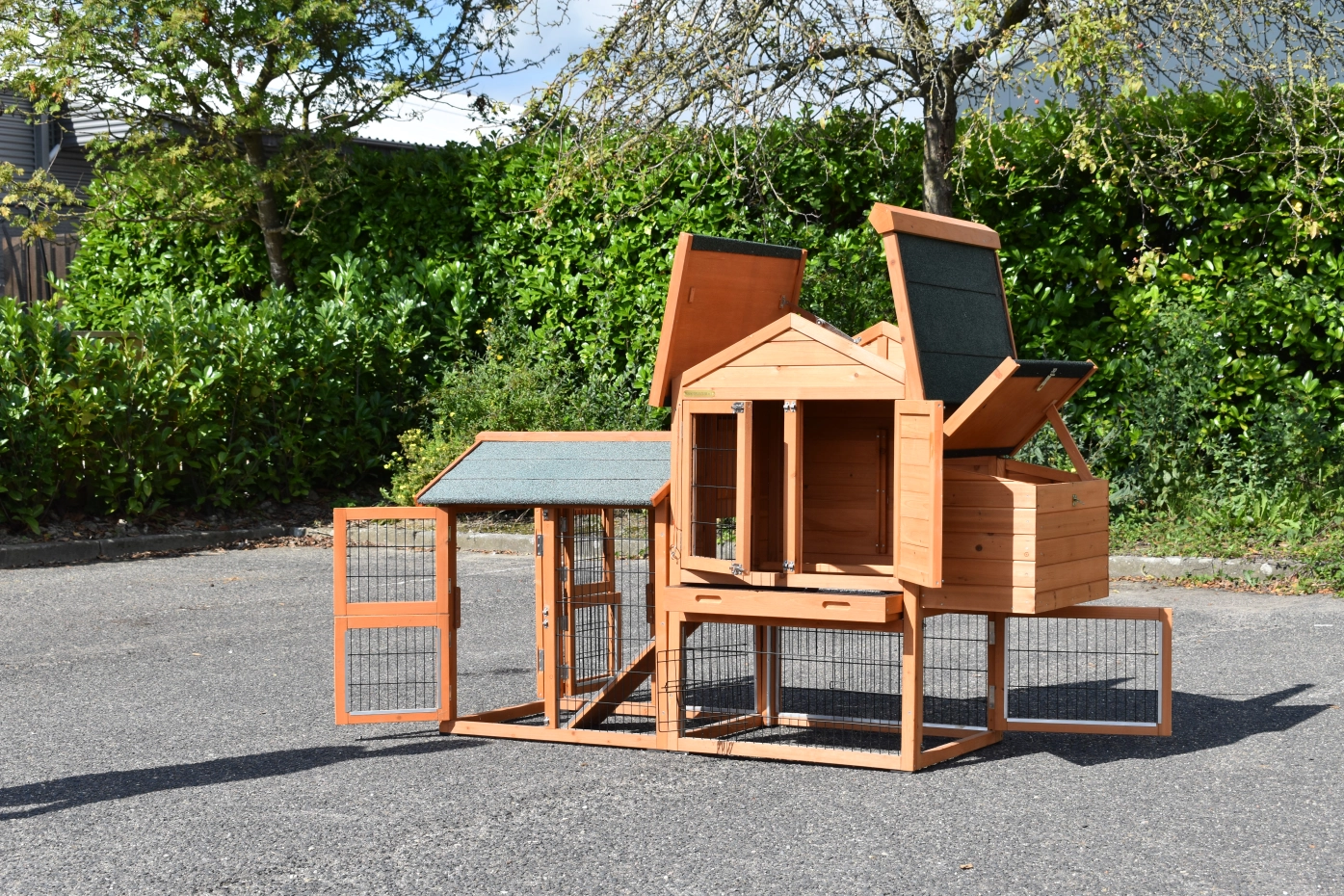 The wood, used for your pet house is a unique natural product which has been processed according to traditional methods in the country of origin, after careful selection. It is characteristic and unique in every way. This wood product has been manually processed. No single piece of wood is the same in shape, structure or color, so color shades are inevitable even within one piece of wood. Wind cracks, imperfections and the presence of large and small knots testify to their origin and years of growth. Bumps are usually manually updated with wood fill. Through use and through the influence of light, new pet houses will finally get a warmer color. Color differences in comparison with the show model or even among themselves are therefore usual. The pet house is stained in the colors as in the picture. You should do it once again to prevent mold and rot. You can easily order the stain together with the pet house.