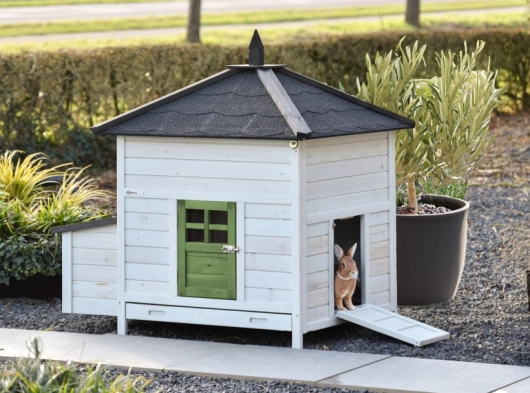 This hutch Ambiance Large is actually a chicken coop but very suitable for housing large rabbits like Flemish Giant rabbits and French Lop rabbits. This coop comes with a nesting box. Please note that this coop is not equipped with aluminum anti-chew strips, which you can purchase separately.