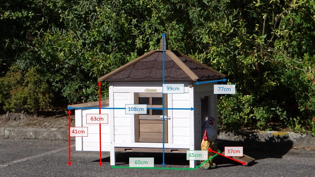 Outer dimensions incl. roof and nest box (WxDxH) 108x77x99cm