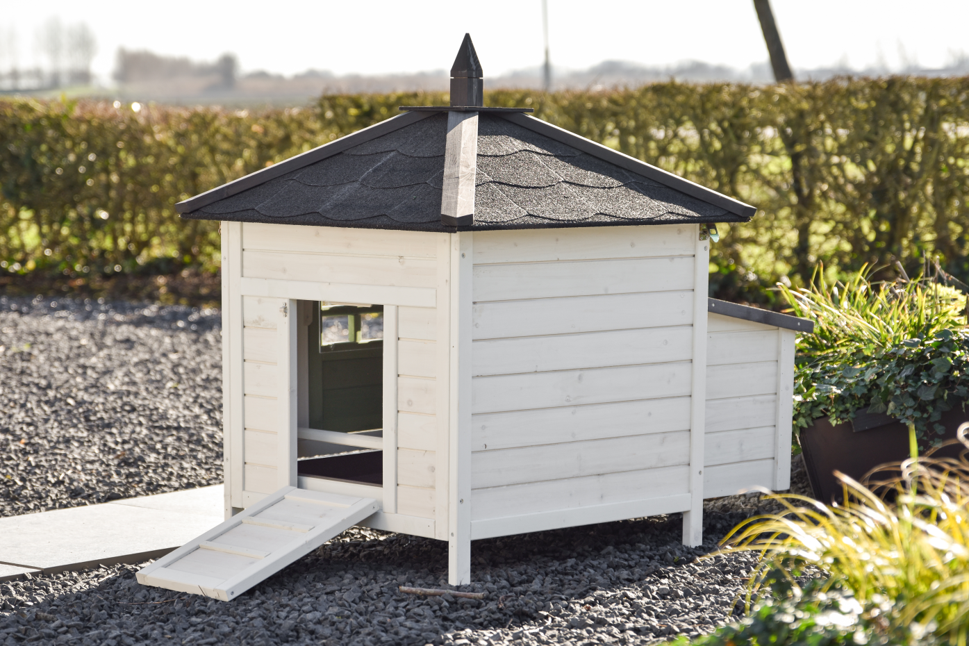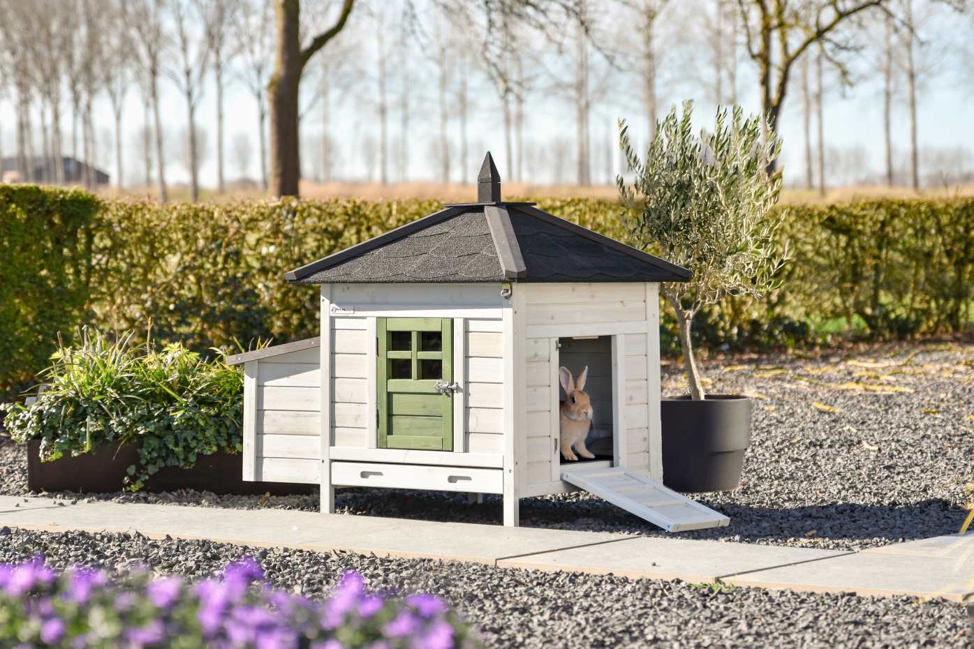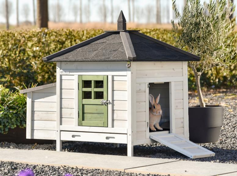 Rabbit hutch Ambiance Small is a real eye-catcher in the garden and combines an attractive look with practical use. The hutch has a plastic pull-out tray, a fully removable roof for easy cleaning and a side door that also serves as a ramp. The hutch looks great in a large rabbit run but can also be expanded with extension runs made especially for this model