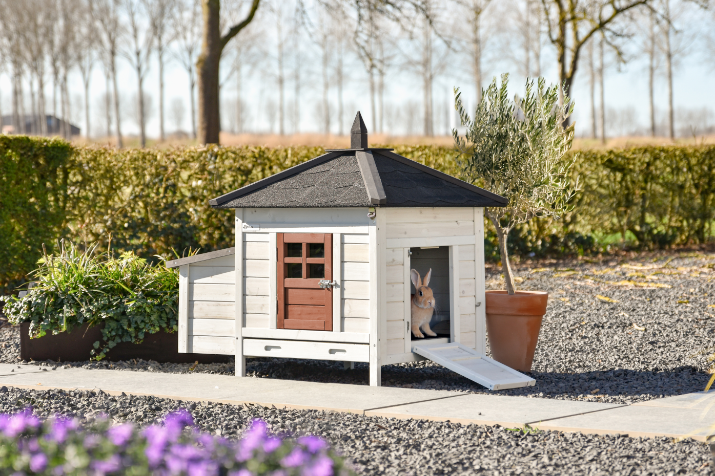 Rabbit hutch Ambiance Small is a real eye-catcher in the garden and combines an attractive look with practical use. The hutch has a plastic pull-out tray, a fully removable roof for easy cleaning and a side door that also serves as a ramp. The hutch looks great in a large rabbit run but can also be expanded with extension runs made especially for this model