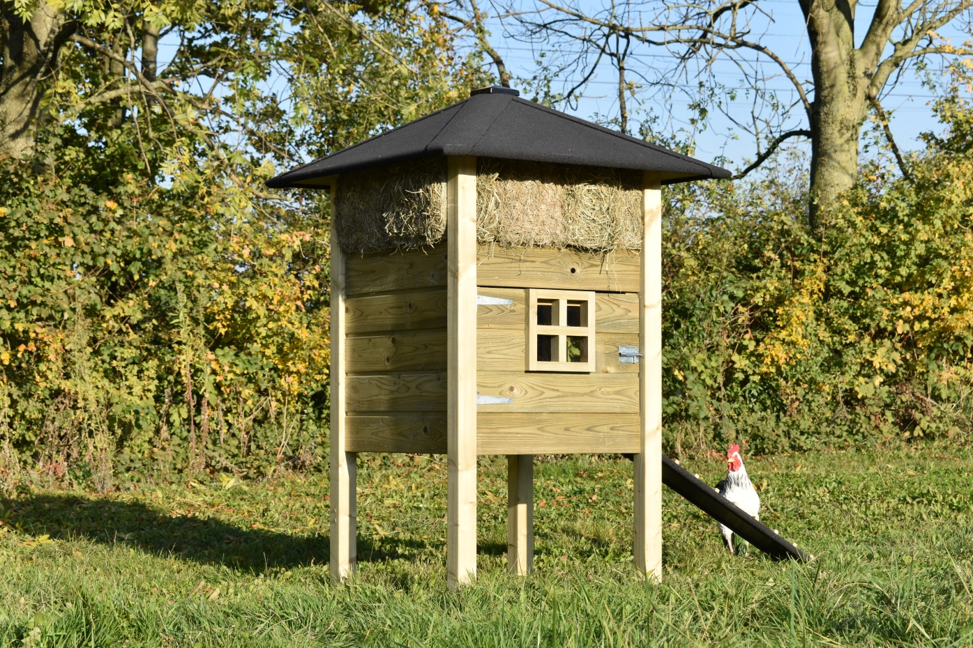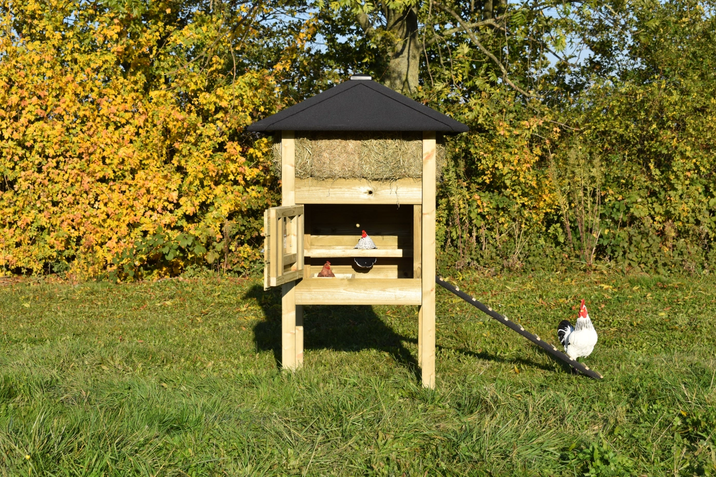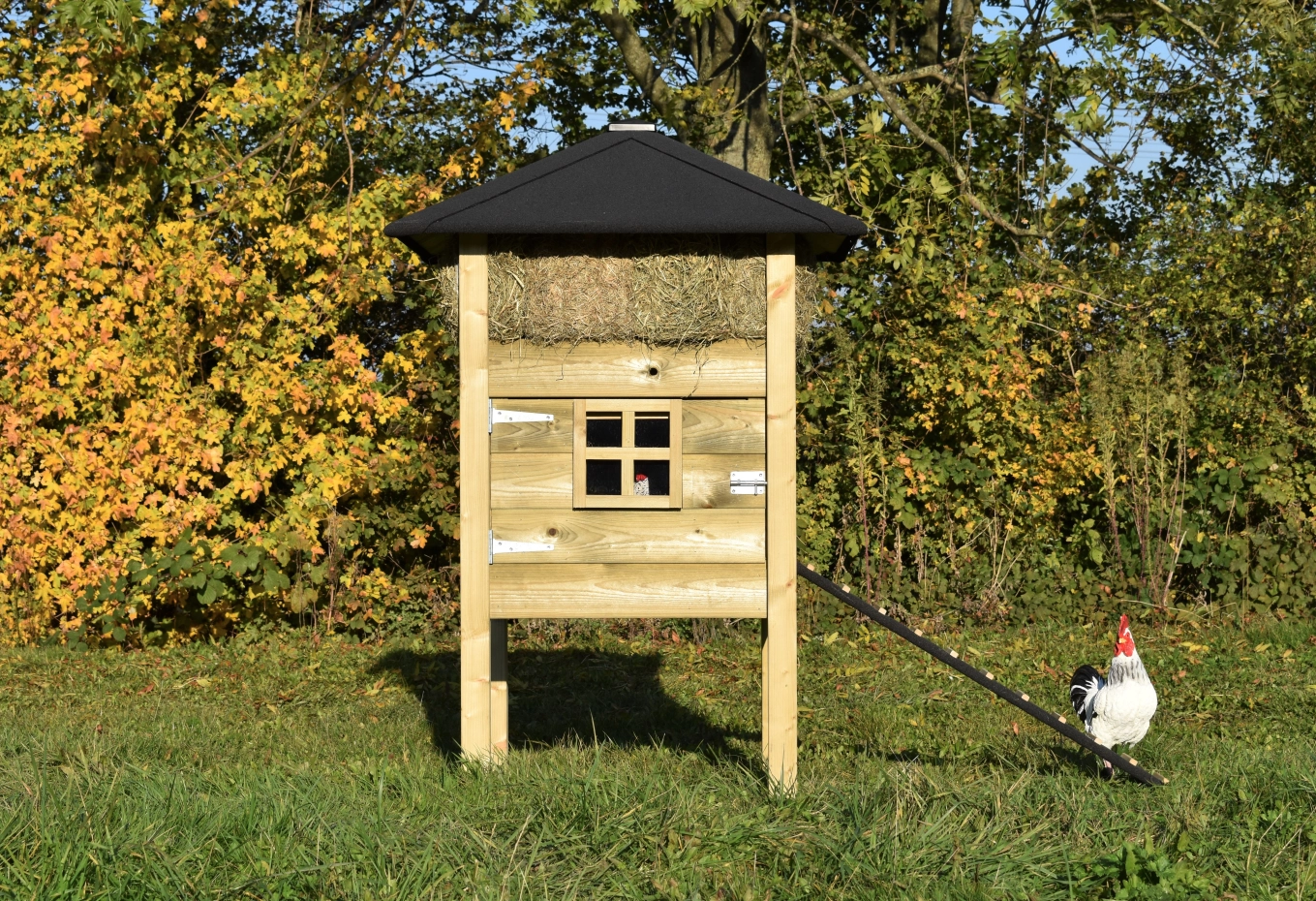Rabbit hutch haystack Rosanne is made of impregnated wood. You can also order hay with it. Because of the large door you can clean the sleeping compartment very easily. The hutch is also available with roof shingles.