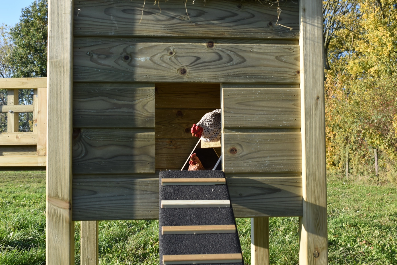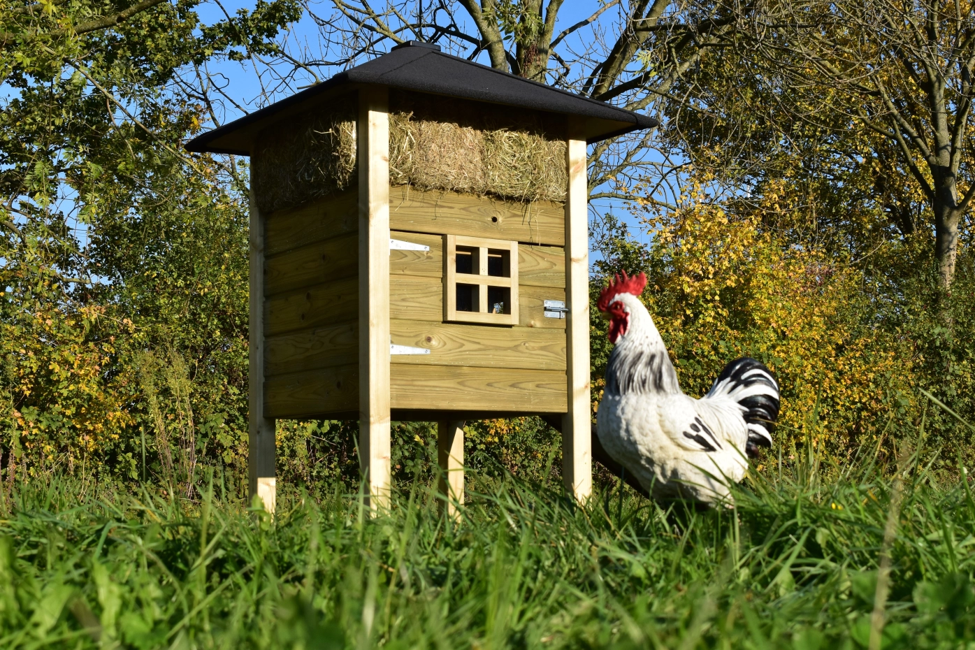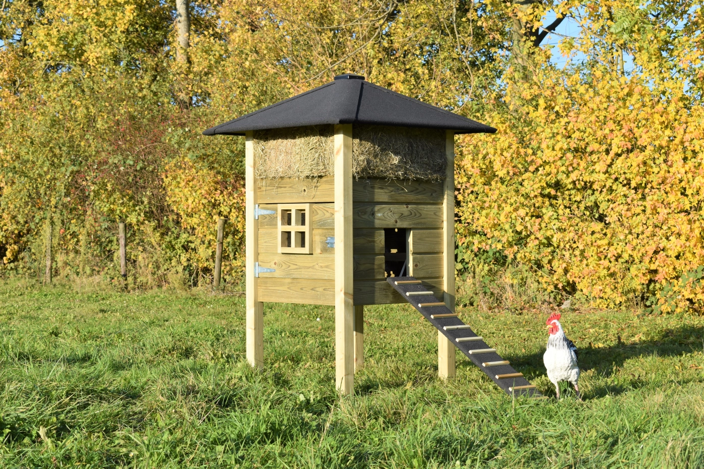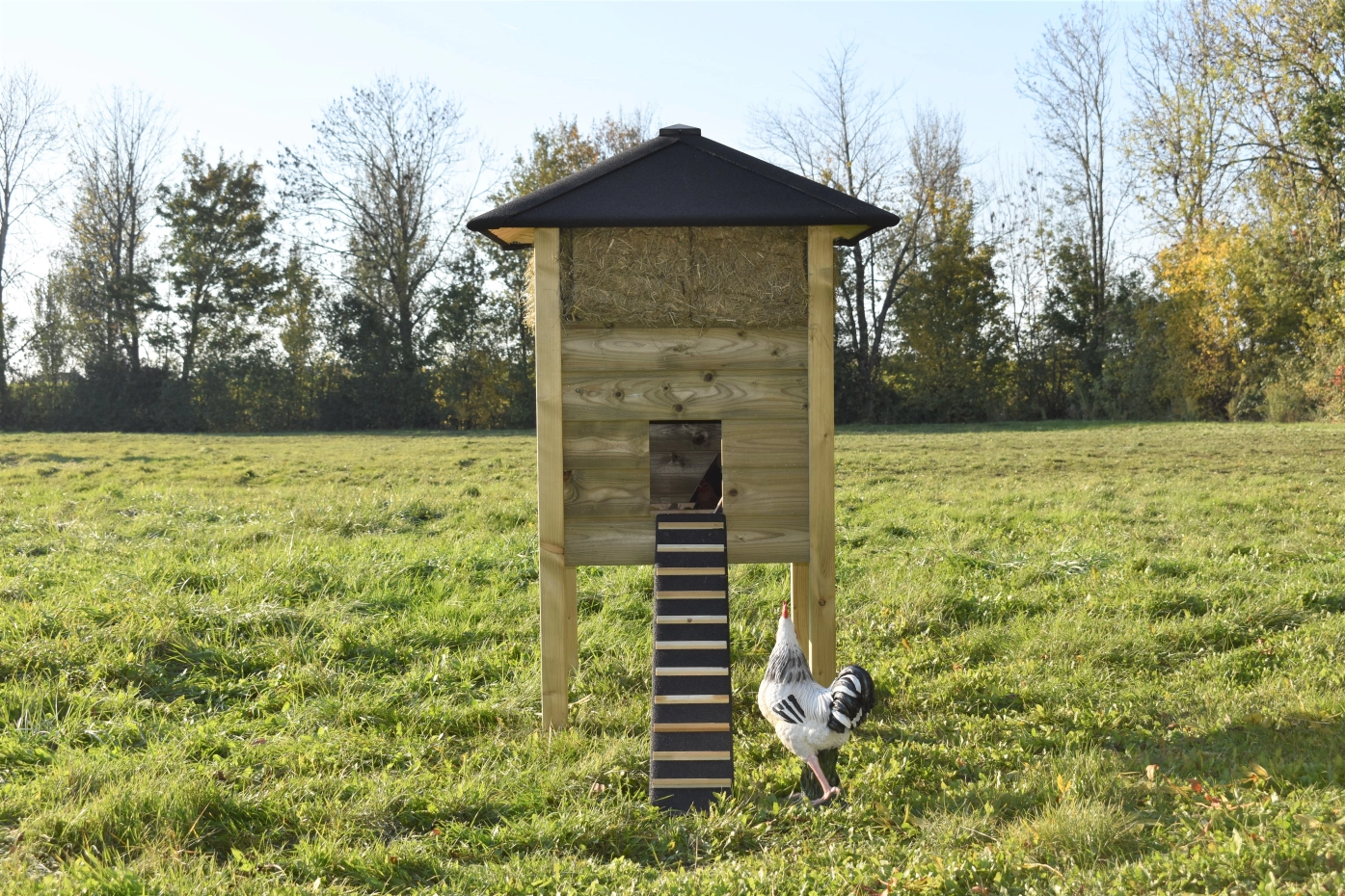 Rabbit hutch haystack Rosanne is made of impregnated wood. You can also order hay with it. Because of the large door you can clean the sleeping compartment very easily. The hutch is also available with roof shingles.