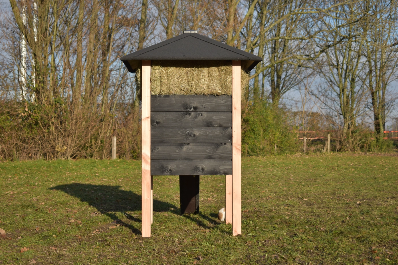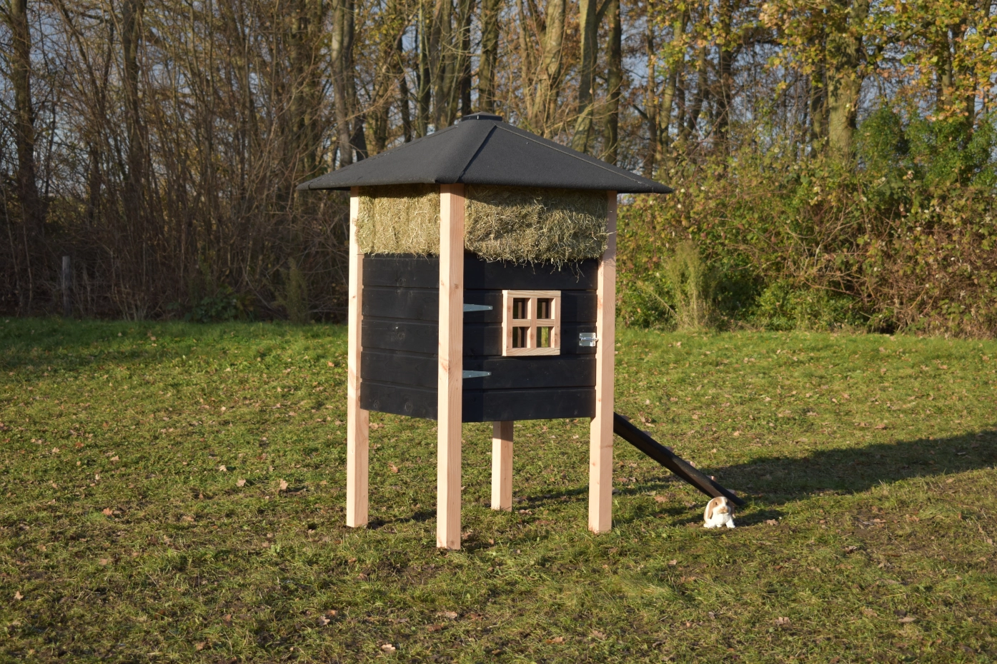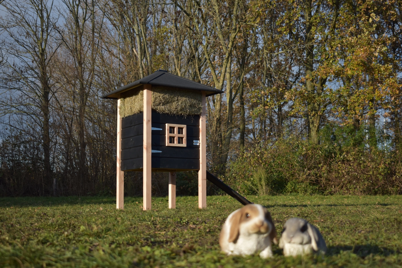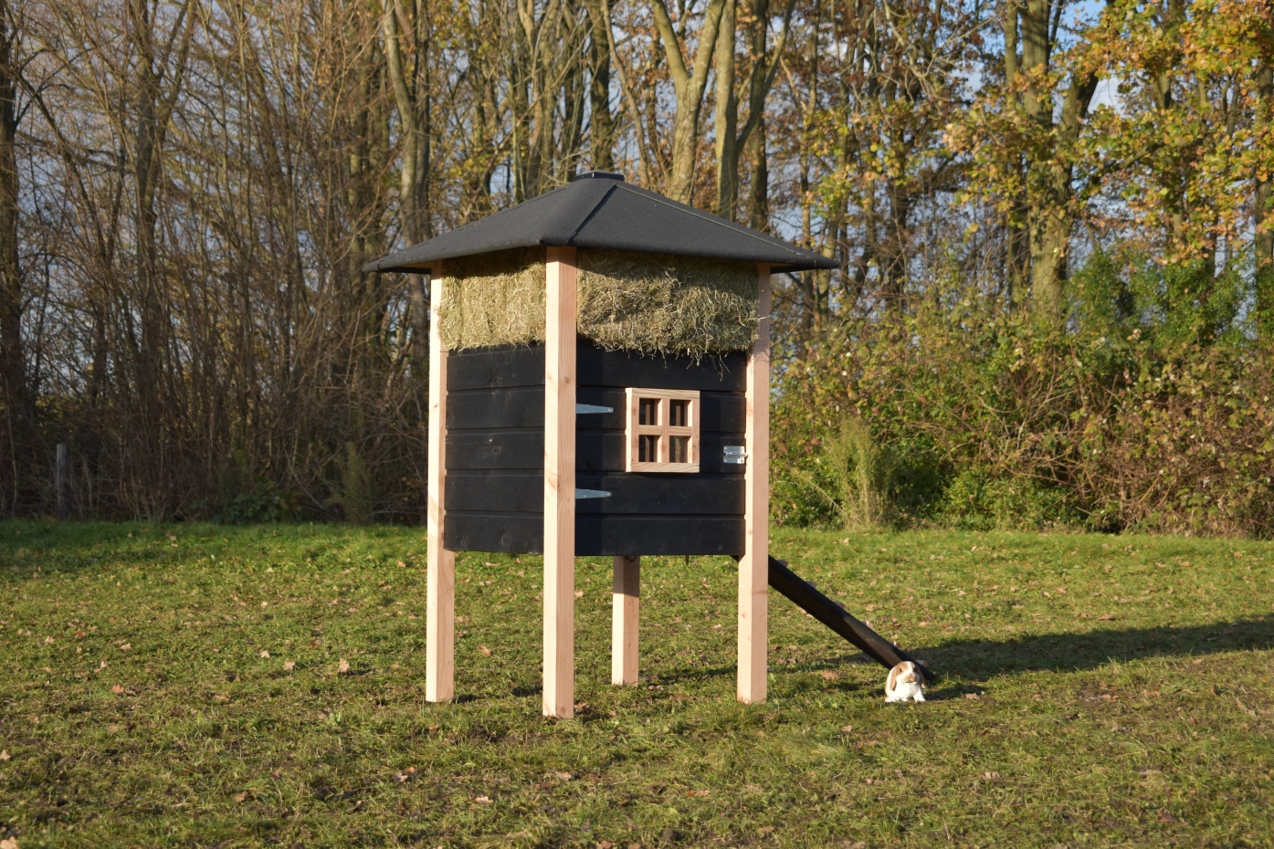 Rabbit hutch haystack Rosanne is made of Douglaswood and black impregnated wood. You can also order hay with it. Because of the large door you can clean the sleeping compartment very easily. The hutch is also available with roof shingles.