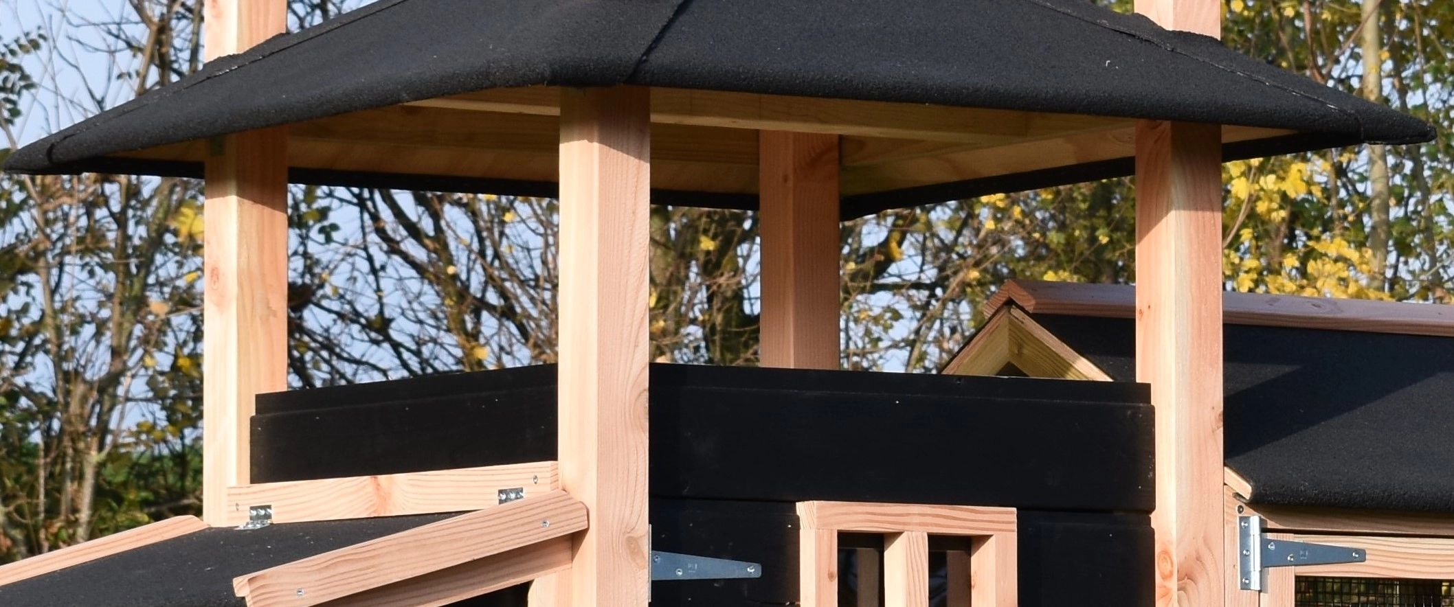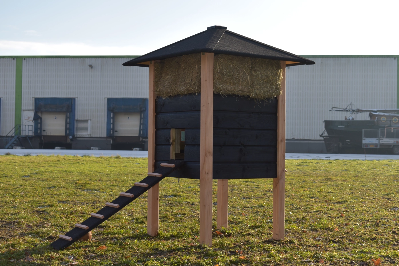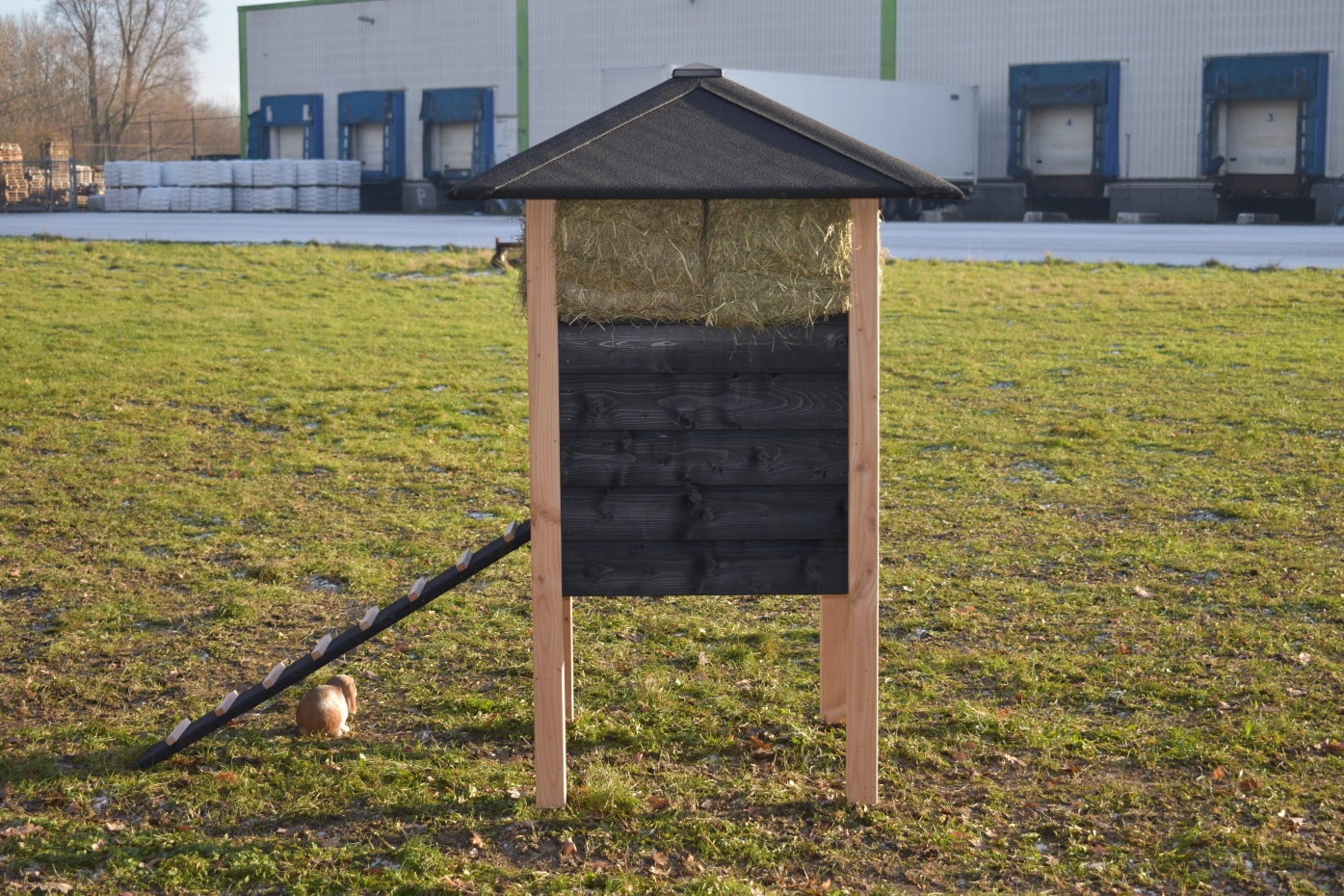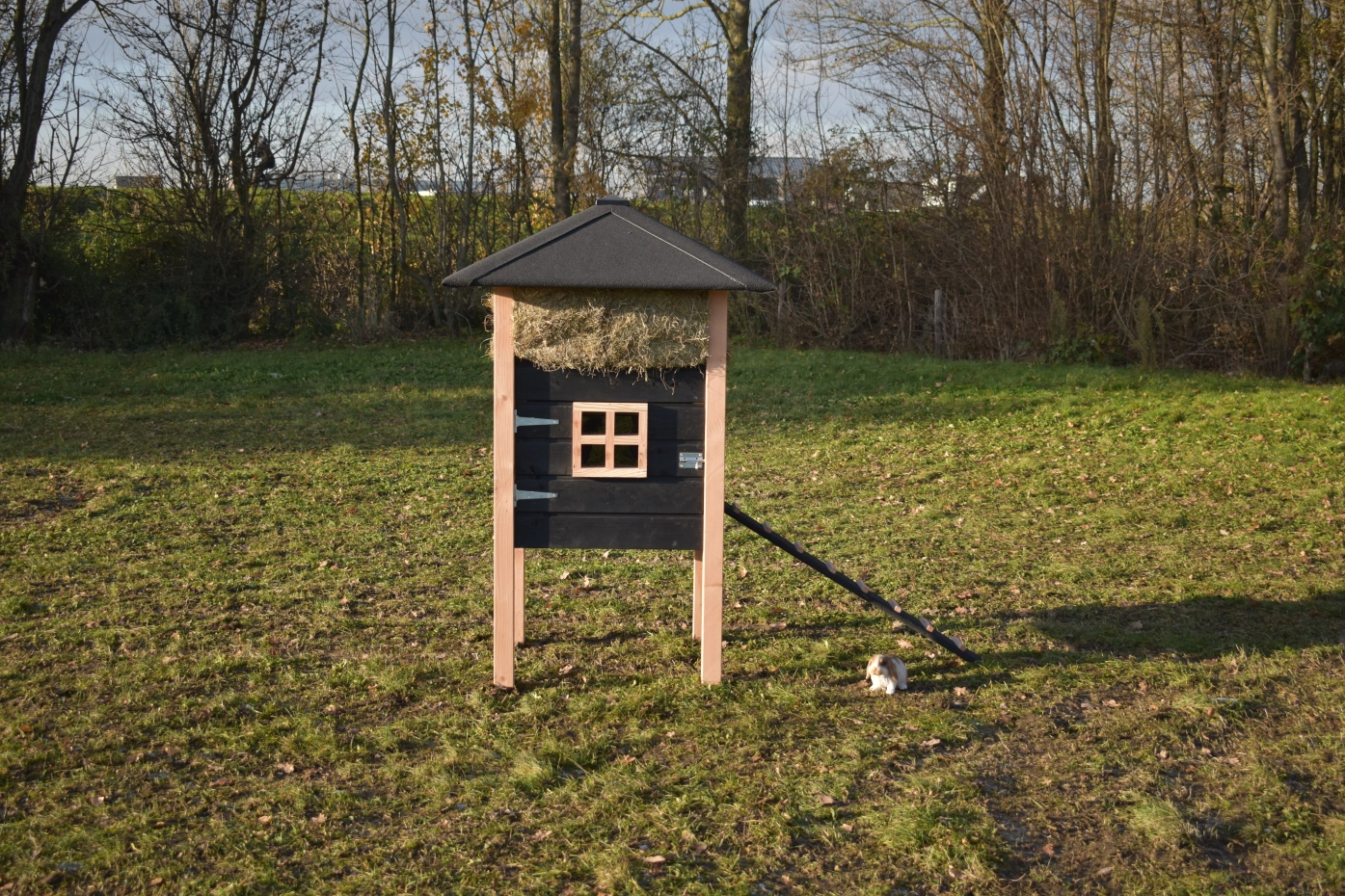 Rabbit hutch haystack Rosanne is made of Douglaswood and black impregnated wood. You can also order hay with it. Because of the large door you can clean the sleeping compartment very easily. The hutch is also available with roof shingles.