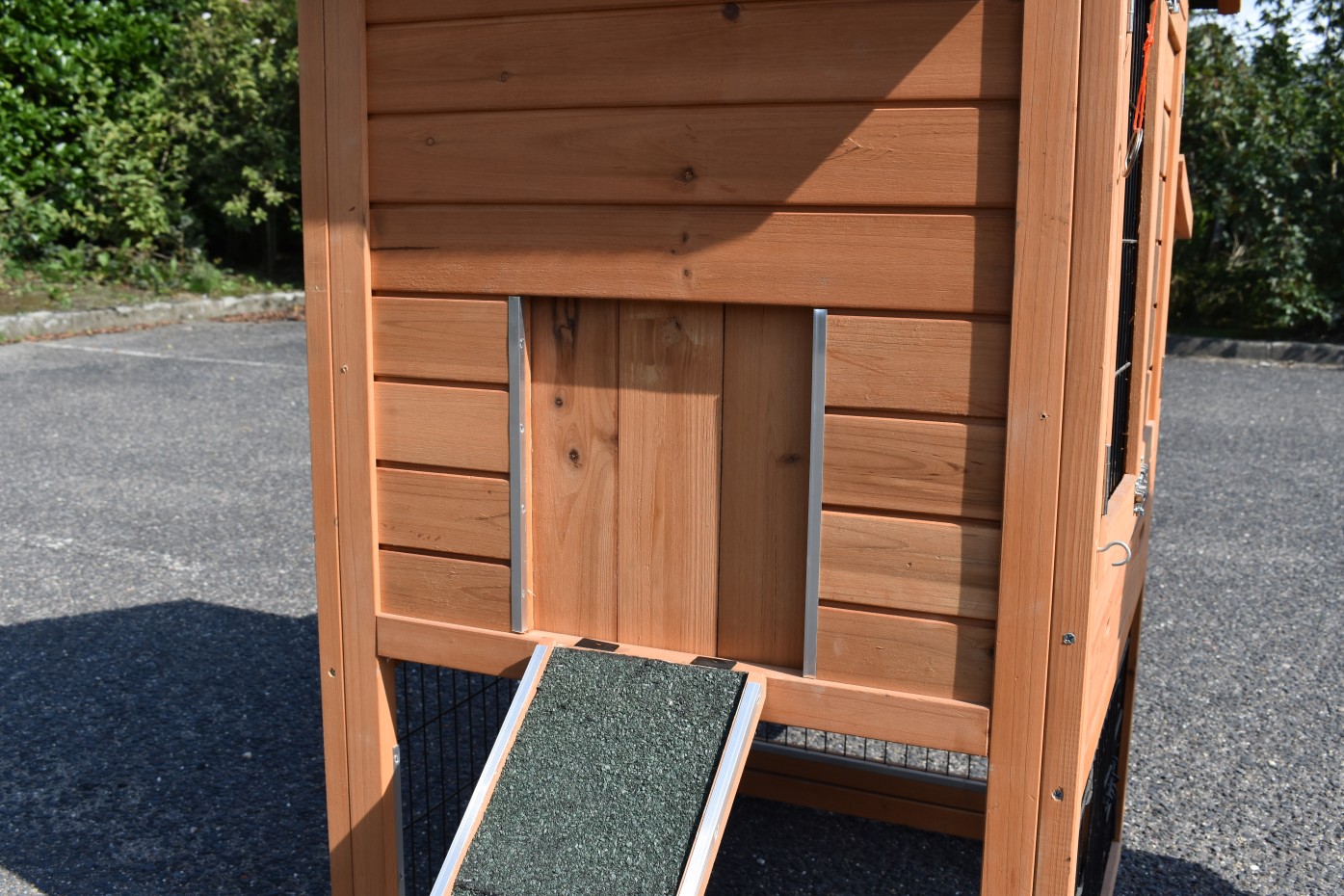 This pet house is made from pine wood in the traditional way. Pine wood is a particularly beautiful kind of coniferous wood which has been valued for a long time in our range of pet houses. Especially the wood grain, flame drawing, and changing color shades give the enclosure a solid and warm appearance.
