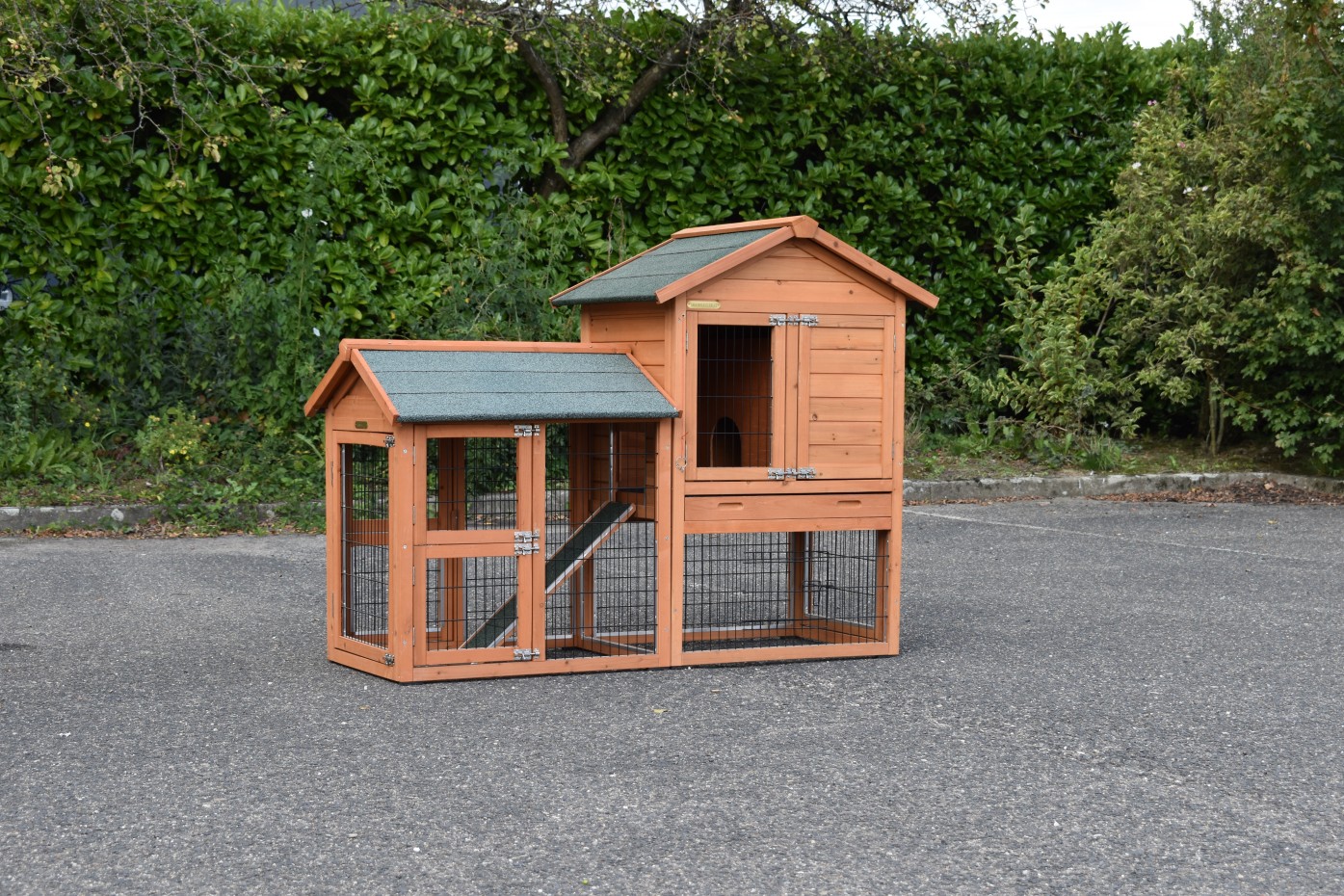 The Prestige Small Rabbit Hutch with run provides your rabbits with a safe and comfortable home. Its spacious doors and practical pull-out plastic tray make cleaning easy, while anti-chew edges and rubber feet add durability. Overall dimensions: 162 × 72 × 122 cm.