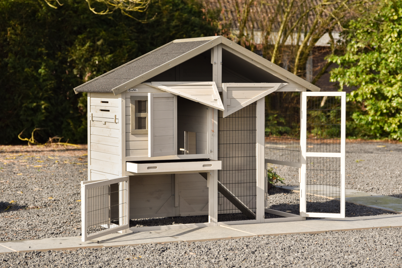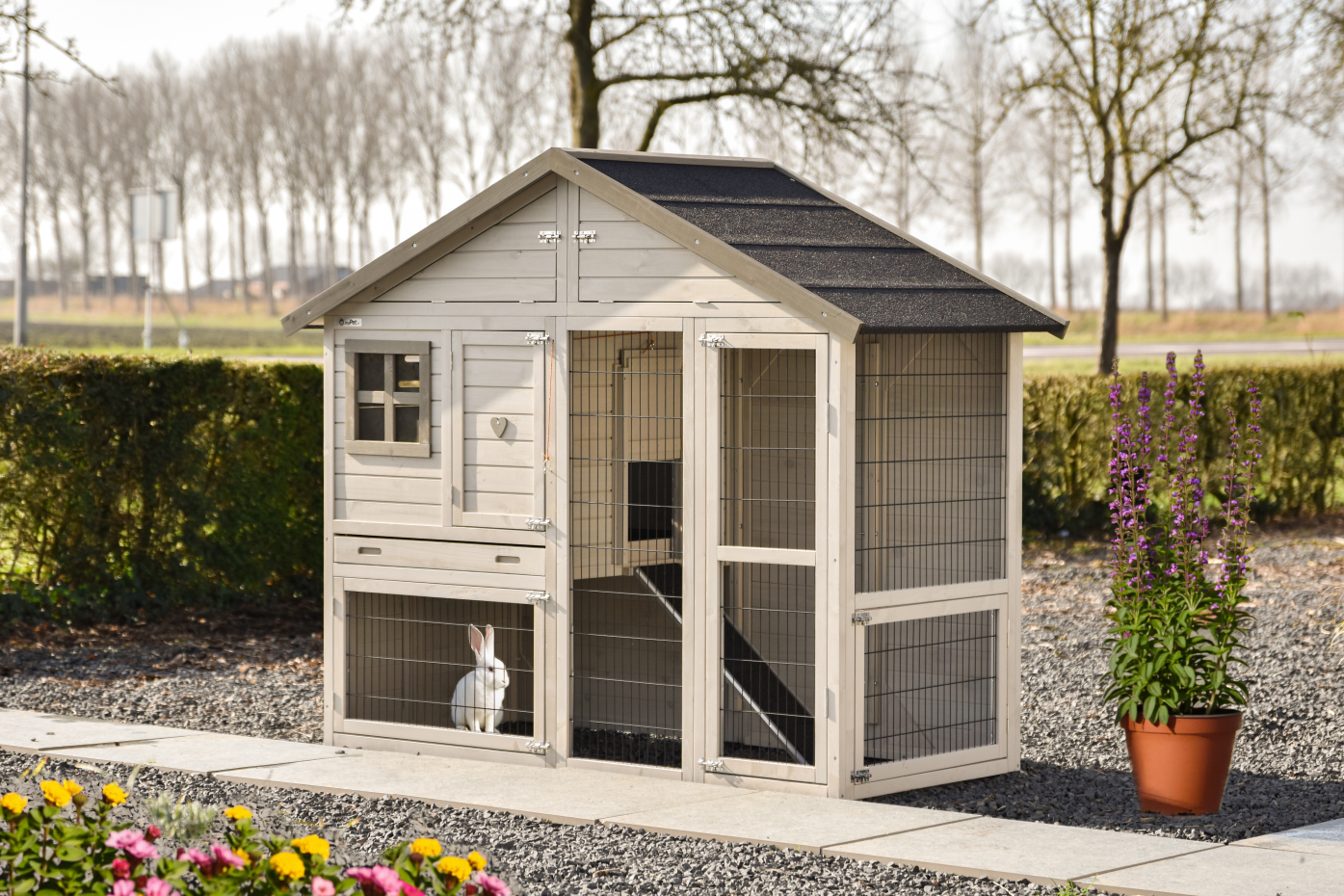 The rabbit hutch Holiday Medium Light-grey is the mid-sized model in the popular Holiday range, offering the perfect blend of comfort and versatility. It can be expanded with a variety of outdoor runs, giving your rabbit extra space to explore. Using the Joypet 3D design module, you can easily create a setup that perfectly suits your needs.