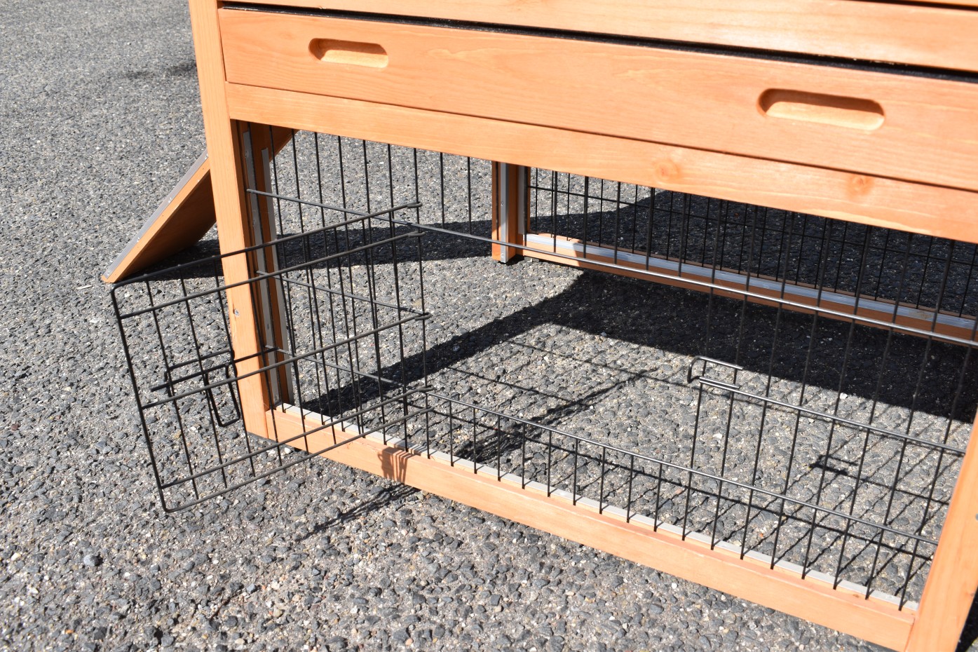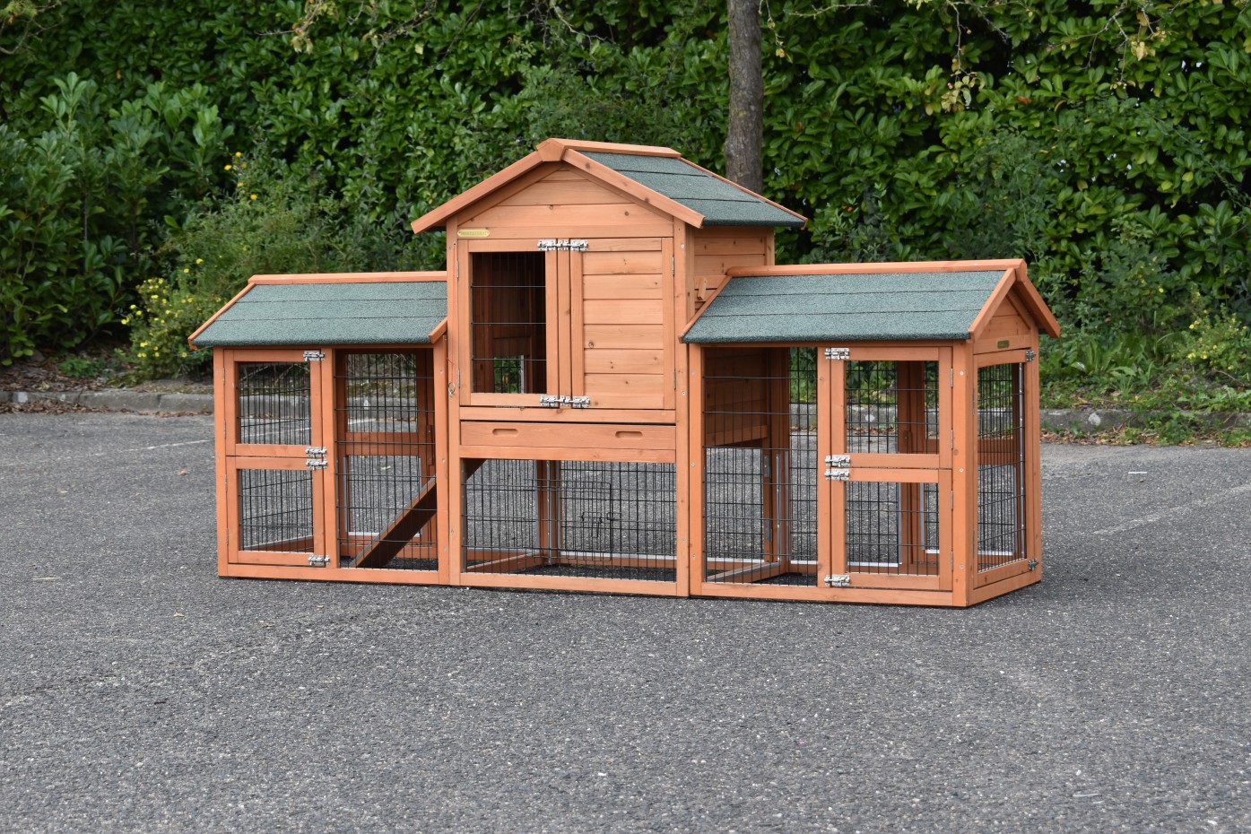 The Prestige Small Rabbit Hutch with 2 runs is beautifully designed with spacious doors all around and durable anti-chew protection. A handy storage loft above the sleeping area and an easy-to-clean pull-out plastic tray make it very practical. Dimensions: 237 × 72 × 122 cm.