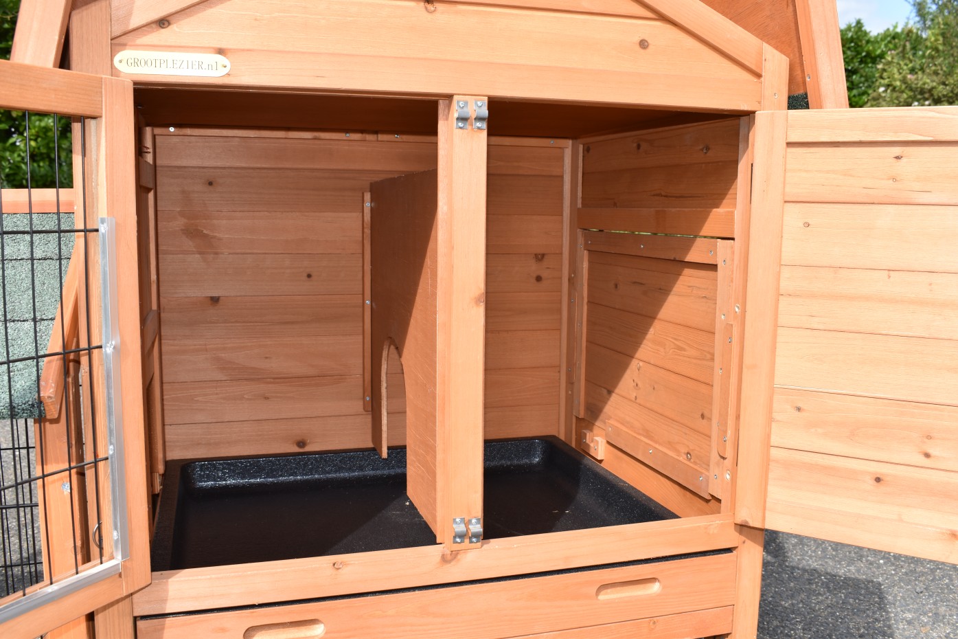 This pet house is made from pine wood in the traditional way. Pine wood is a particularly beautiful kind of coniferous wood which has been valued for a long time in our range of pet houses. Especially the wood grain, flame drawing, and changing color shades give the enclosure a solid and warm appearance.