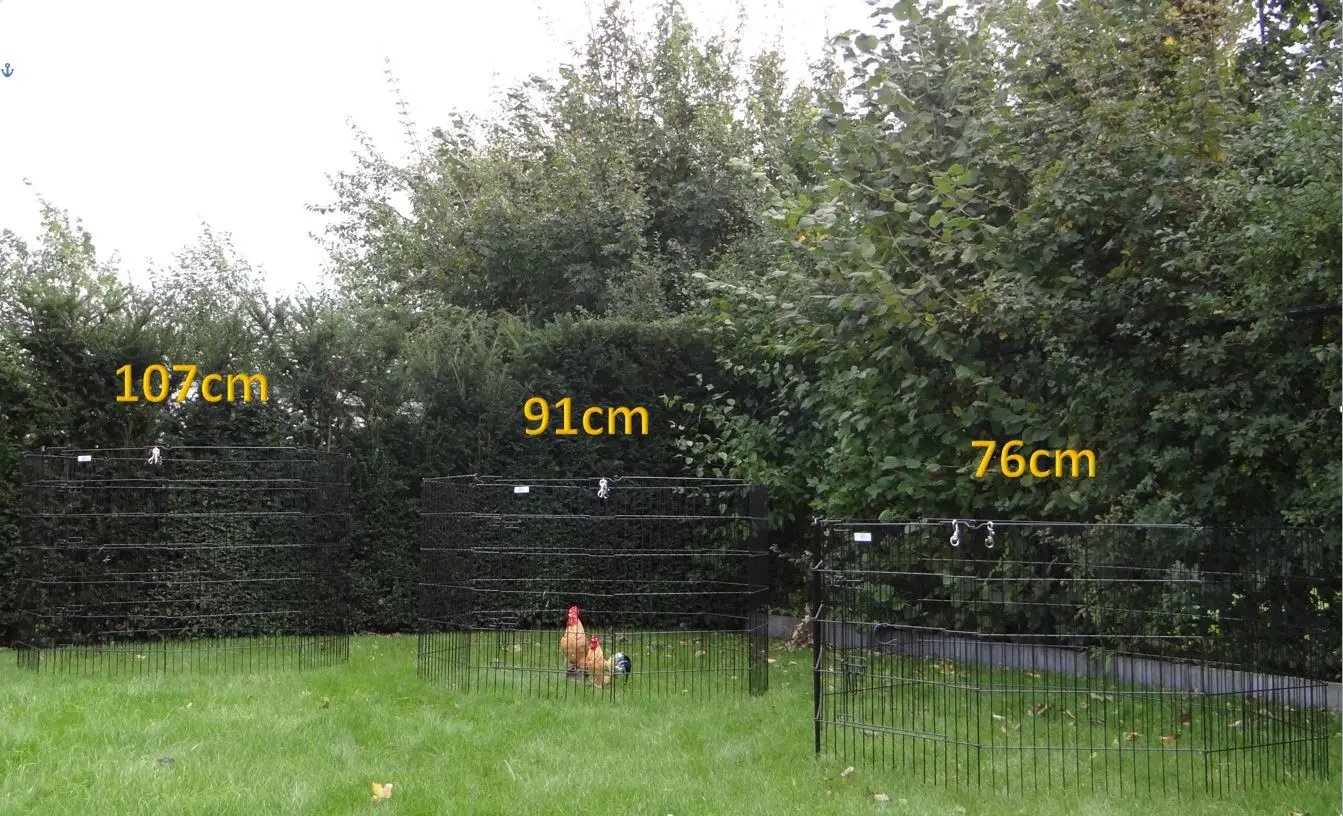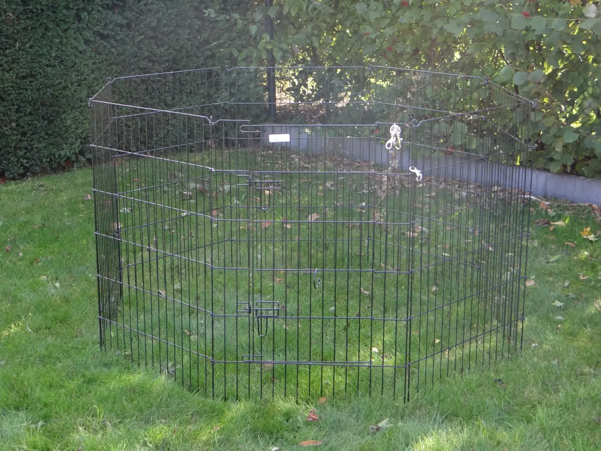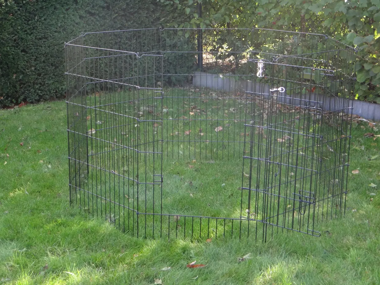 This heavy-duty free-range enclosure has a height of 91cm. This heavy, double-powder-coated, easily foldable rabbit enclosure can be set up in any desired shape. The spacing between the bars is approximately 38mm. The rabbit enclosure consists of 8 panels of 60x91cm. It is also possible to connect multiple of these enclosures together. This enclosure can also be used as an extension run for your rabbit hutch, creating plenty of space for your rabbits. Additionally, this enclosure is suitable as a chicken run to expand the chicken coop or existing outdoor run.