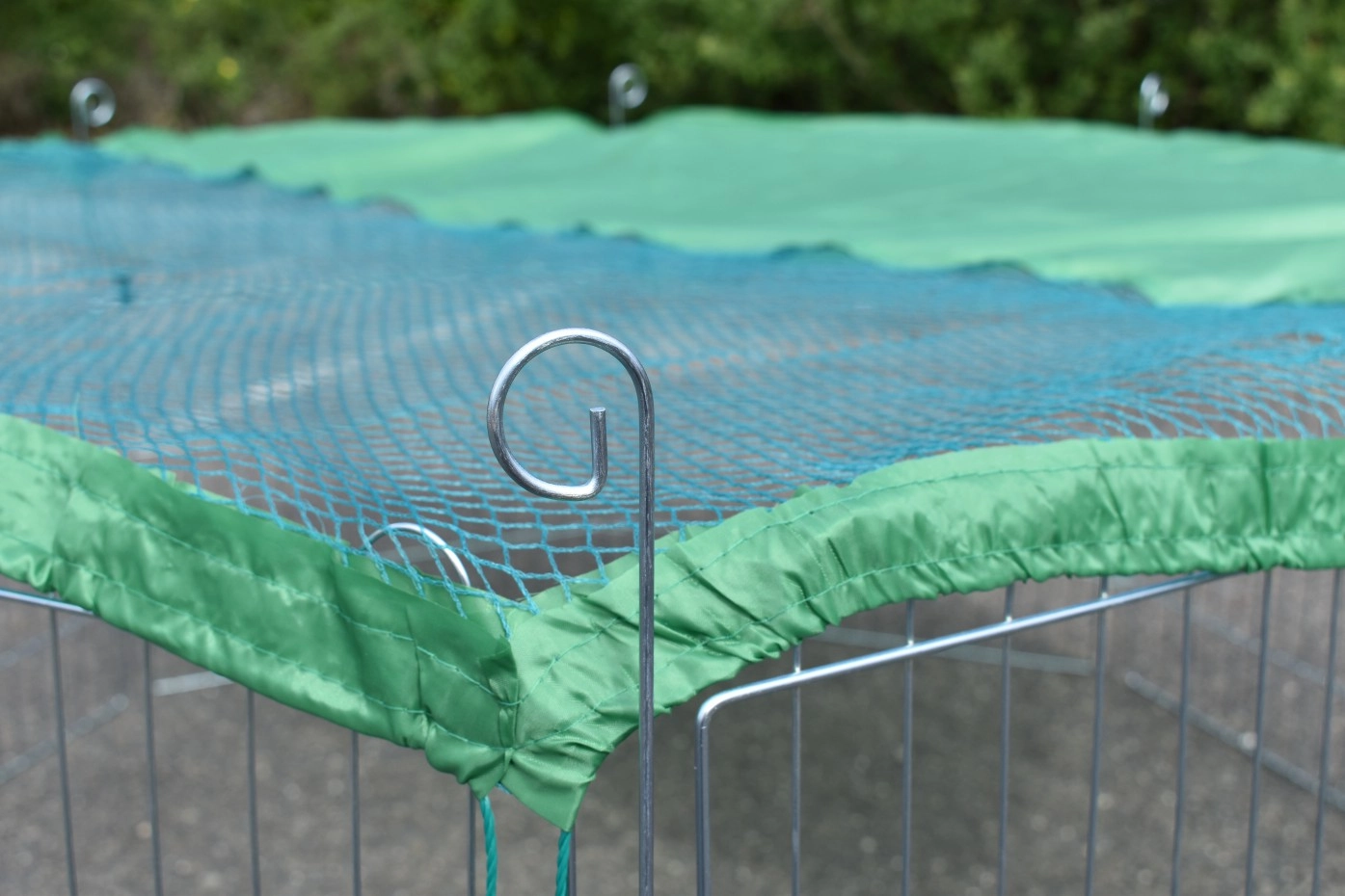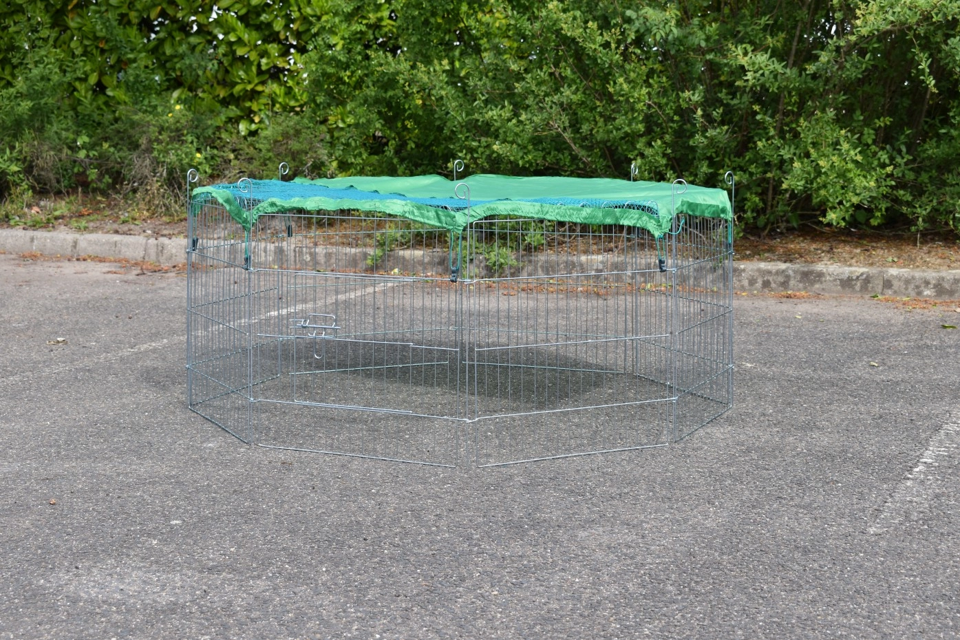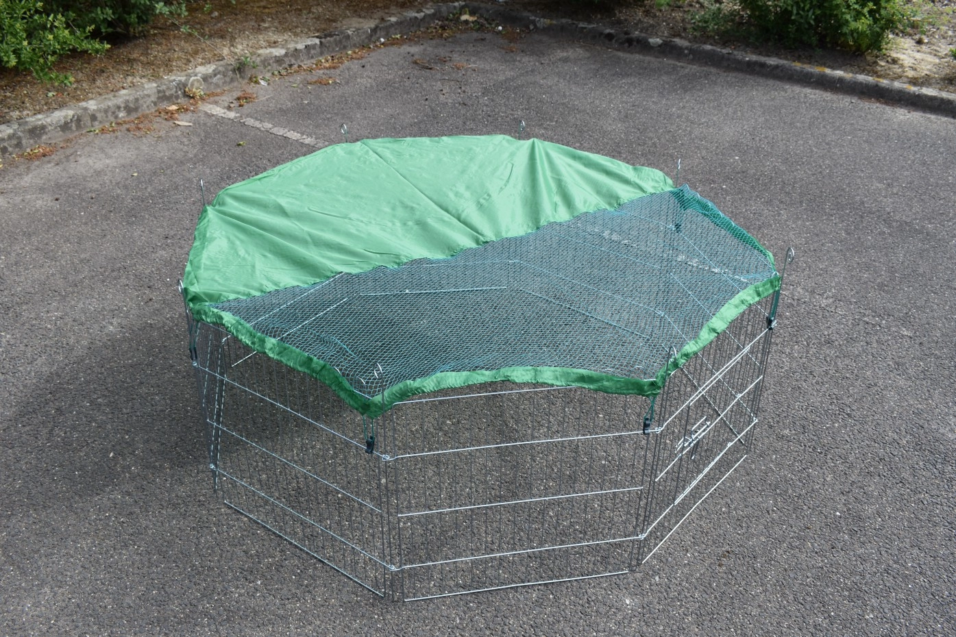Rabbit enclosure / guinnea pig enclosure 60cm. This easily foldable enclosure can be set up in any desired shape. The enclosure consists of 8 panels of 60x60cm, 1 panel has a little door. The enclosure is provided with a cover in combination with a sunshade, so that the run also can be used for guinnea pigs. With the enclosed connections pins can the run be fastened in the ground.