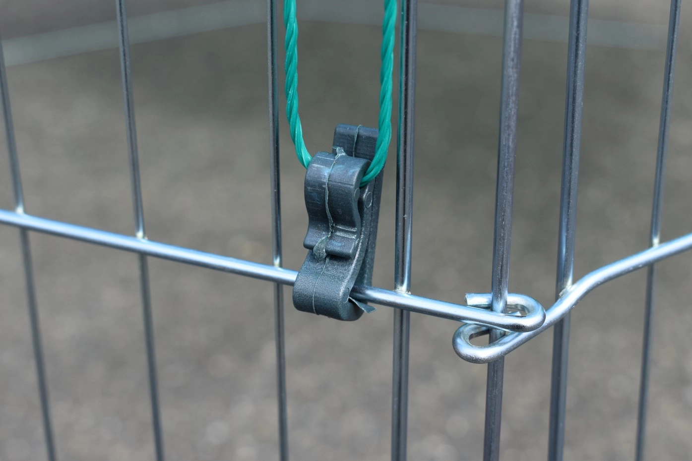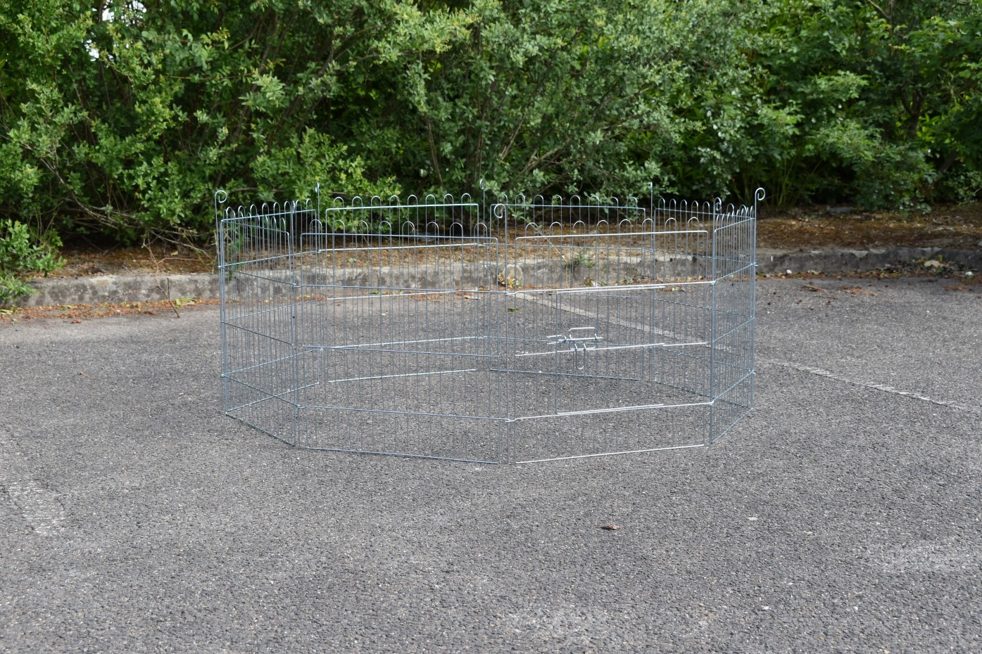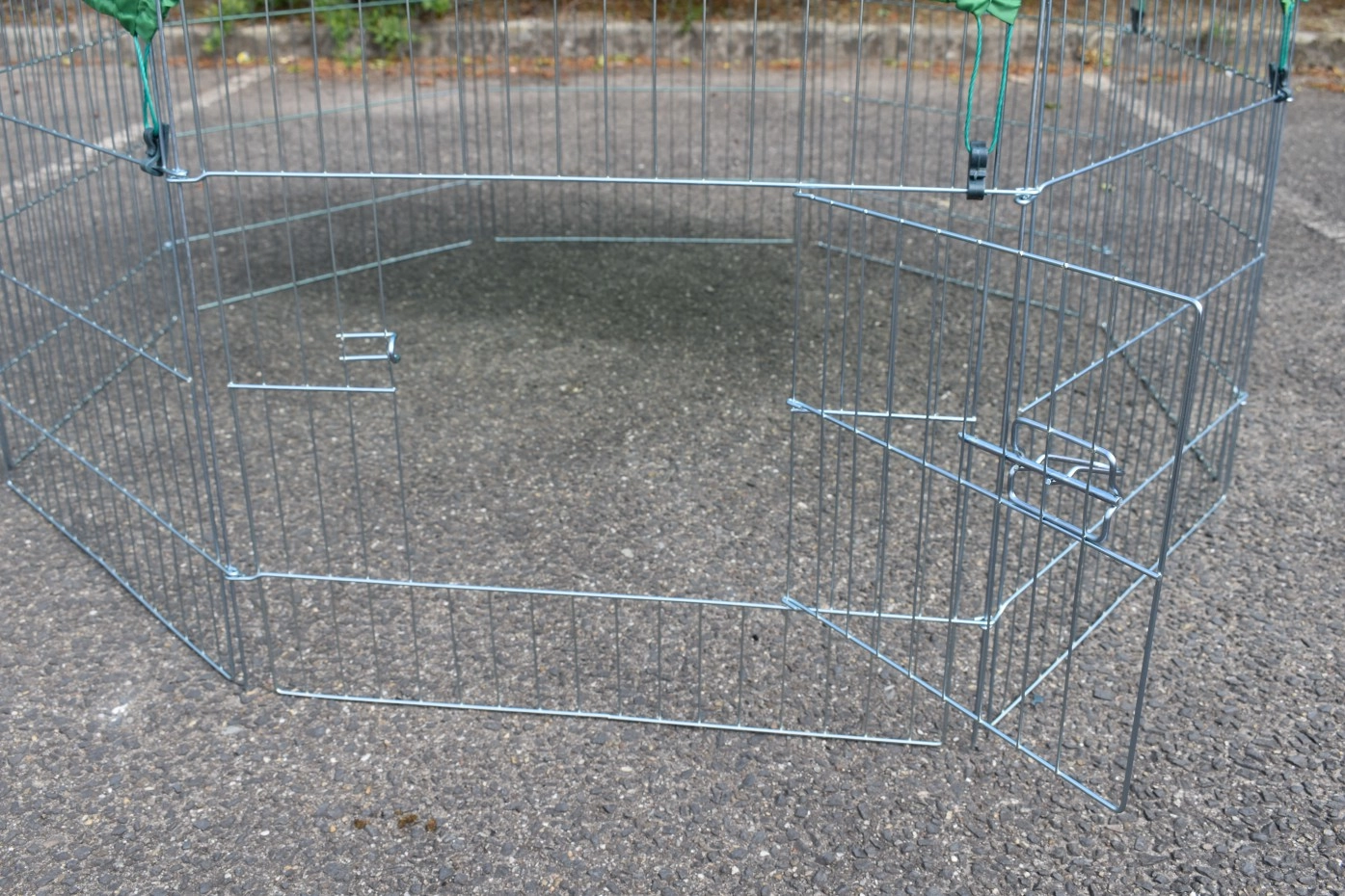 Rabbit enclosure / guinnea pig enclosure 60cm. This easily foldable enclosure can be set up in any desired shape. The enclosure consists of 8 panels of 60x60cm, 1 panel has a little door. The enclosure is provided with a cover in combination with a sunshade, so that the run also can be used for guinnea pigs. With the enclosed connections pins can the run be fastened in the ground.