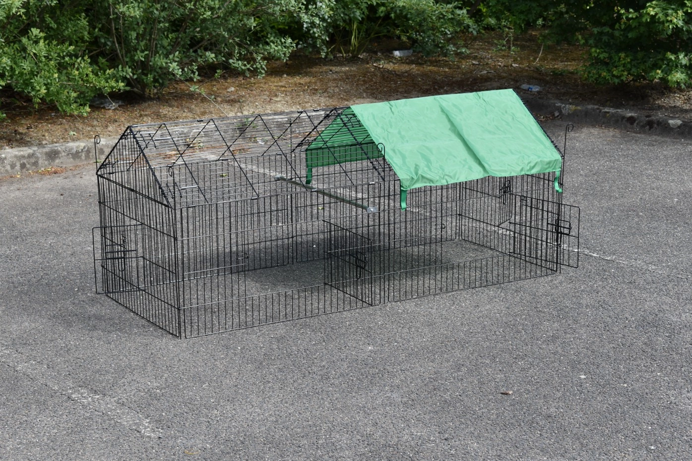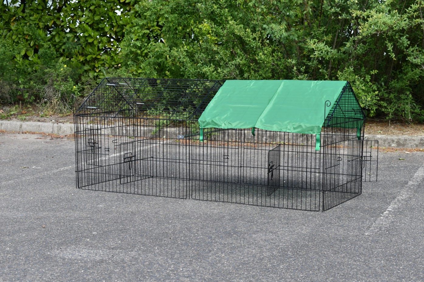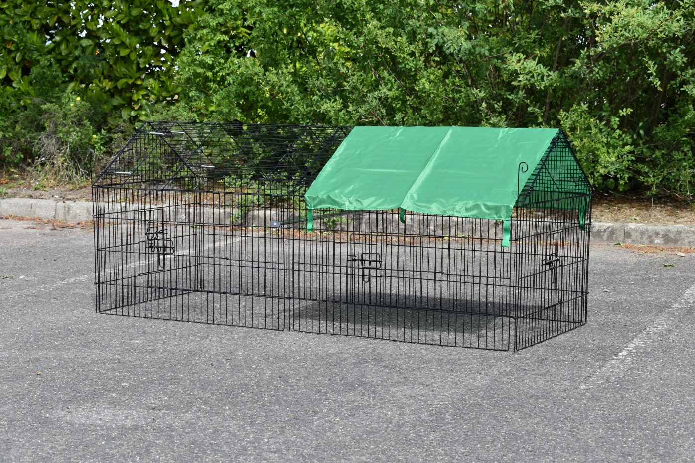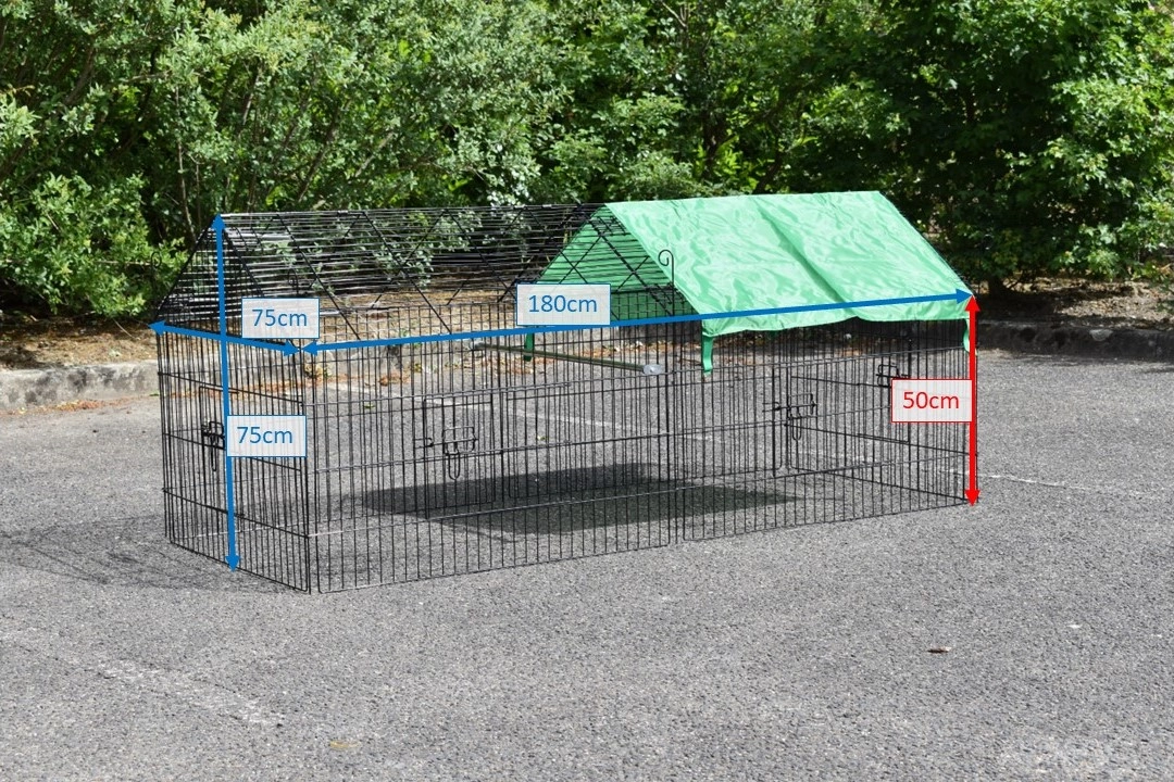 Pointed-roof rabbit enclosure Elynn with sunshade is an enclosure, made of black-powdered steel grating. The rabbit enclosure with sunshade can be used for rabbits, chickens, kittens or puppy's. This enclosure with sunshade is provided with 4 doors in the grating. The enclosure is expandable in many ways, and easily to combine with most chicken coops or rabbit hutches. The side of the run (the steep part) is approx. 50cm high.