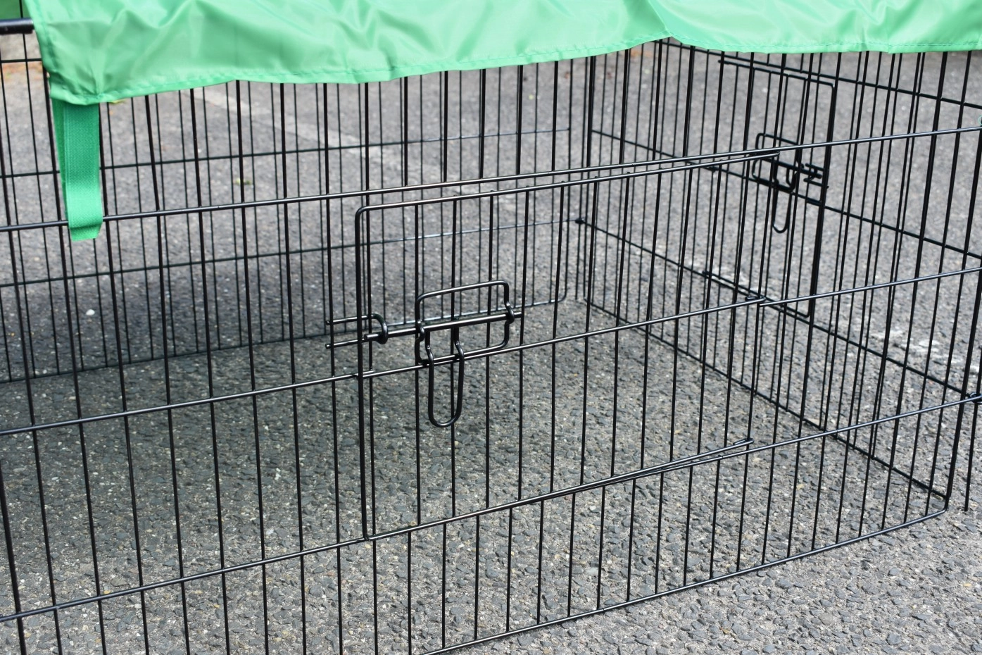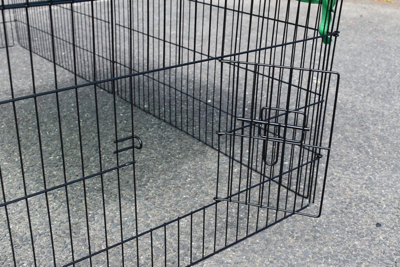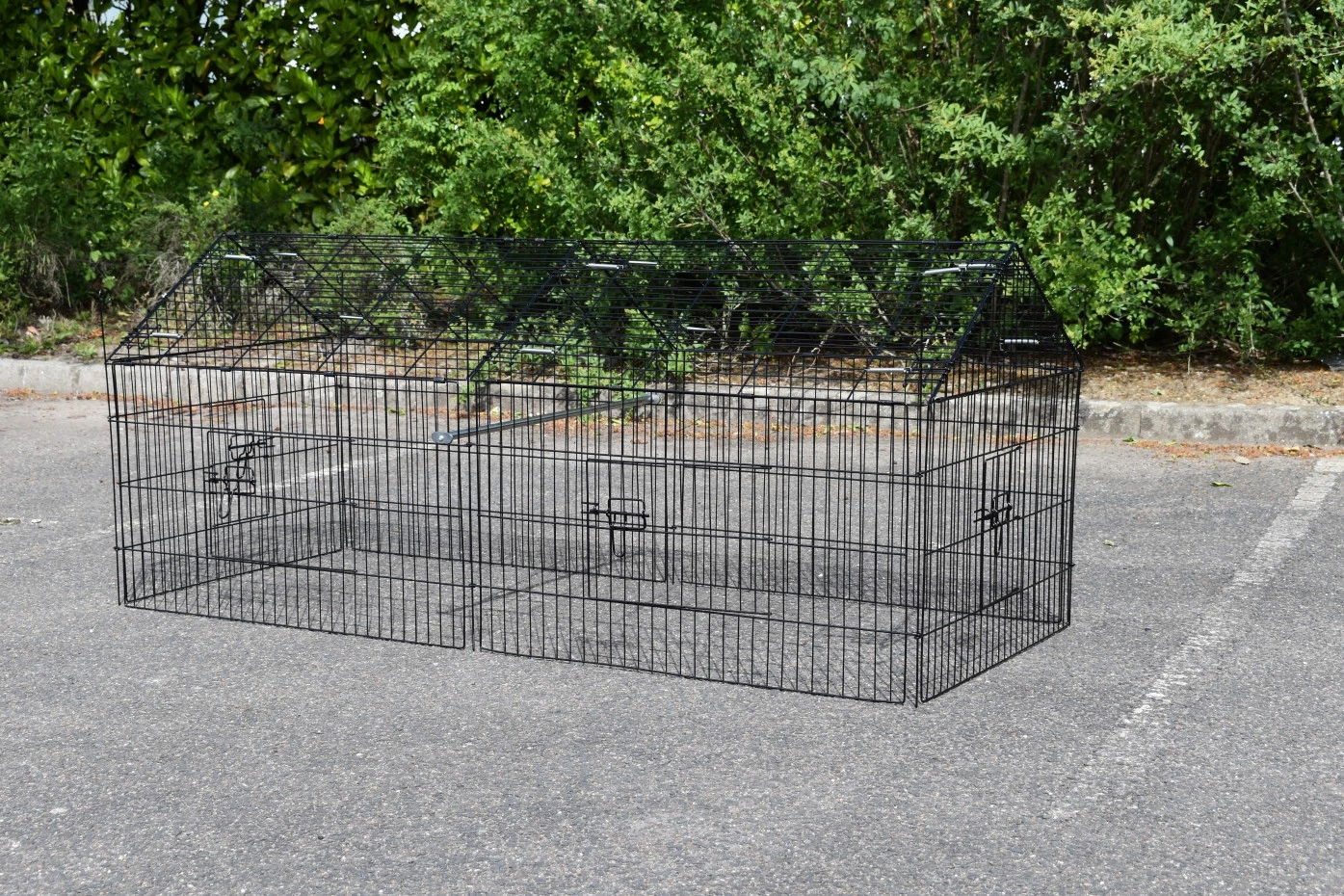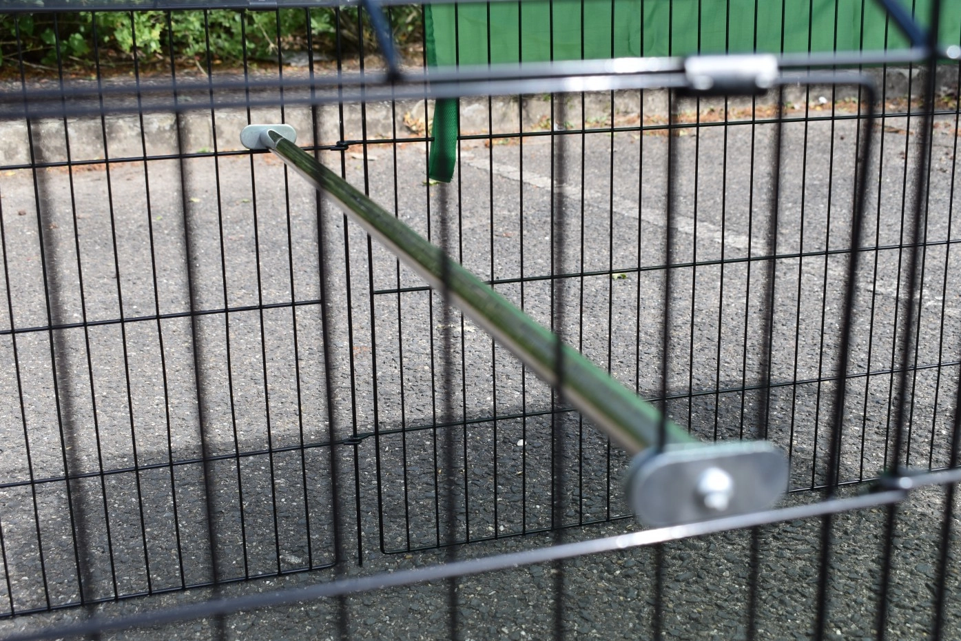Pointed-roof rabbit enclosure Elynn with sunshade is an enclosure, made of black-powdered steel grating. The rabbit enclosure with sunshade can be used for rabbits, chickens, kittens or puppy's. This enclosure with sunshade is provided with 4 doors in the grating. The enclosure is expandable in many ways, and easily to combine with most chicken coops or rabbit hutches. The side of the run (the steep part) is approx. 50cm high.