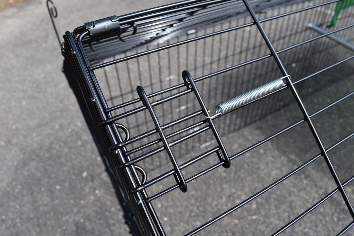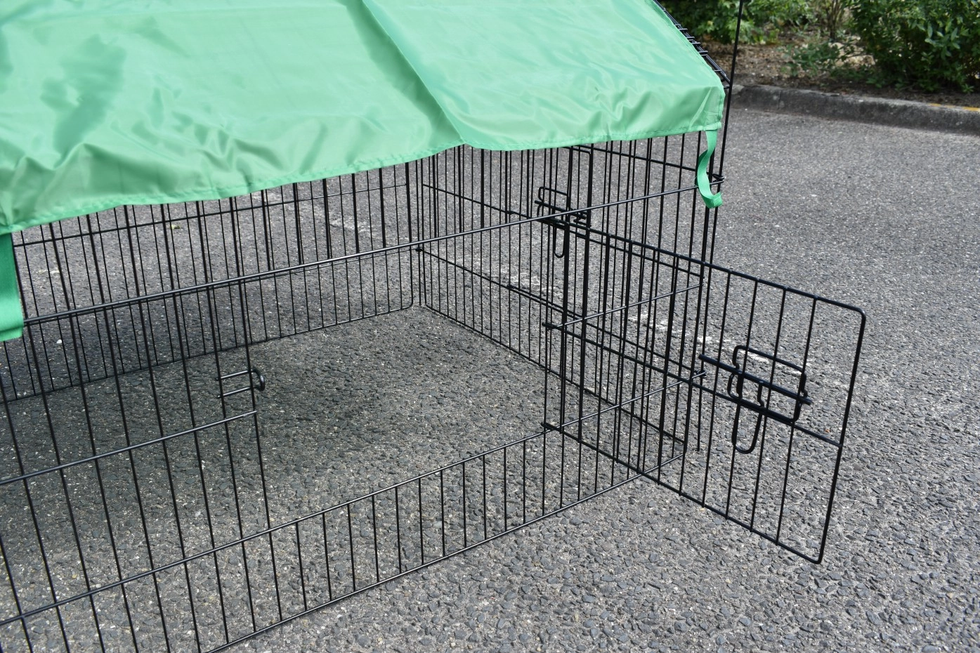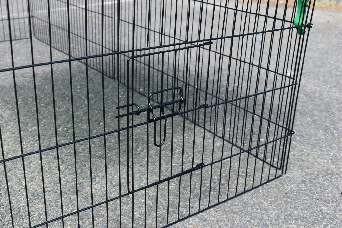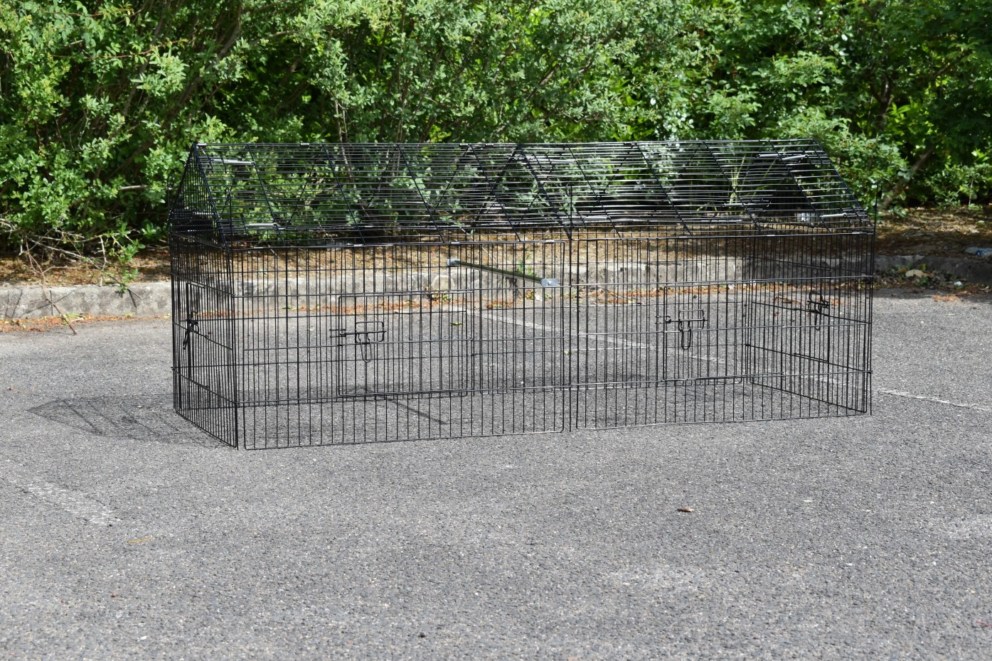 Pointed-roof rabbit enclosure Elynn with sunshade is an enclosure, made of black-powdered steel grating. The rabbit enclosure with sunshade can be used for rabbits, chickens, kittens or puppy's. This enclosure with sunshade is provided with 4 doors in the grating. The enclosure is expandable in many ways, and easily to combine with most chicken coops or rabbit hutches. The side of the run (the steep part) is approx. 50cm high.