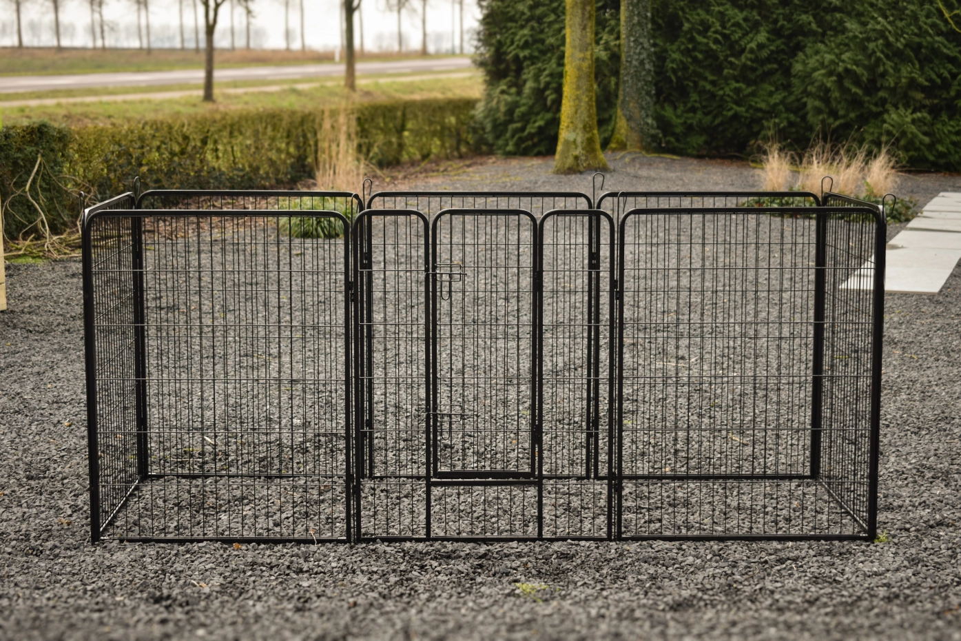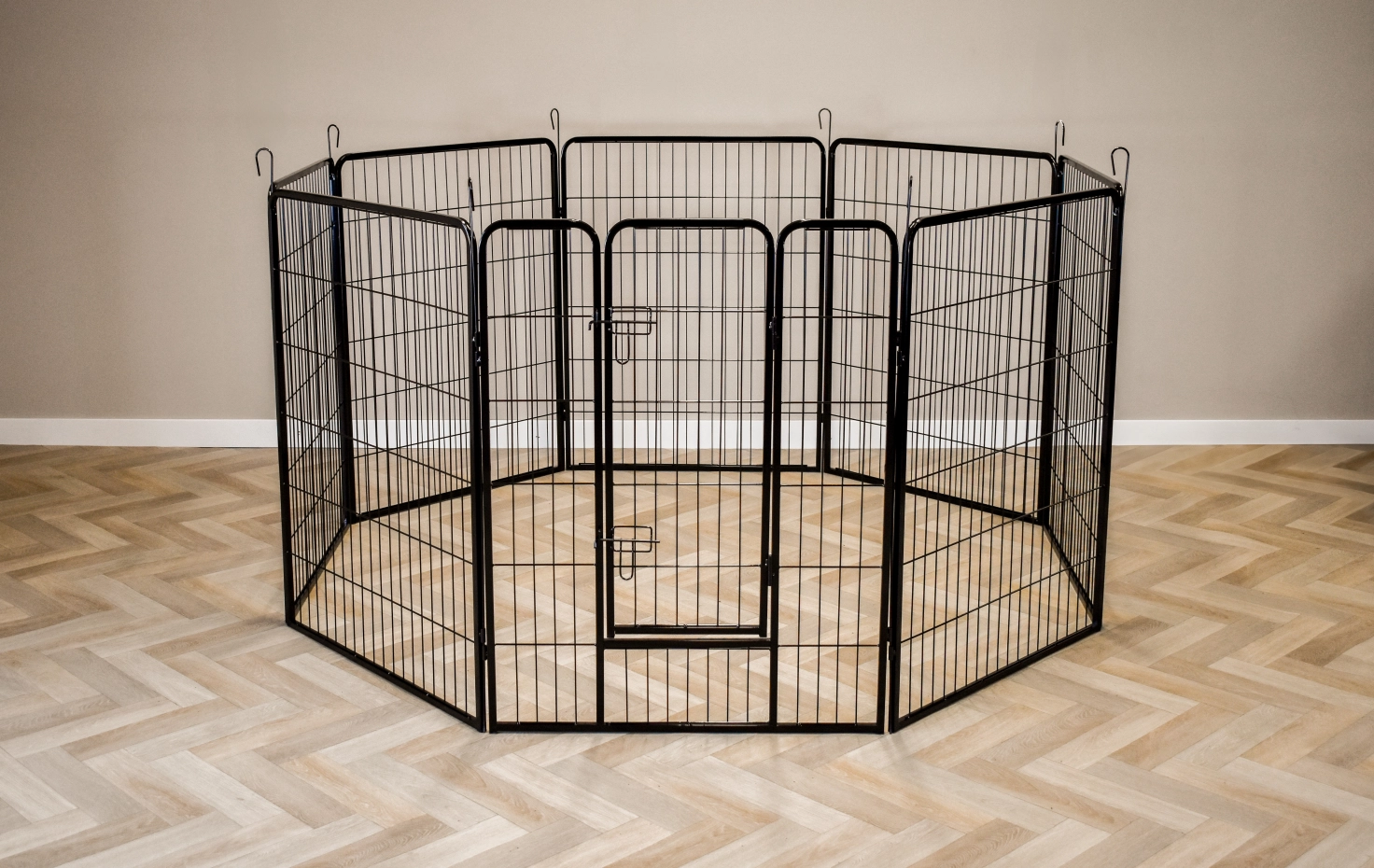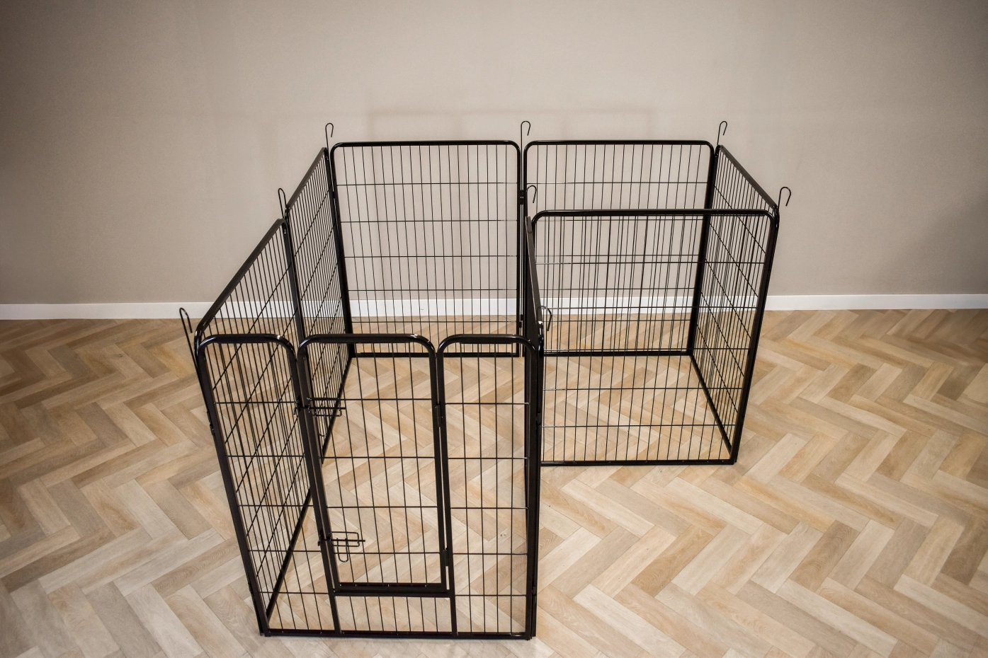 Rabbit enclosure Octa has a height of 100cm. The enclosure is made of powdercoated steel. The enclosure consists en 8 panels of 79x100cm. The run can be used for rabbits, puppy's or other animals.