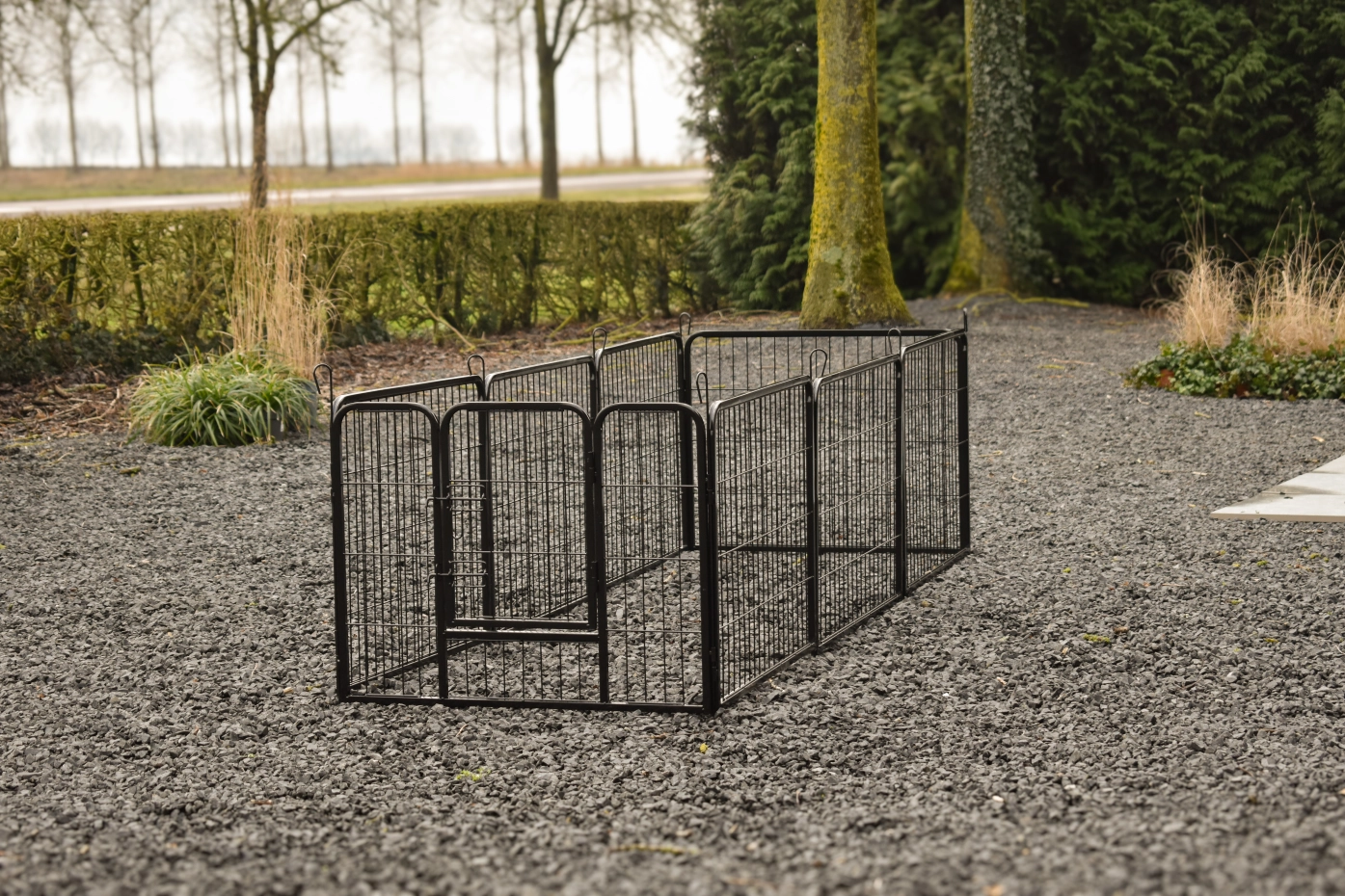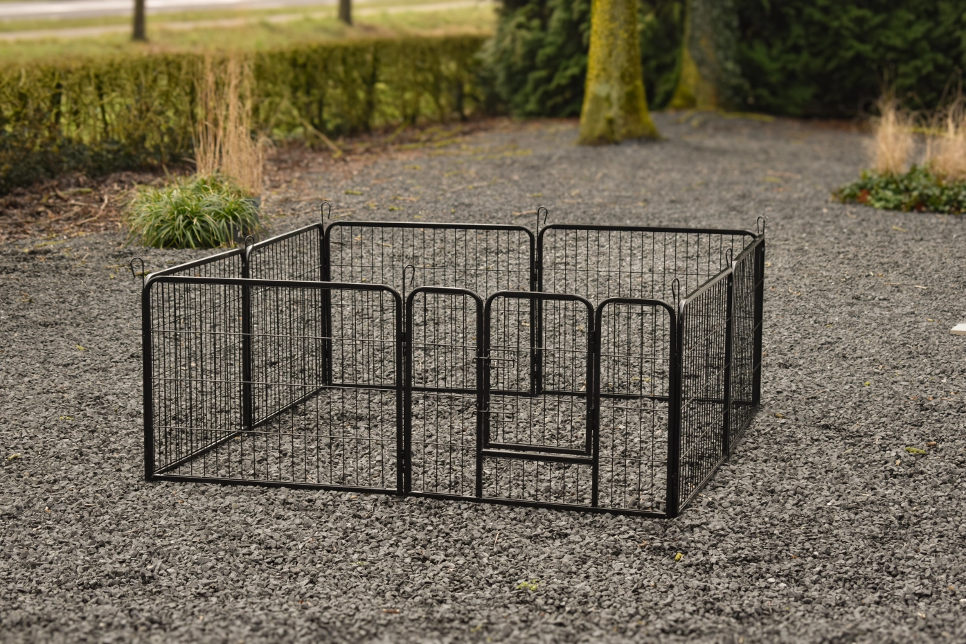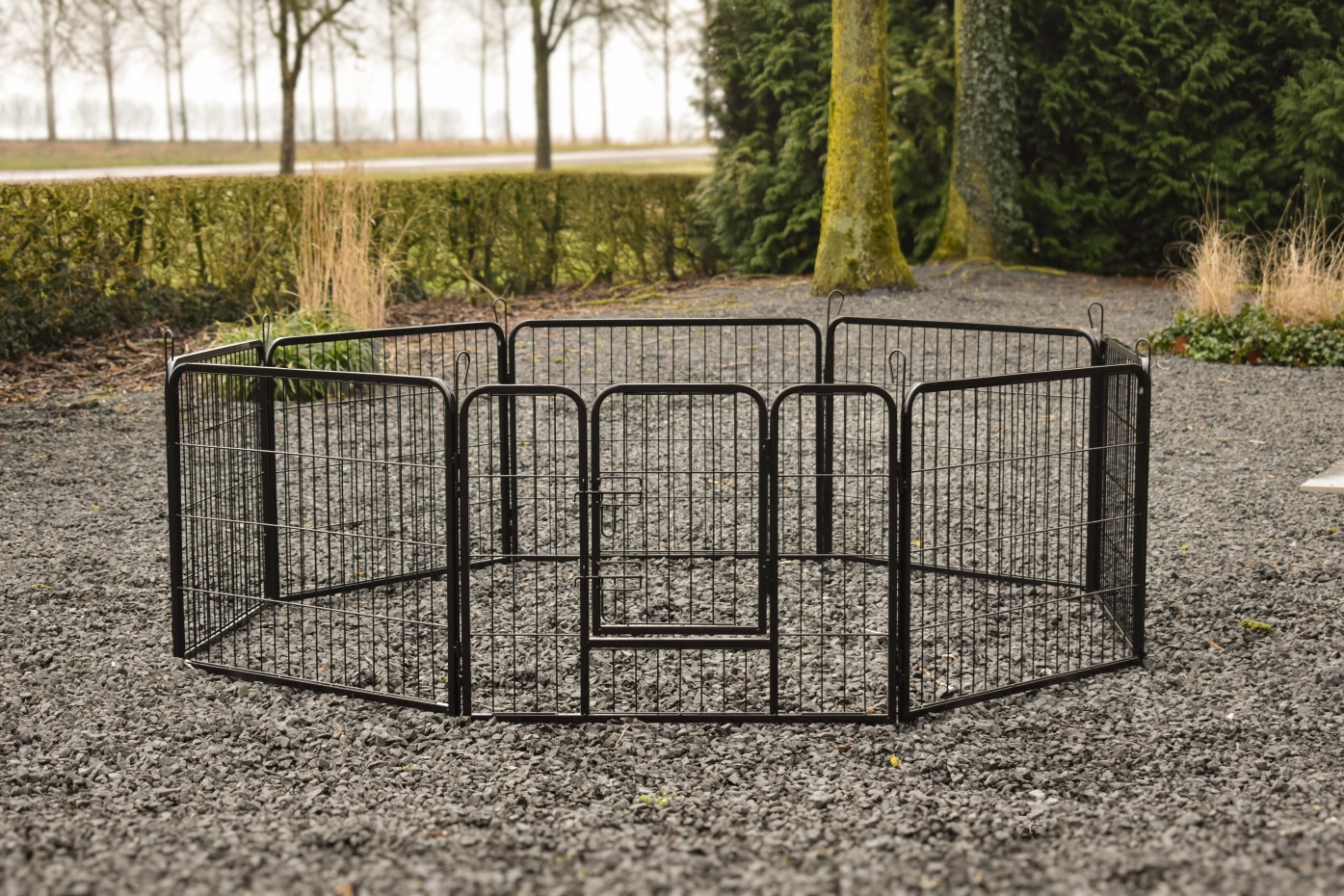 The rabbit run Octa is made of powdercoated steel. The height of the run is 60cm. The run exists of 8 panels of ca. 79x60cm.