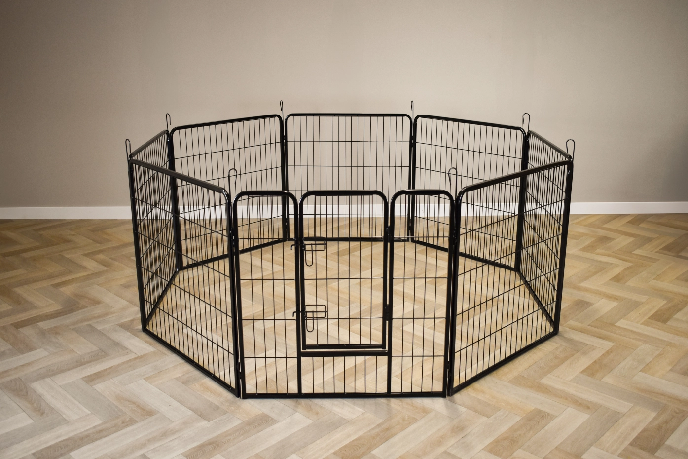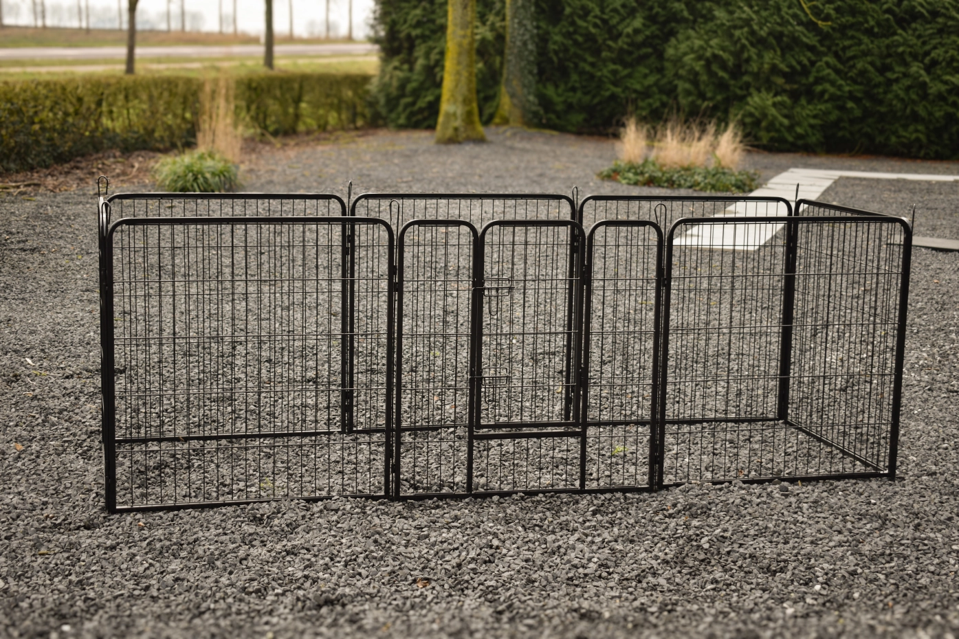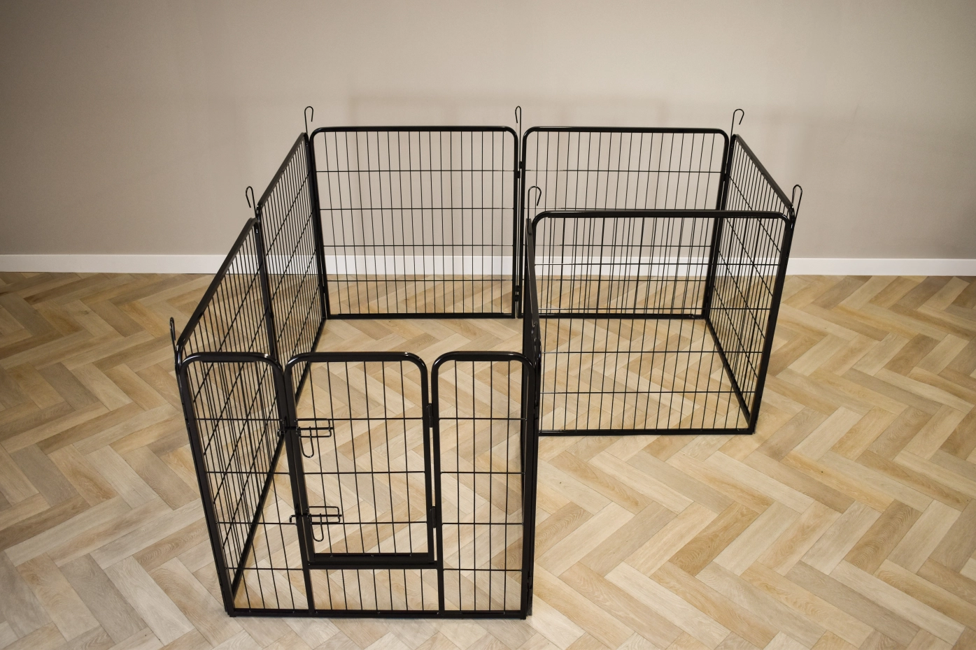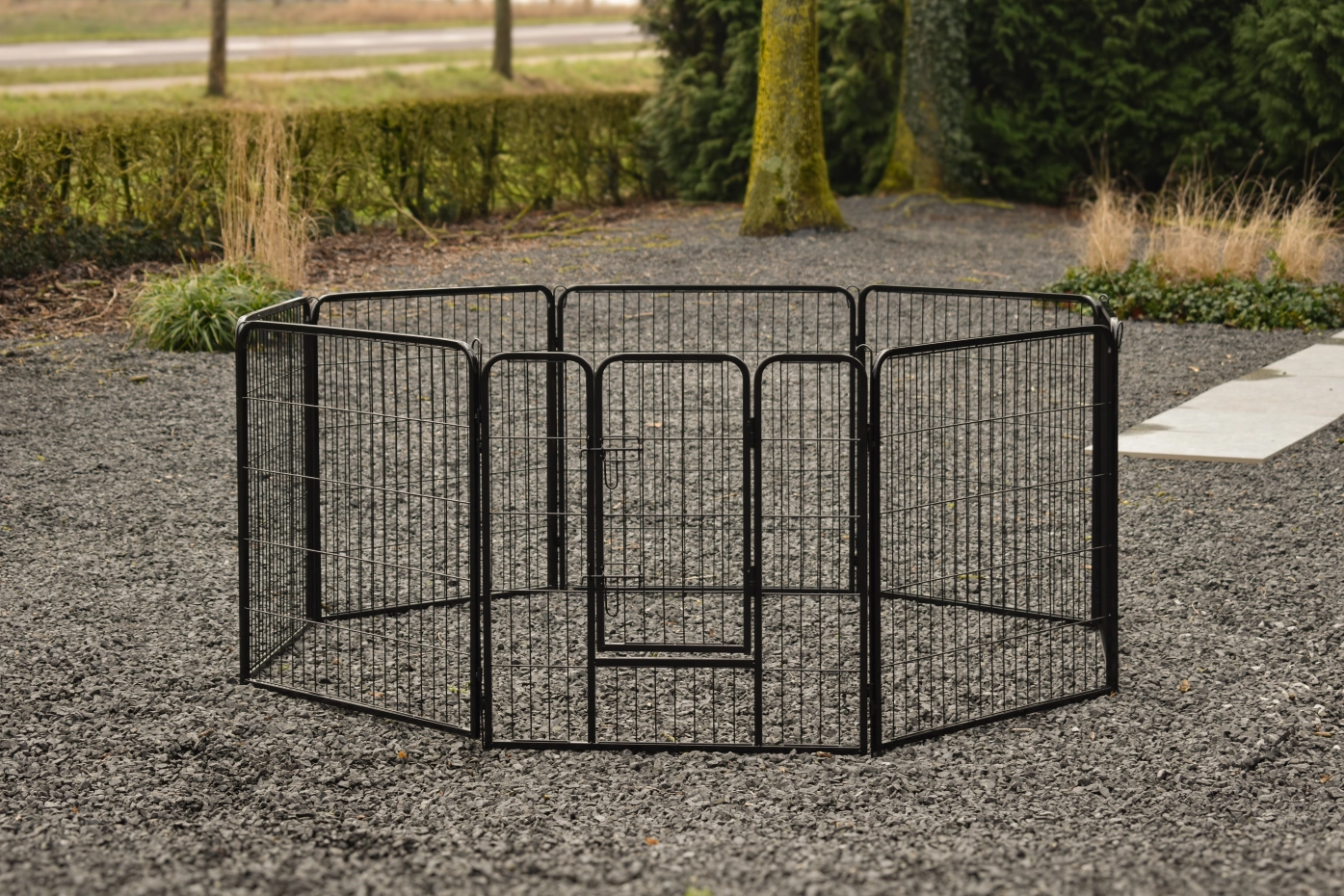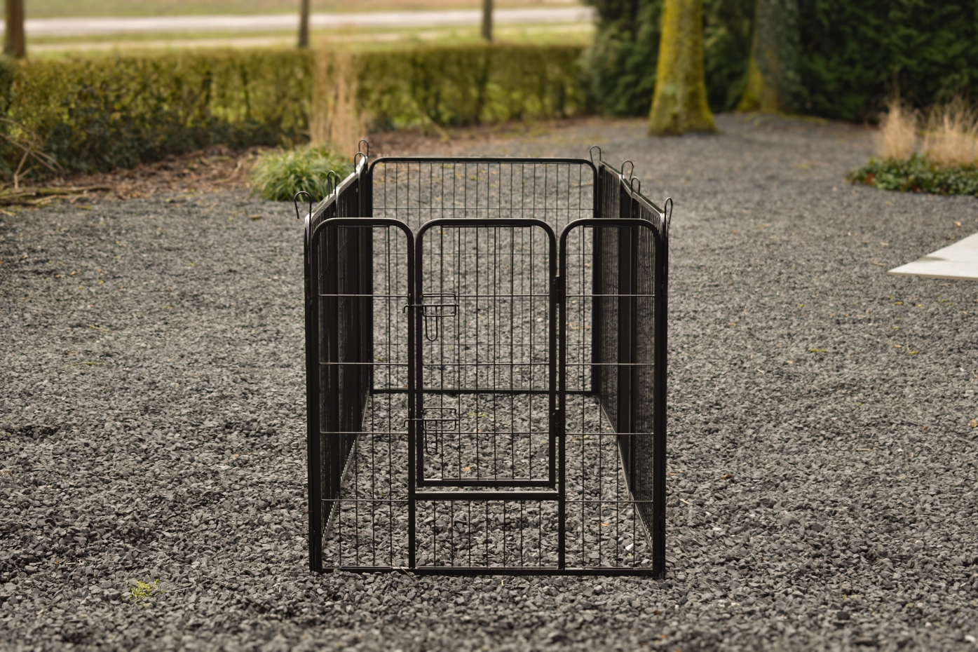 Rabbit enclosure Octa has a height of 80cm. The enclosure is made of powdercoated steel. The enclosure consists en 8 panels of 79x80cm. The run can be used for rabbits, puppy's or other animals.