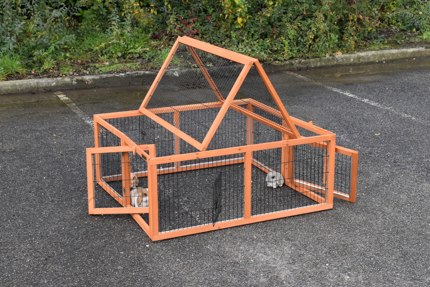 The rabbit run Multirun is equipped with aluminum strips on most edges in the run to prevent gnawing. The rabbit run is fully collapsible and easily connectable to various rabbit hutches. It can also be set up separately from your rabbit hutch. This handy run has 3 doors in the mesh on 3 sides, and 2 sides have removable panels. This allows for combining multiple runs. The top of the rabbit run is also easily foldable and removable. A multifunctional run indeed!